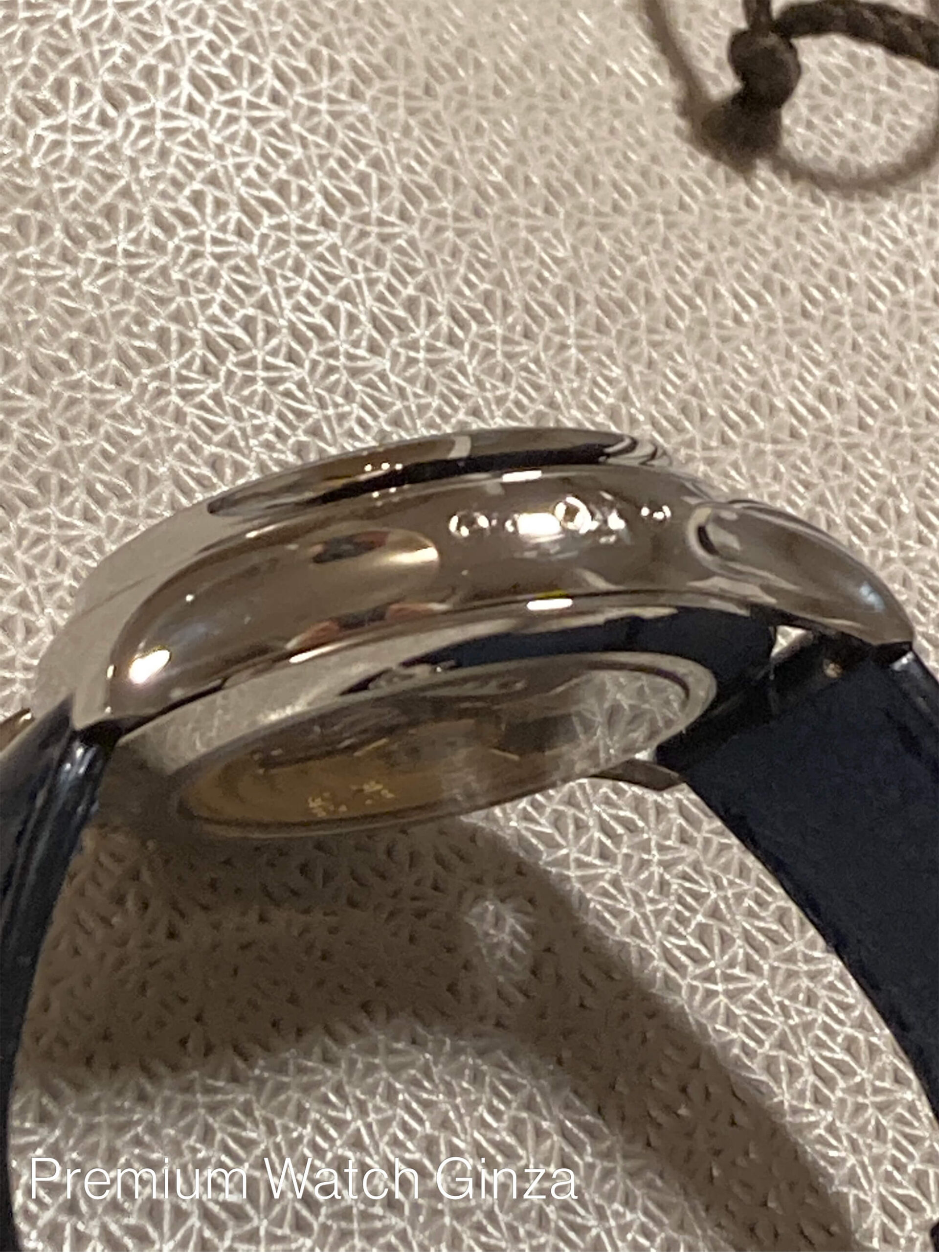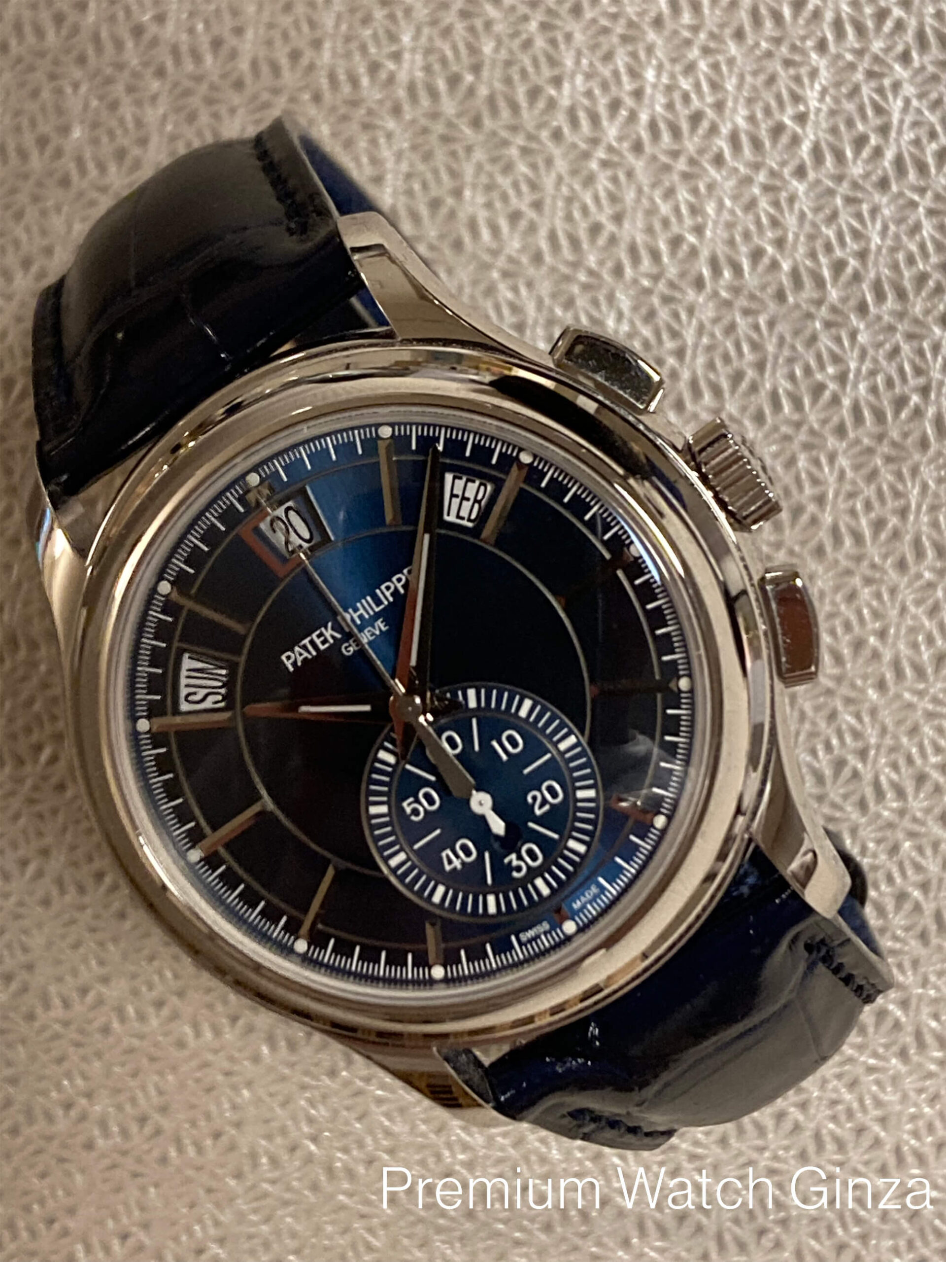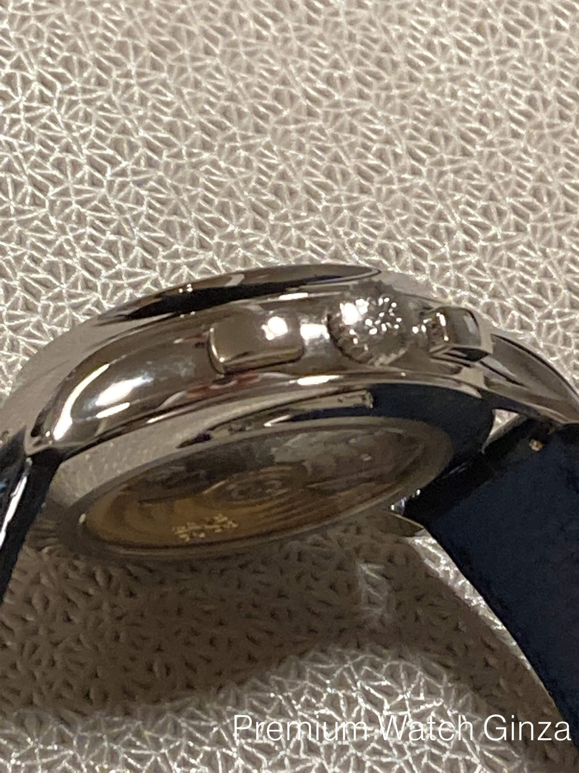 Ref.5905P-001 Annualcalendar Chronograph 2015年に発表された本モデルのルーツは、2006年に初めて発表されたRef.5960モデルでパテック・フィリップでは初となる年次カレンダー搭載クロノグラフモデル。 これまでにないモダンなデザインと同メゾン初となる完全自社製自動巻きクロノグラフムーブメントのデビューモデルとして脚光を浴びた人気モデルでございます。 新世代でモダンなパテック・フィリップのコレクションを象徴するデザインで、ダイヤル上部に弧を描く様に配置された3つのカレンダー表示(曜日・日付・月)は本モデルから全て立体的なフレームの窓枠へと変更され、時分針はスポーティ表情に合わせて形状も変更されております。 カレンダーの窓枠・時分針・アワーインデックス・外周クロノグラフスケールはいづれも18金の酸化ブラック仕上げと非常に凝った仕上げでブルーサンバースト仕上げの艶感のある文字盤をお楽しみいただけます。 一見スポーティなルックスでございますが、パテック・フィリップの高度な仕上がりによりスポーティさと高級感の両方を併せ持ったモデルでございます。 「年次カレンダー」、「フライバック・クロノグラフ(クロノグラフ秒針をセンターセコンドのように常に動作が可能)」、「デイナイト表示」と日常使いに適したコンプリケーションモデルというだけでなく、本モデル独自の意匠としてパテックフリップの外装技術で、グランドコンプリケーションのみに特に多く採用されるオープンワークをケーサイドに施した特別仕様のモデルでございます。 ケース製作において冷間鍛造を採用する同メゾンにおいても貴金属の中で最も硬度の高いプラチナを極めて美しく仕上げる形成技術は外装技術の真髄を極めた同メゾンでしか堪能できない贅沢なモデルでございます。 |