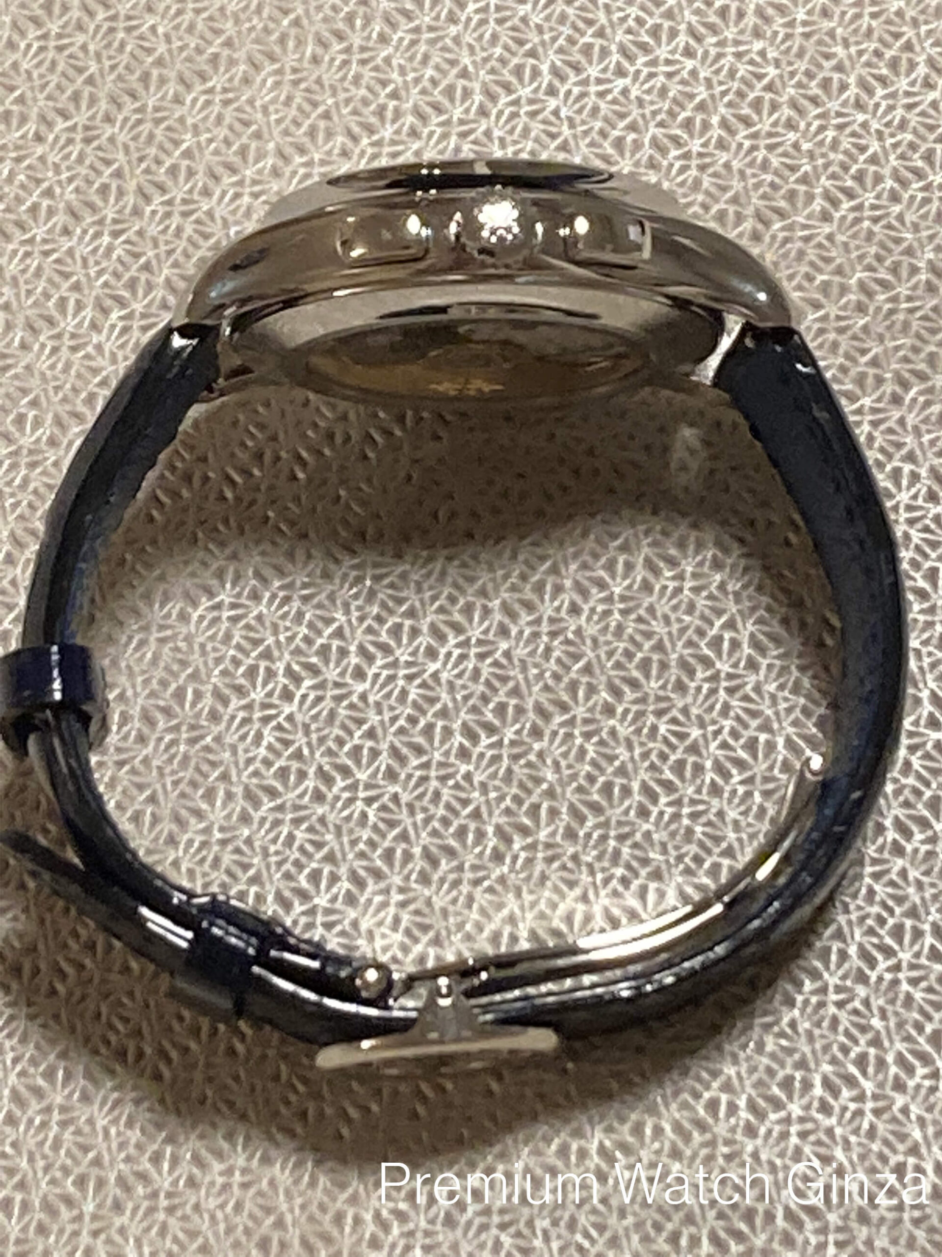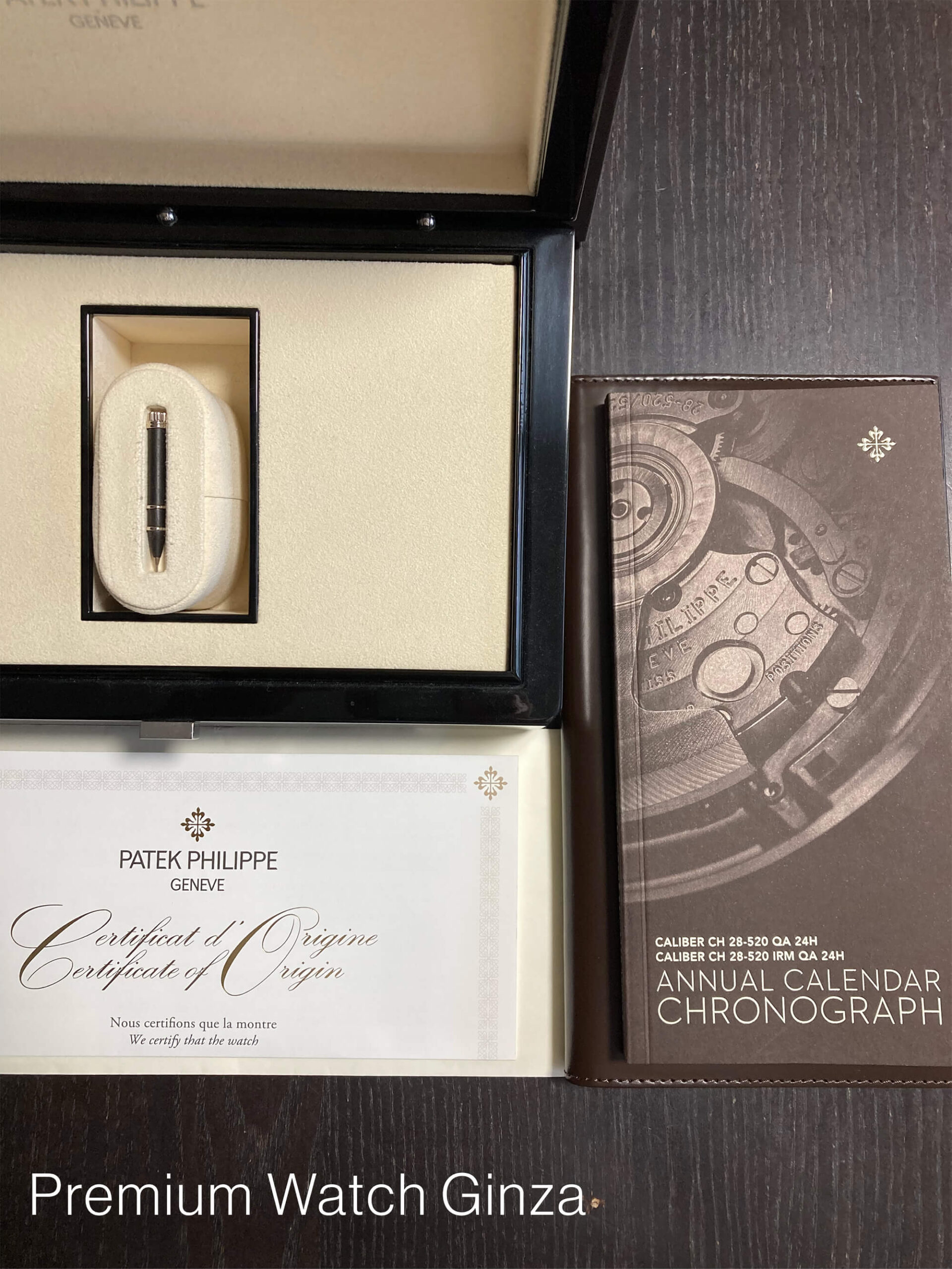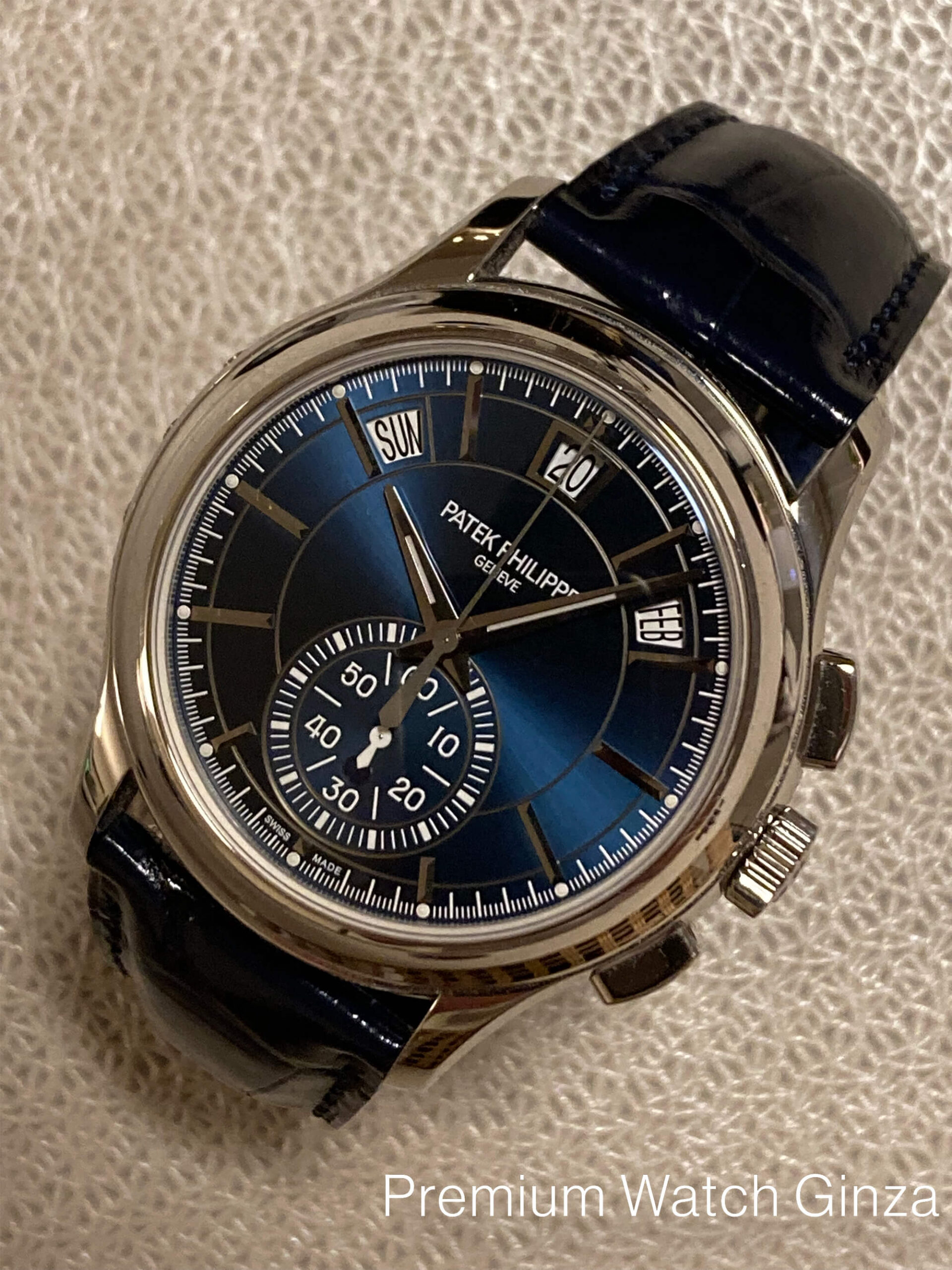 Ref.5905P-001 Annualcalendar Chronograph 2015年に発表された本モデルのルーツは、2006年に初めて発表されたRef.5960モデルでパテック・フィリップでは初となる年次カレンダー搭載クロノグラフモデル。 これまでにないモダンなデザインと同メゾン初となる完全自社製自動巻きクロノグラフムーブメントのデビューモデルとして脚光を浴びた人気モデルでございます。 新世代でモダンなパテック・フィリップのコレクションを象徴するデザインで、ダイヤル上部に弧を描く様に配置された3つのカレンダー表示(曜日・日付・月)は本モデルから全て立体的なフレームの窓枠へと変更され、時分針はスポーティ表情に合わせて形状も変更されております。 カレンダーの窓枠・時分針・アワーインデックス・外周クロノグラフスケールはいづれも18金の酸化ブラック仕上げと非常に凝った仕上げでブルーサンバースト仕上げの艶感のある文字盤をお楽しみいただけます。 一見スポーティなルックスでございますが、パテック・フィリップの高度な仕上がりによりスポーティさと高級感の両方を併せ持ったモデルでございます。 「年次カレンダー」、「フライバック・クロノグラフ(クロノグラフ秒針をセンターセコンドのように常に動作が可能)」、「デイナイト表示」と日常使いに適したコンプリケーションモデルというだけでなく、本モデル独自の意匠としてパテックフリップの外装技術で、グランドコンプリケーションのみに特に多く採用されるオープンワークをケーサイドに施した特別仕様のモデルでございます。 ケース製作において冷間鍛造を採用する同メゾンにおいても貴金属の中で最も硬度の高いプラチナを極めて美しく仕上げる形成技術は外装技術の真髄を極めた同メゾンでしか堪能できない贅沢なモデルでございます。 |