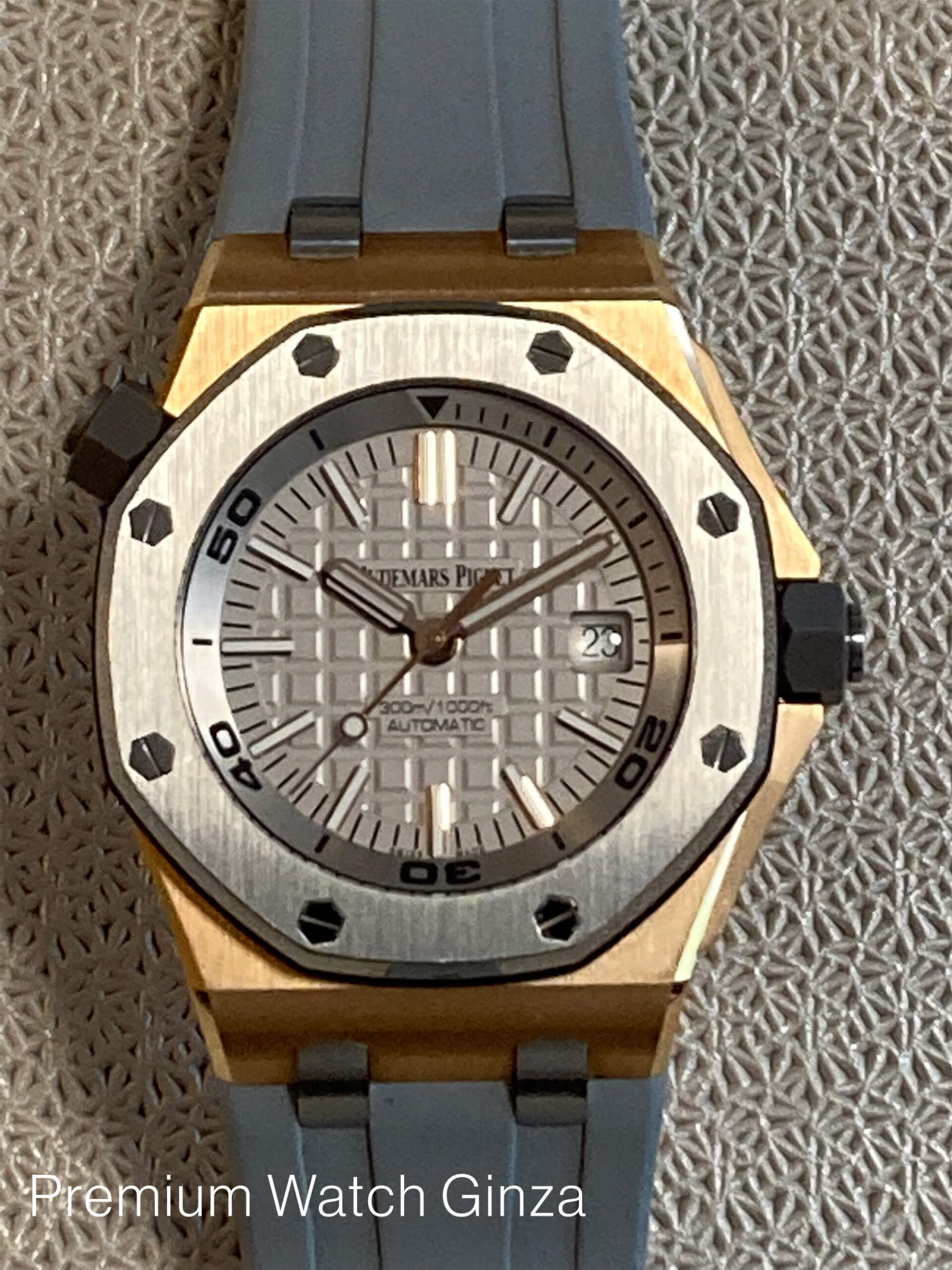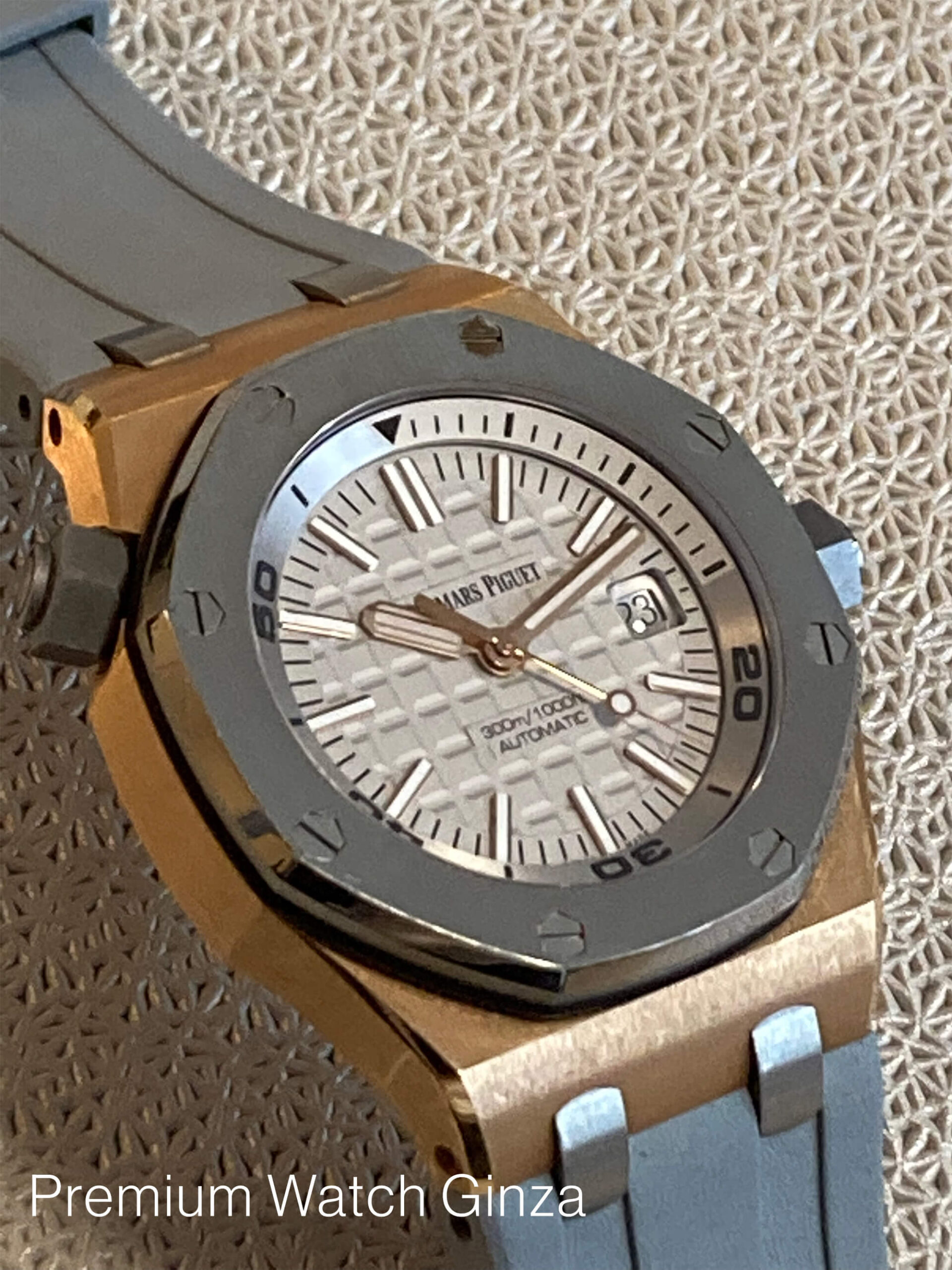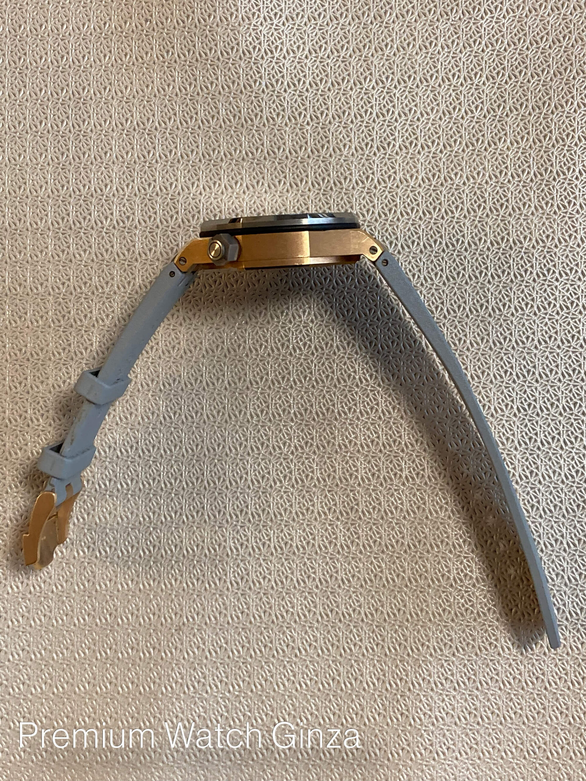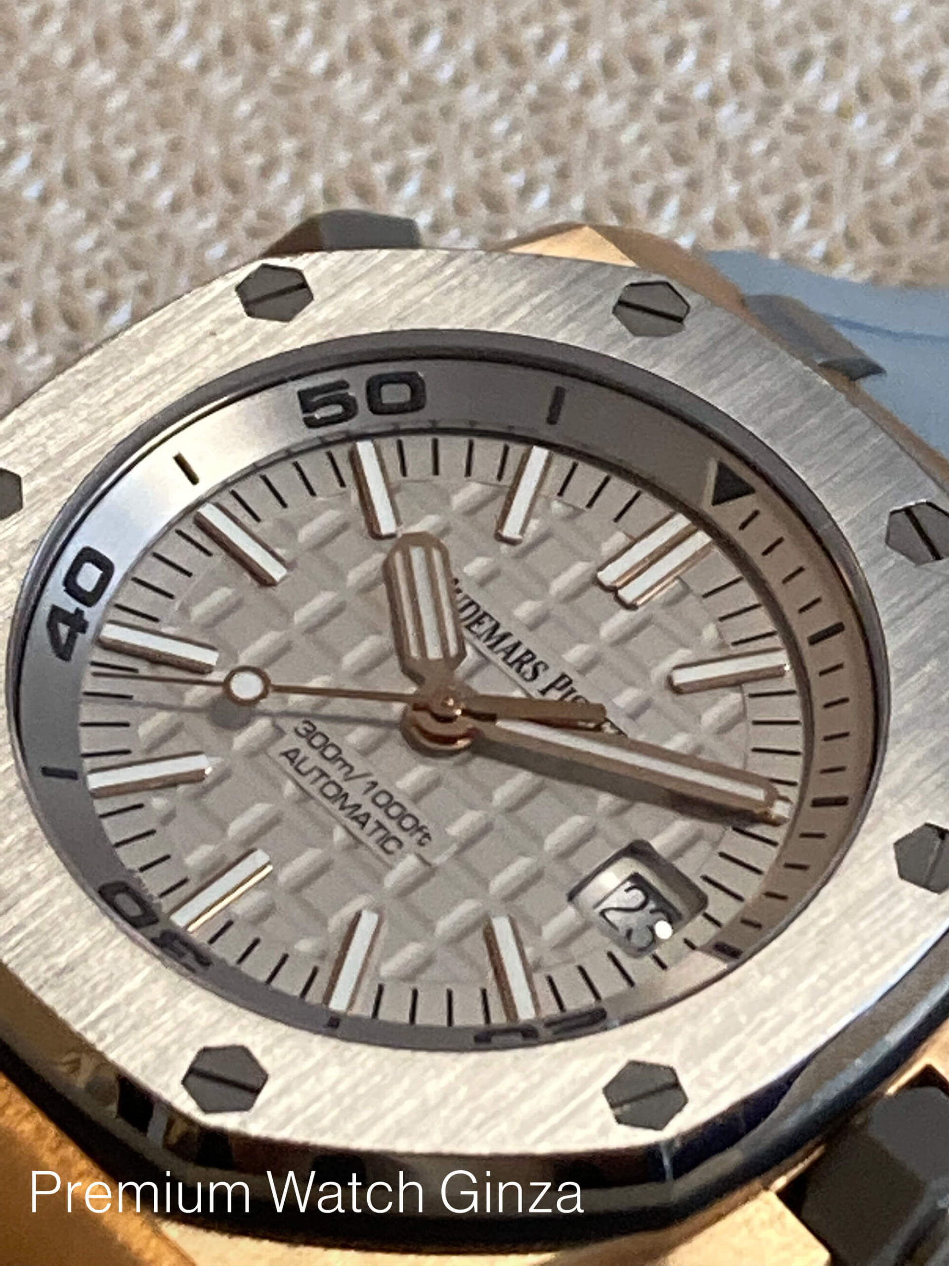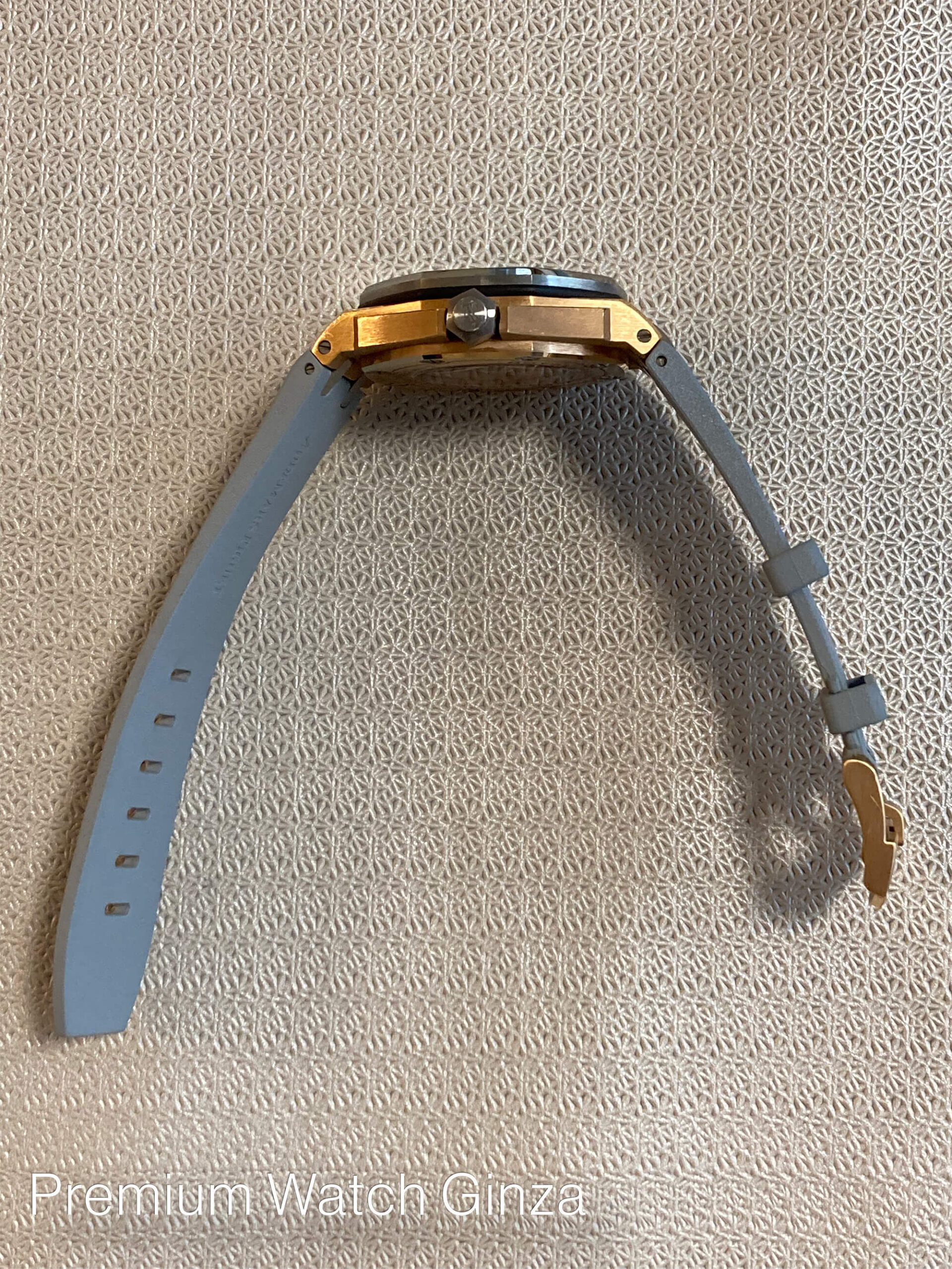 Ref.15711OI.OO.A006CA.01 Royal Oak OFFSHORE DIVER Btq Ltd 「ロイヤルオーク・オフショア」をより強固なシリーズとする為、2006年には防水性を高めインナーベゼルを採用したダイバーズモデルの「ロイヤルオーク・オフショア・スクーバ」が誕生致しました。 ブティック限定モデルとして取扱いが開始された「オフショア・スクーバ」を足掛かりに針・インデックスのダイヤルデザインを変更し、耐磁インナーケースを採用し更なる進化を遂げ発表されたモデルが2010年に発表された「ロイヤルオーク・オフショア・ダイバー」でございます。 レギュラーモデルとして発表されて以降主要マイナーチェンジやバリエーションを増やし同メゾンのコレクションのなかでも高い人気を誇ります。 今回ご紹介致します「Ref.15711OI.OO.A006CA.01」はピンクゴールドとチタンの組み合わせが目を引くブティック限定500本のモデルで2018年のSIHHにて発表されました。 これまでに(ステンレス・スティール、タンタル、セラミック、フォージド・カーボン)をケース素材に採用してきた「ロイヤルオーク・オフショア・ダイバー」シリーズに初めてゴール素材が採用されたモデルでもございます。 本モデルの美的特徴はピンクゴールドとチタンのカラーリングの妙で、中間色のグレーを「ベゼル・ダイヤル・リューズ・ブレスレット」に配し、華やかなピンクゴールドケースと掛け合わせる事でスポーティなモデルですが上品な印象も兼ね備えたモデルに仕上げております。 こういった中間色のカラーリングは過去のモデルにもみられ、遡りますとリオネル・メッシ限定モデル(PG×タンタル)、シューマッハモデル限定モデル(PG×サーメット)、等いずれも素材やベースモデルは異なりますが各モデルとも限定モデルで採用されている特別なカラーコンビネーションでございます。 オーデマ・ピゲの時計に共通するのは外装仕上げの美しさがあげられます。 |