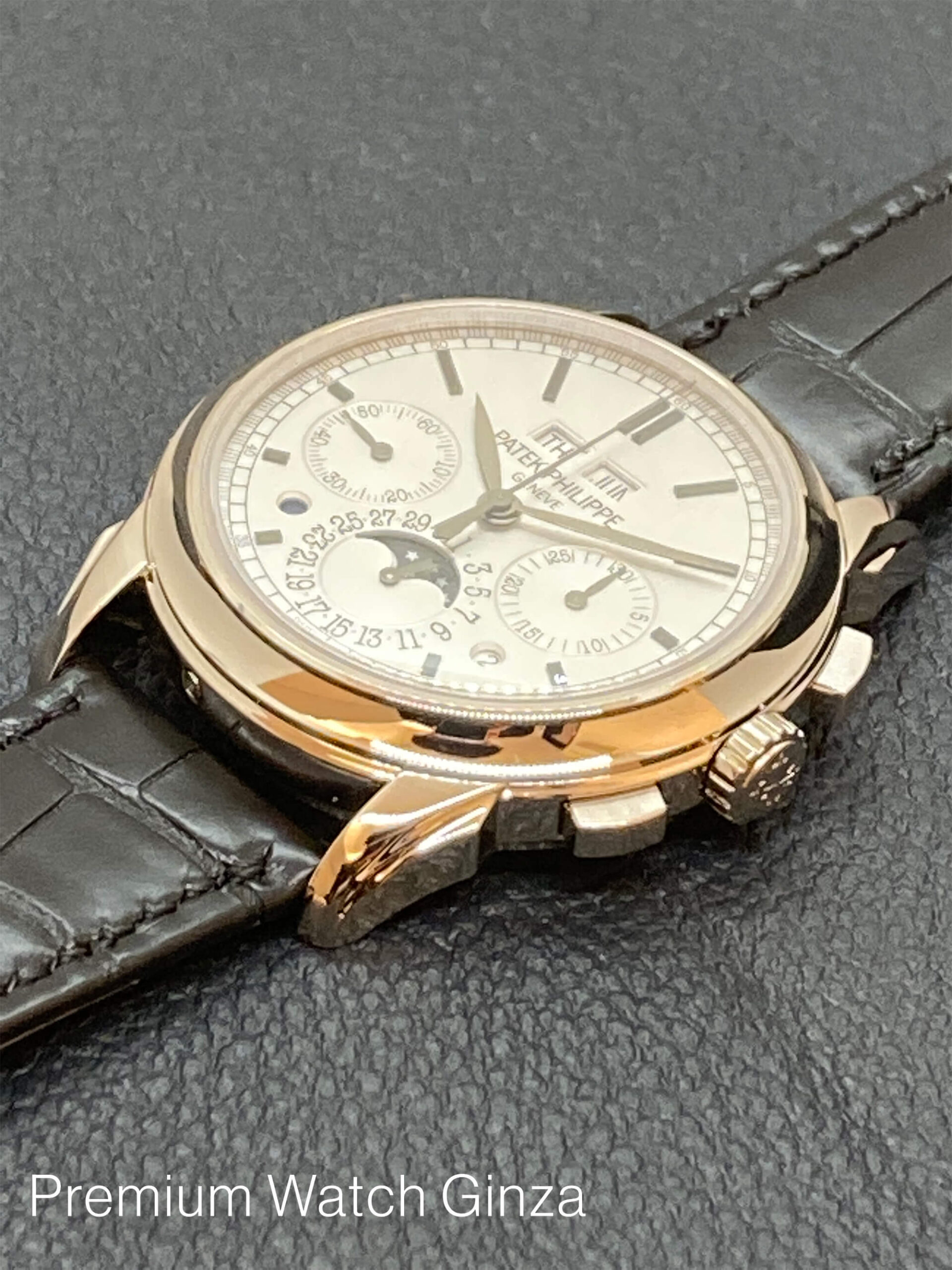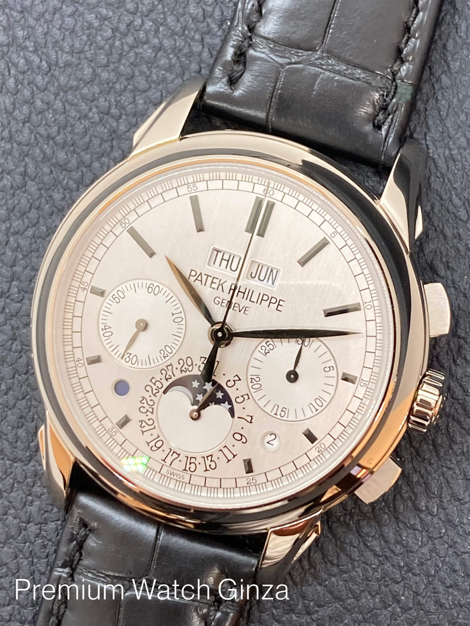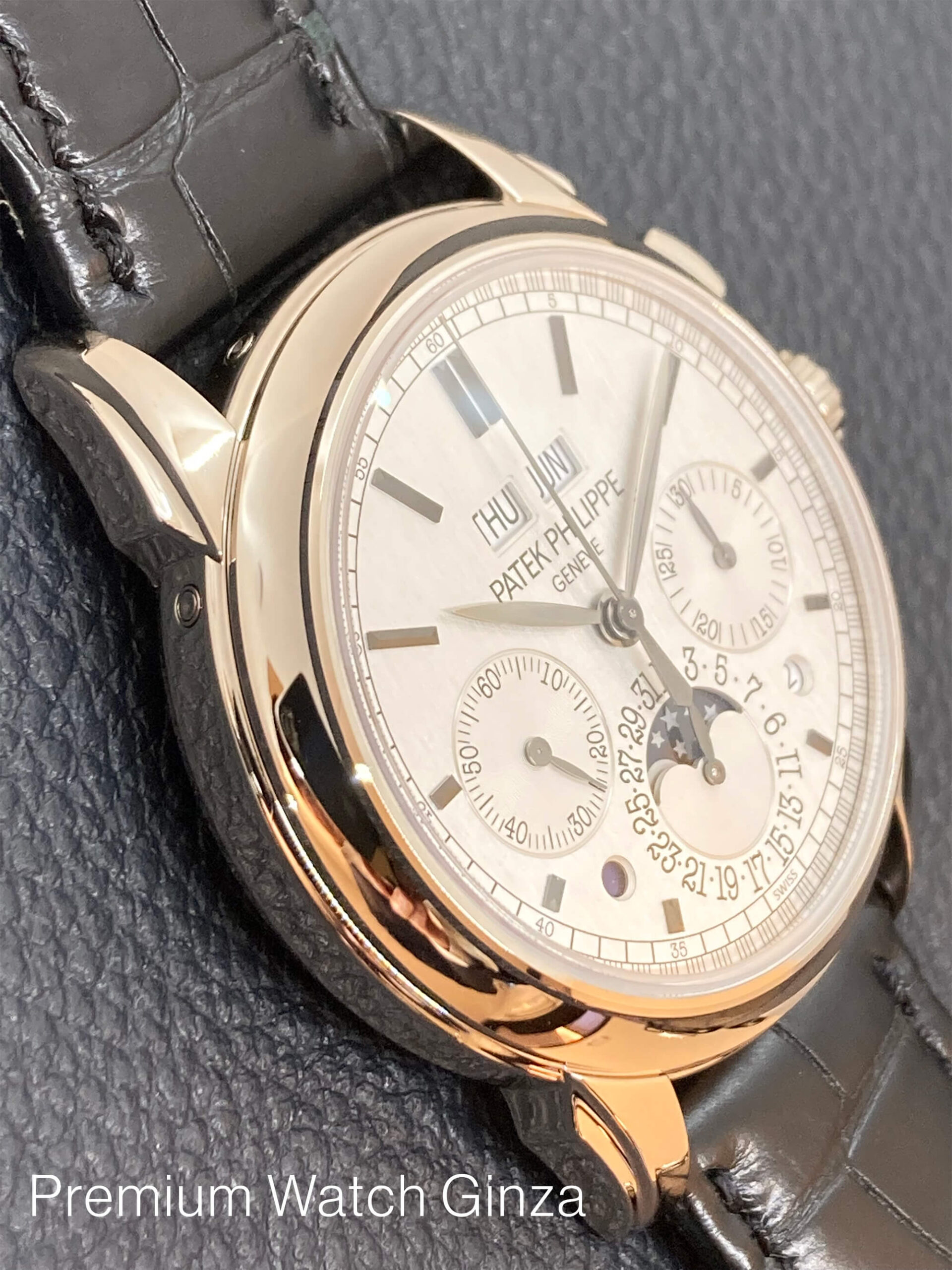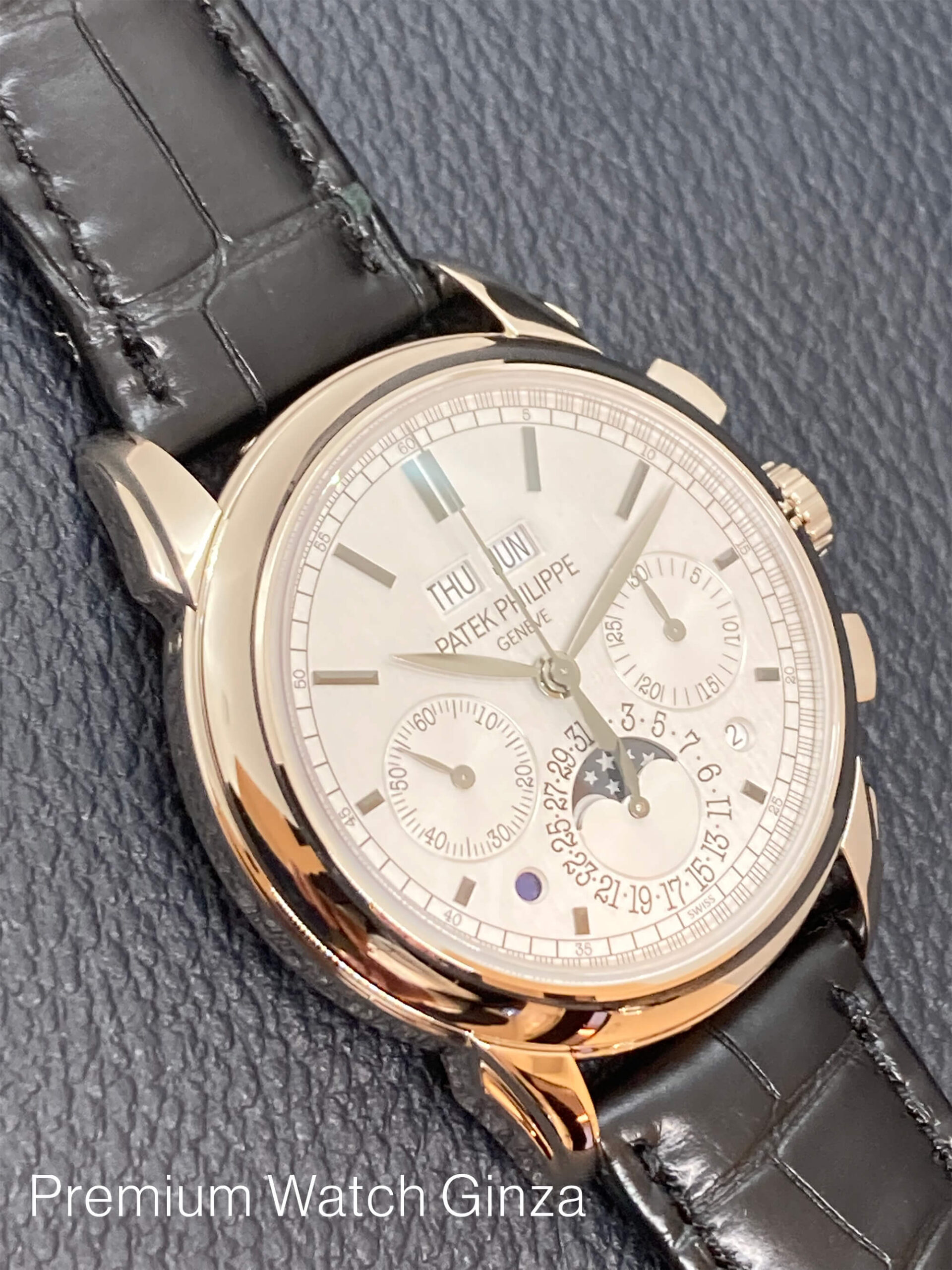 Ref.5270G-001 Grand Complication Perpetualcalendar Chronograph パテック・フィリップの花形モデルと位置付けられる永久カレンダー・クロノグラフ。 この度ご紹介致しますRef.5270G-001は同社で最も得意とするグランドコンプリケーションで、2011年に発表されたモデルでございますが、現在は生産終了になっております。 文字盤がレイルウェイ表示の第1世代モデルでございまして、第2世代からは、 タキメーターに変更されて色も第1世代はシルバーグレーの様なカラーで、非常に艶が有り色気の有る文字盤でございます。 ちなみに今年発表されたばかりのRef.5270Pもこの第1世代と同じレイルウェイ表示のグリーン文字盤でございます。 歴代の永久カレンダークロノグラフは、Ref.1518、2499、3970、5970という系譜を経て、完全自社開発ムーヴメントとして誕生したのが、本モデルでございますが、 クロノグラフの制御やストップセコンドを搭載する等、性能は進化させております。 ムーヴメントだけでなく、ケースやラグの外装技術の卓越した匠の意匠によりシェイプされた形状の美しさは改めて最高峰の佇まいでございます。 |