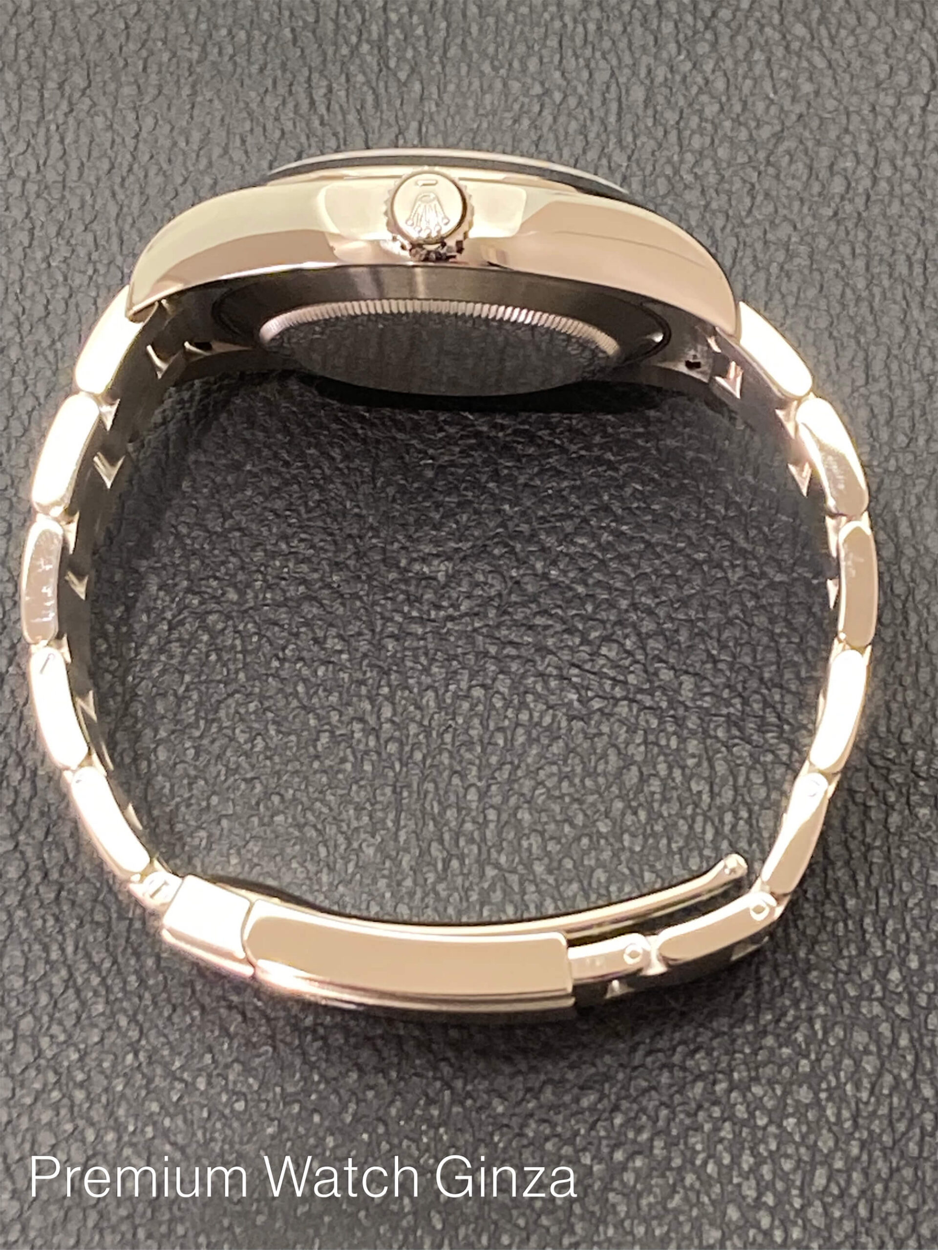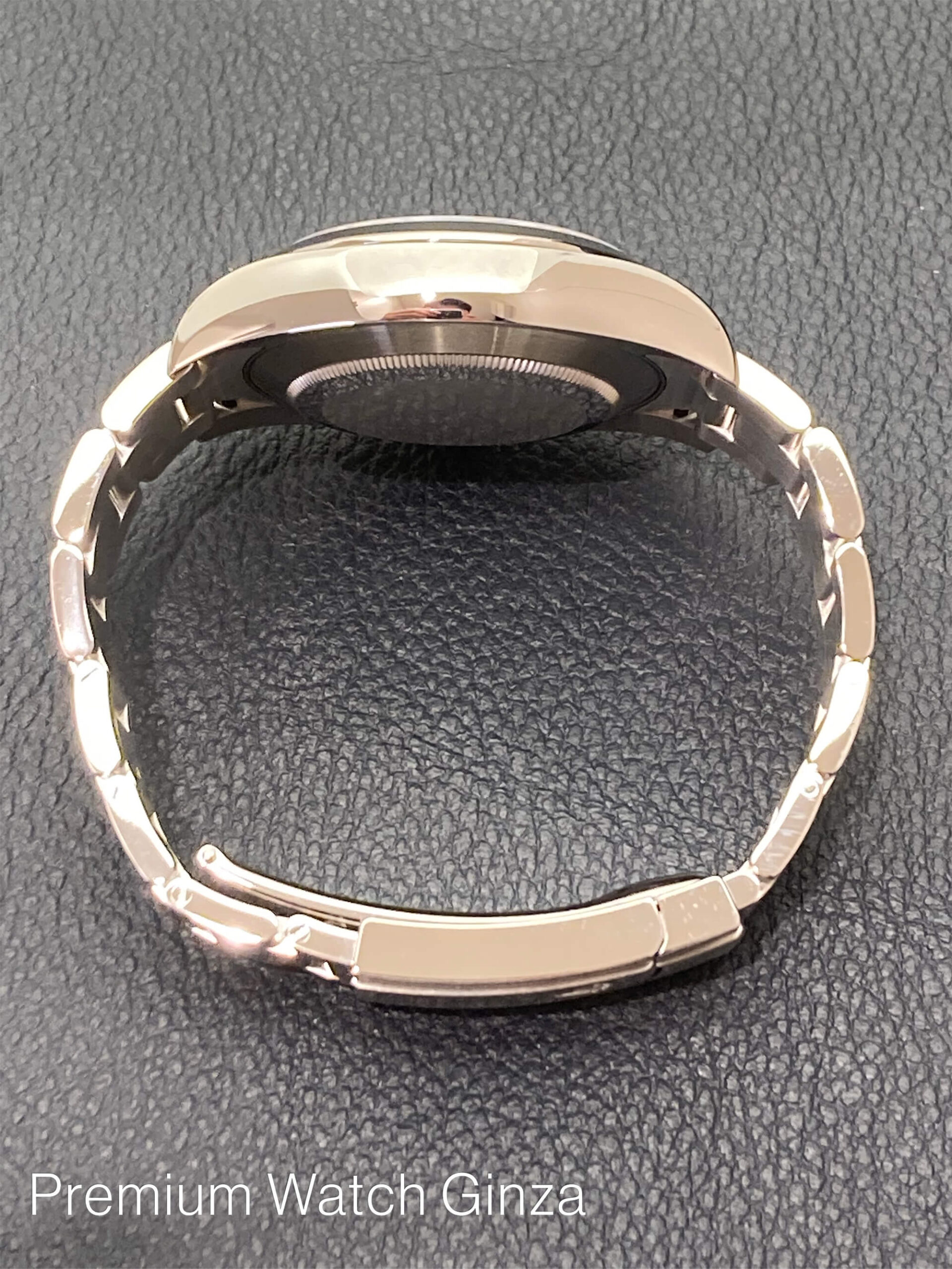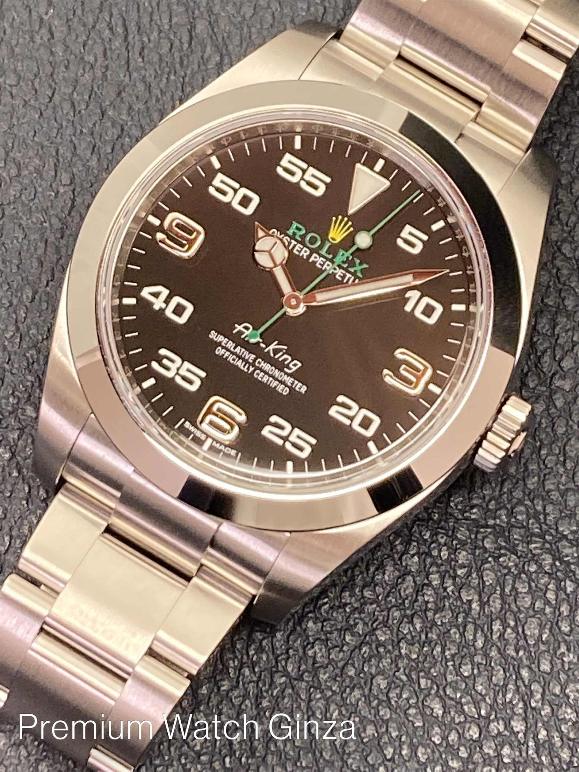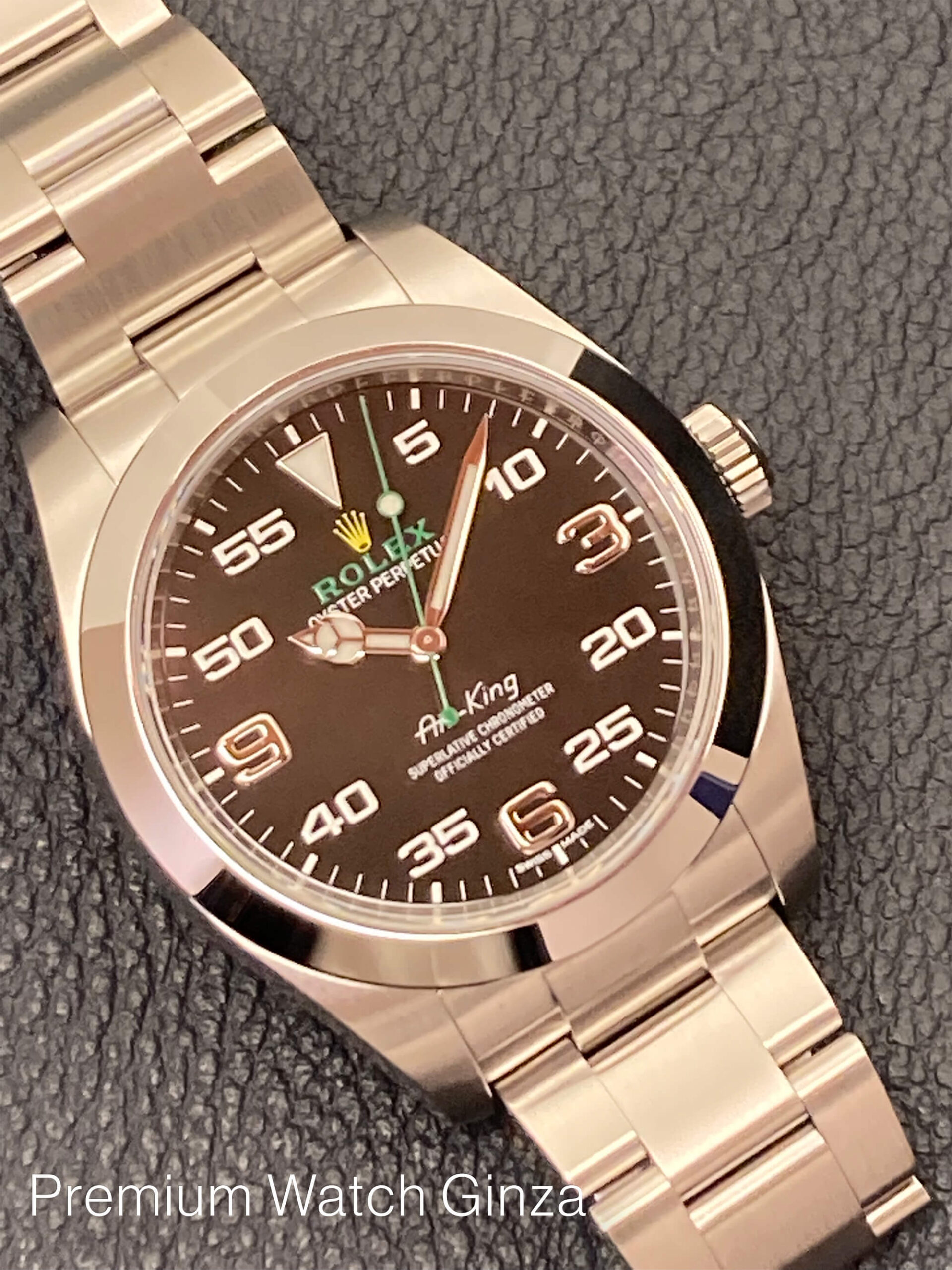 Ref.116900 「エアキング」 飛行家へのオマージュとして1950年代に製作されていたモデルの現代モデルで、仕様は視認性に特化した文字盤と耐磁性能を兼備して実用度を格段にアップさせた優れたモデルでございます。 文字盤は伝統的な369に5分刻みで独自デザインのミニッツトラックを採用した仕様になっております。 |