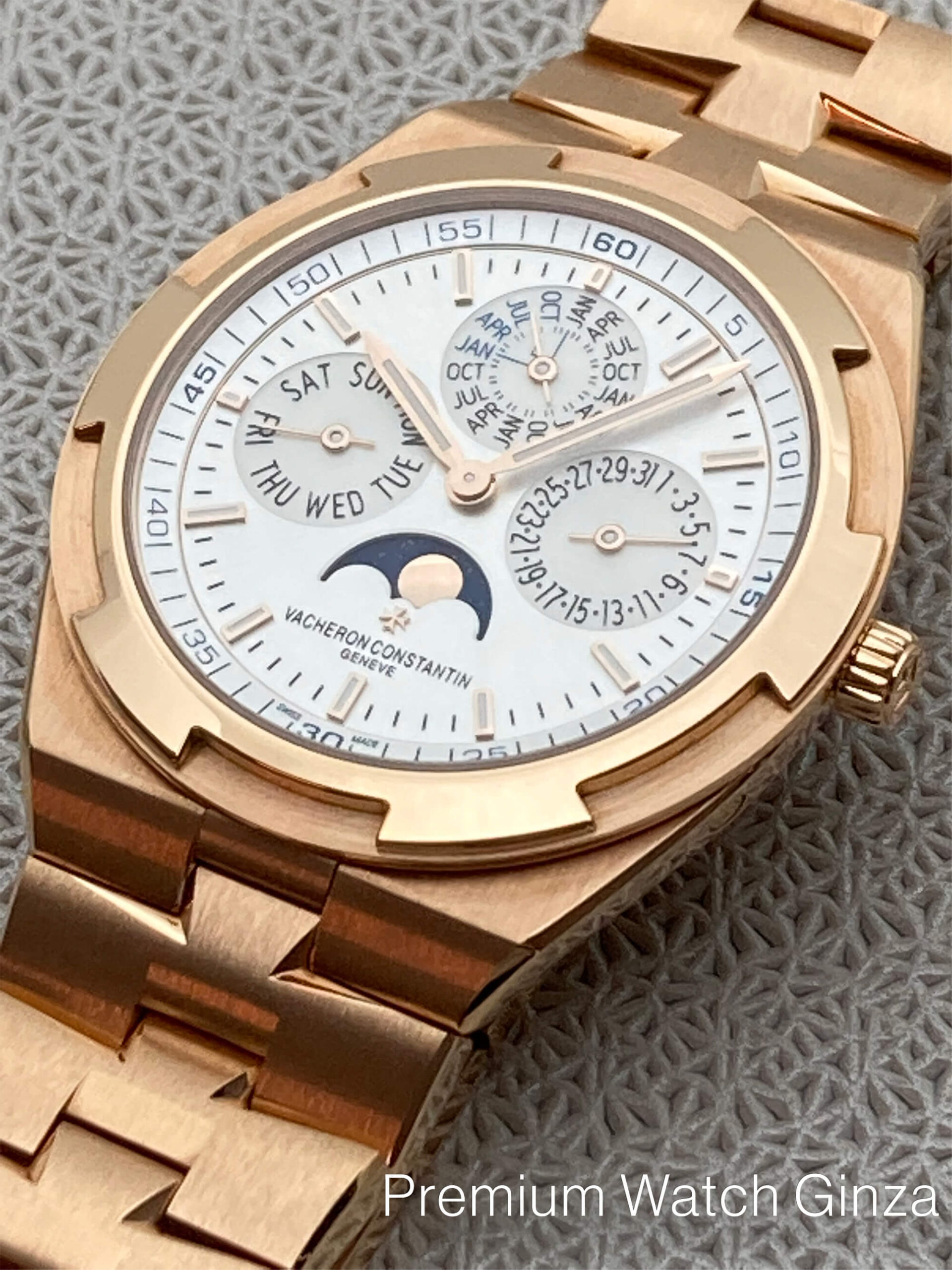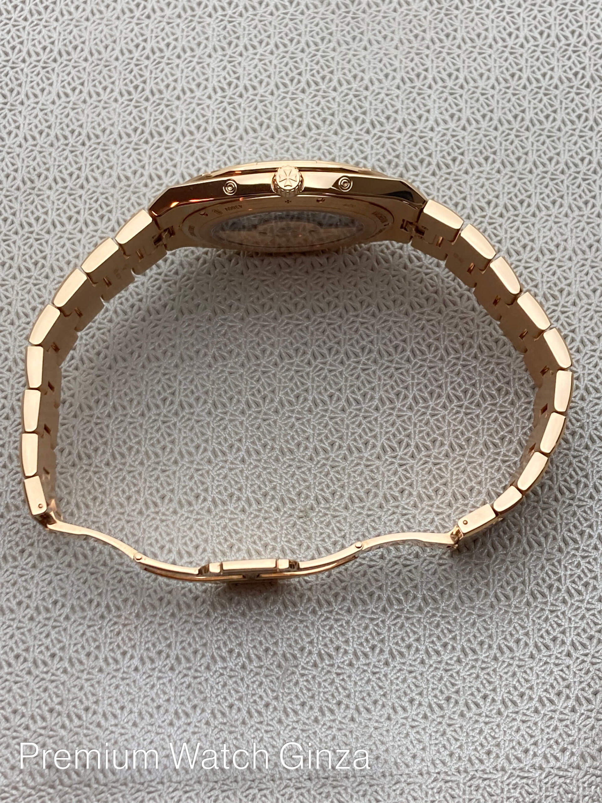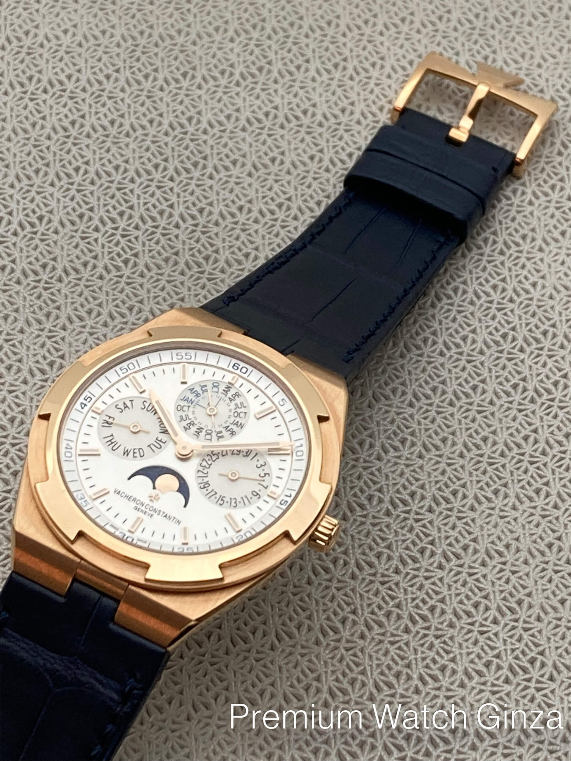 Ref.4300V/120R-B064 Overseas Perpetual Calendar Ultra-thin 2016年に発表された本モデルの第3世代コレクションで革新で画期的なインターチェンジャブルシステムにより、 3種類のブレスレット及び2種類のストラップをTPOに合わせて自由自在に付け替えが所有するオーナー自身で極めて簡単な作業で可能になり、より若年層も含めた多くの支持を得ました。 そのオーヴァーシーズコレクションに2017年に追加発表された自社設計生産のcal.1120QP/1が搭載されておりますが、 センターローター自動巻きの極薄4.05mmは永らく時計界を代表する最高峰基幹ムーブメントとして、有名な名機でございますが、 この度のモデルは永久カレンダーモジュールを組み込んだ超複雑機構のムーブメントを搭載するだけでなく、 オーヴァーシーズのスポーティな外装部を損なわずに5気圧という防水性も確保して、ケース厚さ8.1mmを実現した類稀な技術は驚嘆に値致します。 ノーチラスRef.5740/1Gでケース厚8.42mmでございますので、よりこの数値は際立っております。 生産本数は極めて少なく、全く流通されておりませんので、この逸品をご所有されている方は非常に幸運でしょう。 |