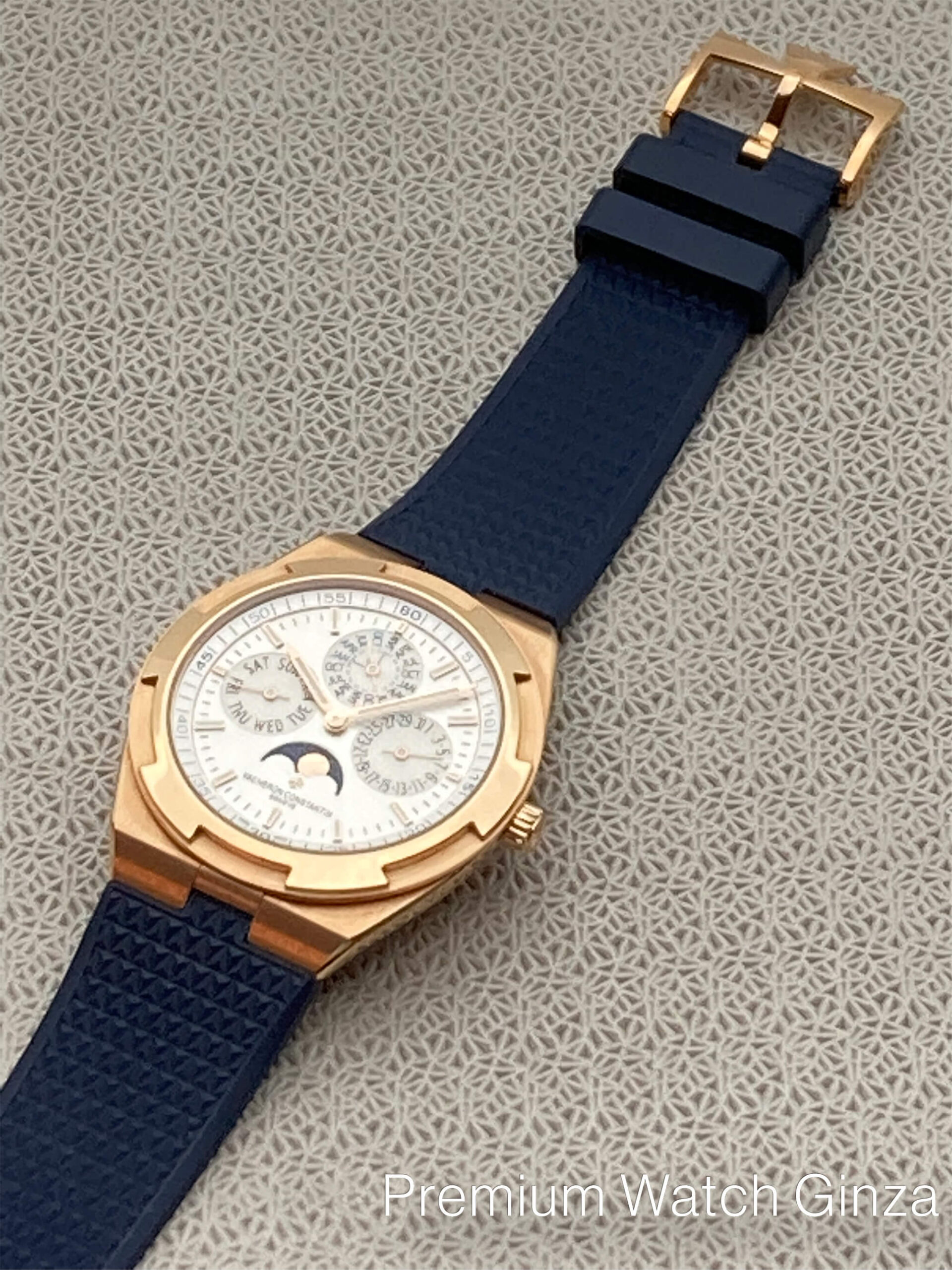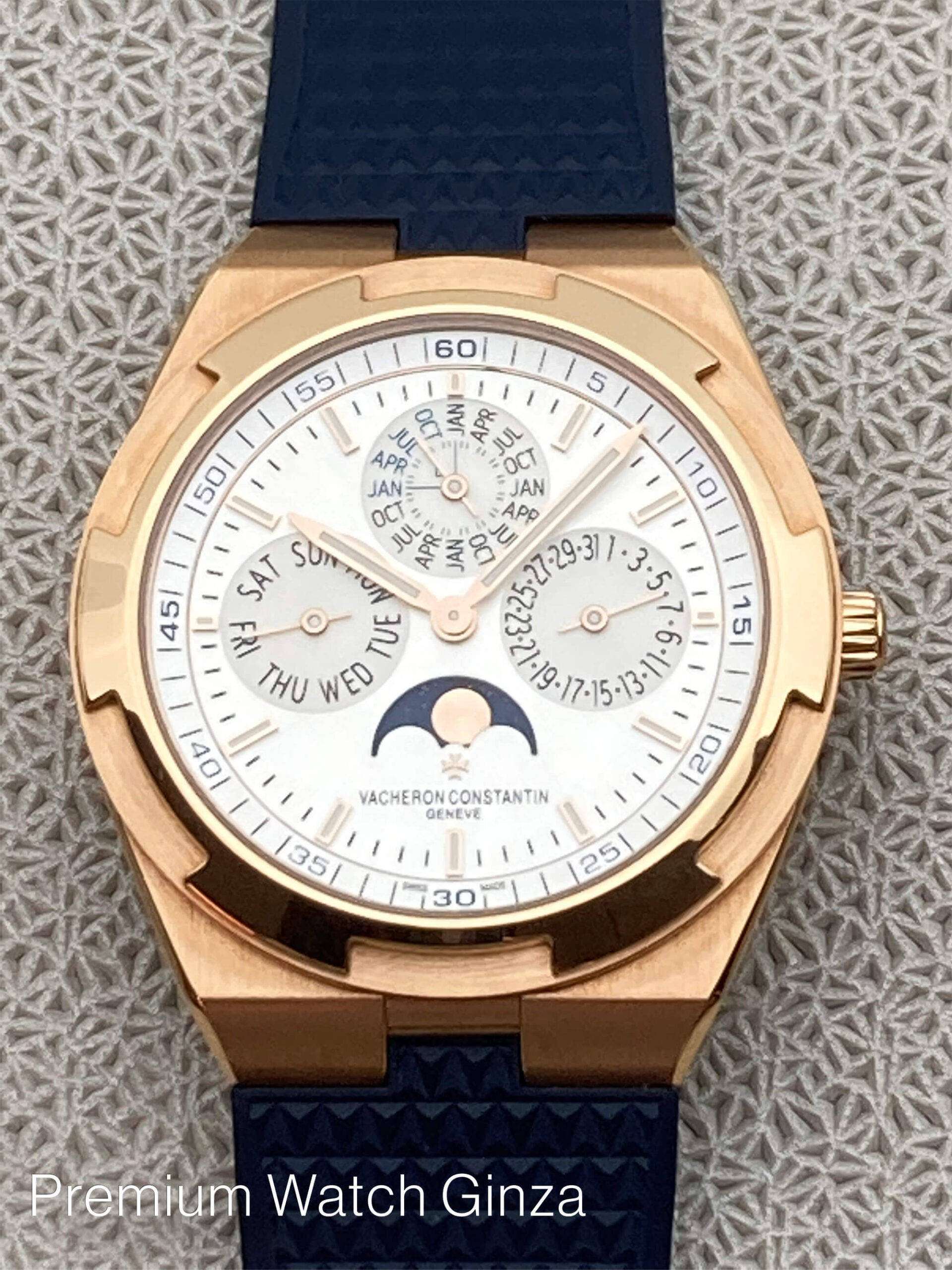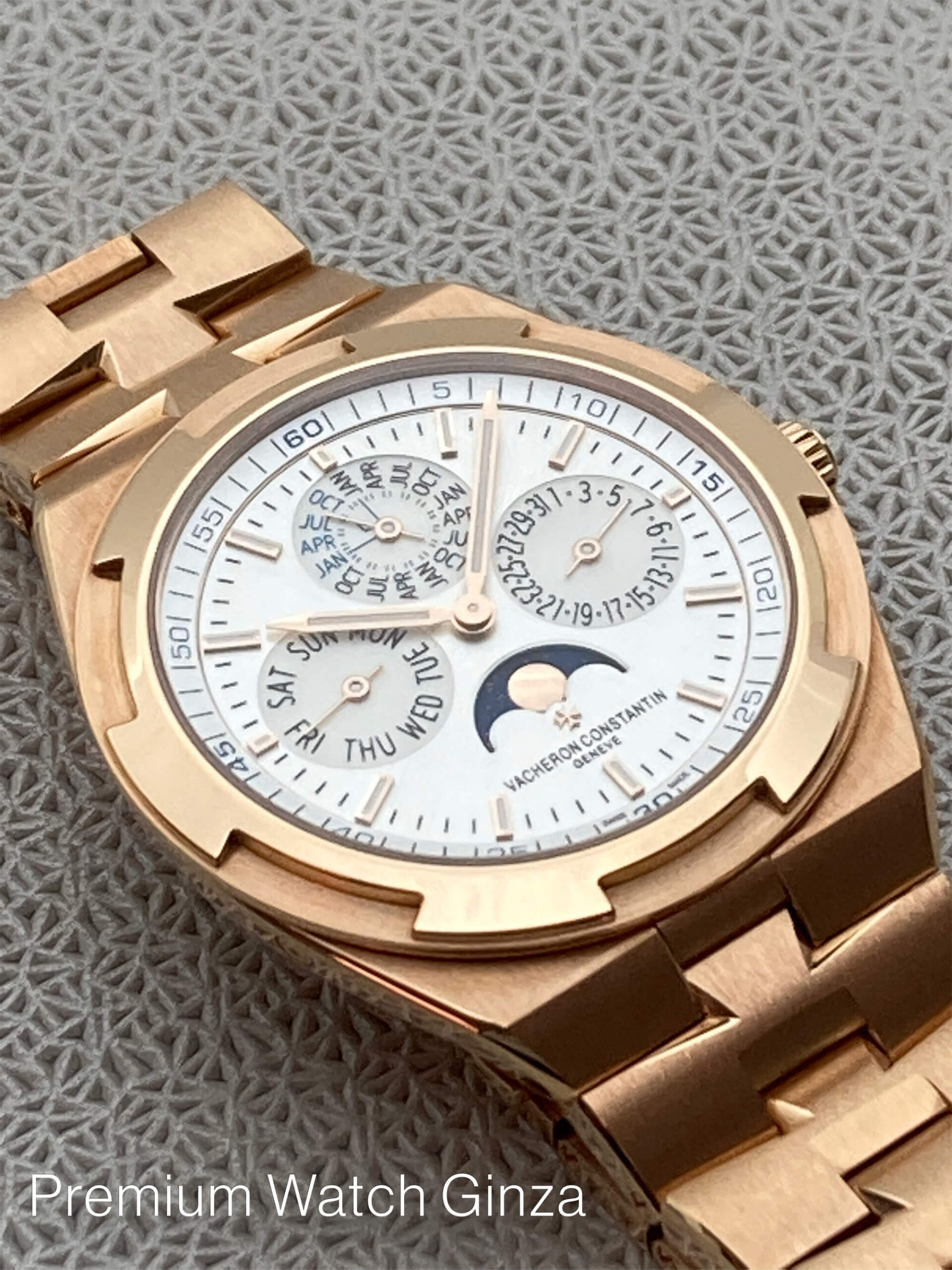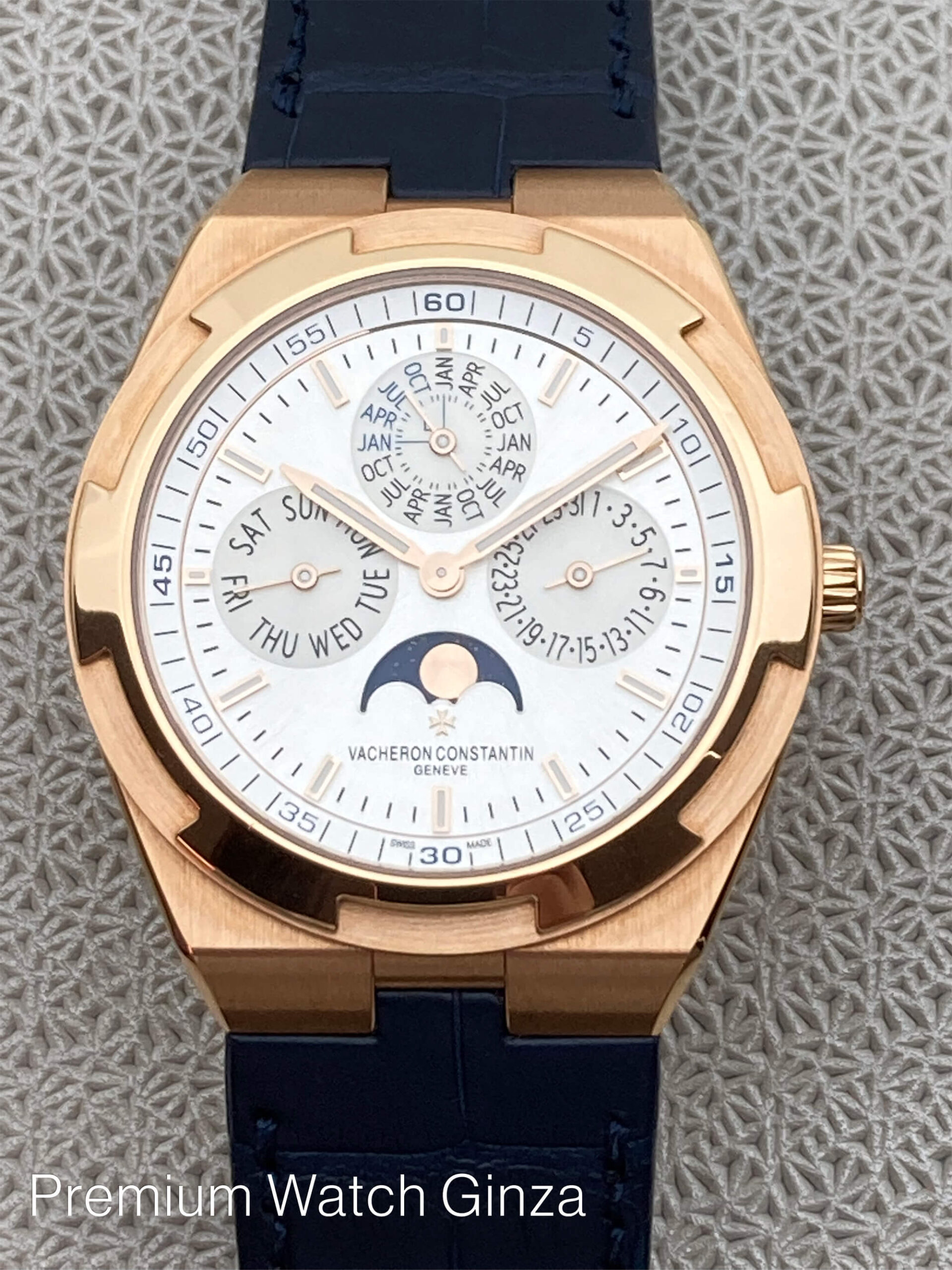 Ref.4300V/120R-B064 Overseas Perpetual Calendar Ultra-thin 2016年に発表された本モデルの第3世代コレクションで革新で画期的なインターチェンジャブルシステムにより、 3種類のブレスレット及び2種類のストラップをTPOに合わせて自由自在に付け替えが所有するオーナー自身で極めて簡単な作業で可能になり、より若年層も含めた多くの支持を得ました。 そのオーヴァーシーズコレクションに2017年に追加発表された自社設計生産のcal.1120QP/1が搭載されておりますが、 センターローター自動巻きの極薄4.05mmは永らく時計界を代表する最高峰基幹ムーブメントとして、有名な名機でございますが、 この度のモデルは永久カレンダーモジュールを組み込んだ超複雑機構のムーブメントを搭載するだけでなく、 オーヴァーシーズのスポーティな外装部を損なわずに5気圧という防水性も確保して、ケース厚さ8.1mmを実現した類稀な技術は驚嘆に値致します。 ノーチラスRef.5740/1Gでケース厚8.42mmでございますので、よりこの数値は際立っております。 生産本数は極めて少なく、全く流通されておりませんので、この逸品をご所有されている方は非常に幸運でしょう。 |