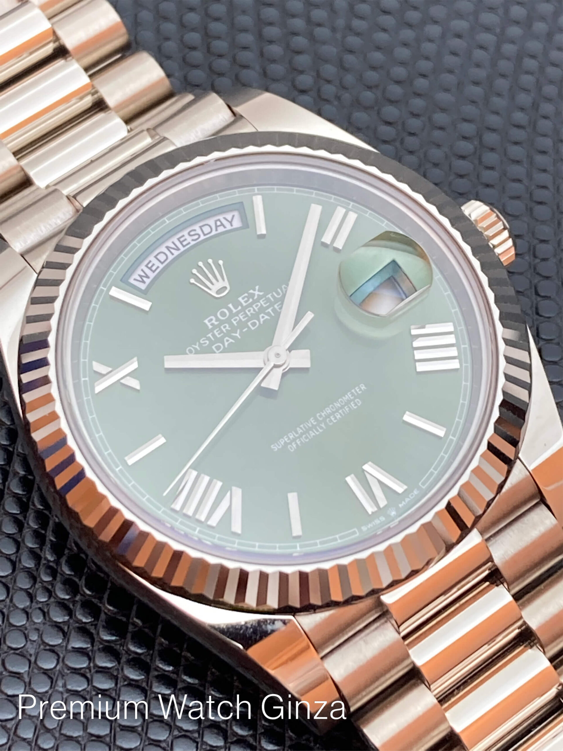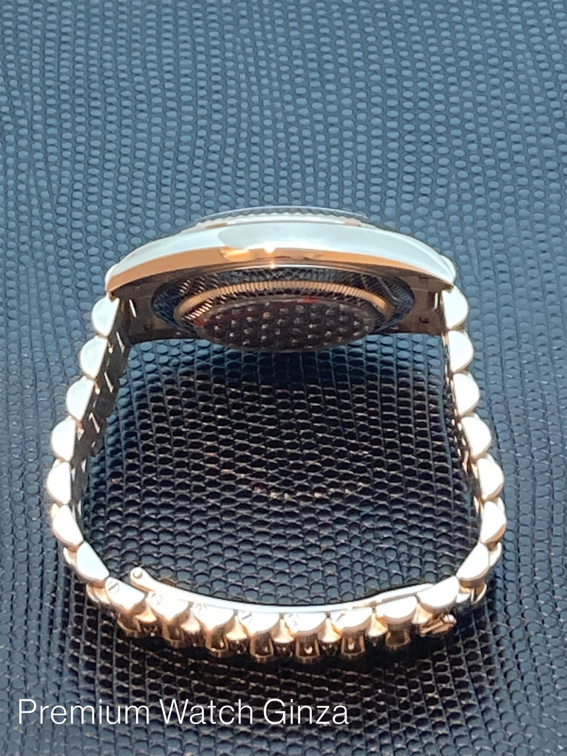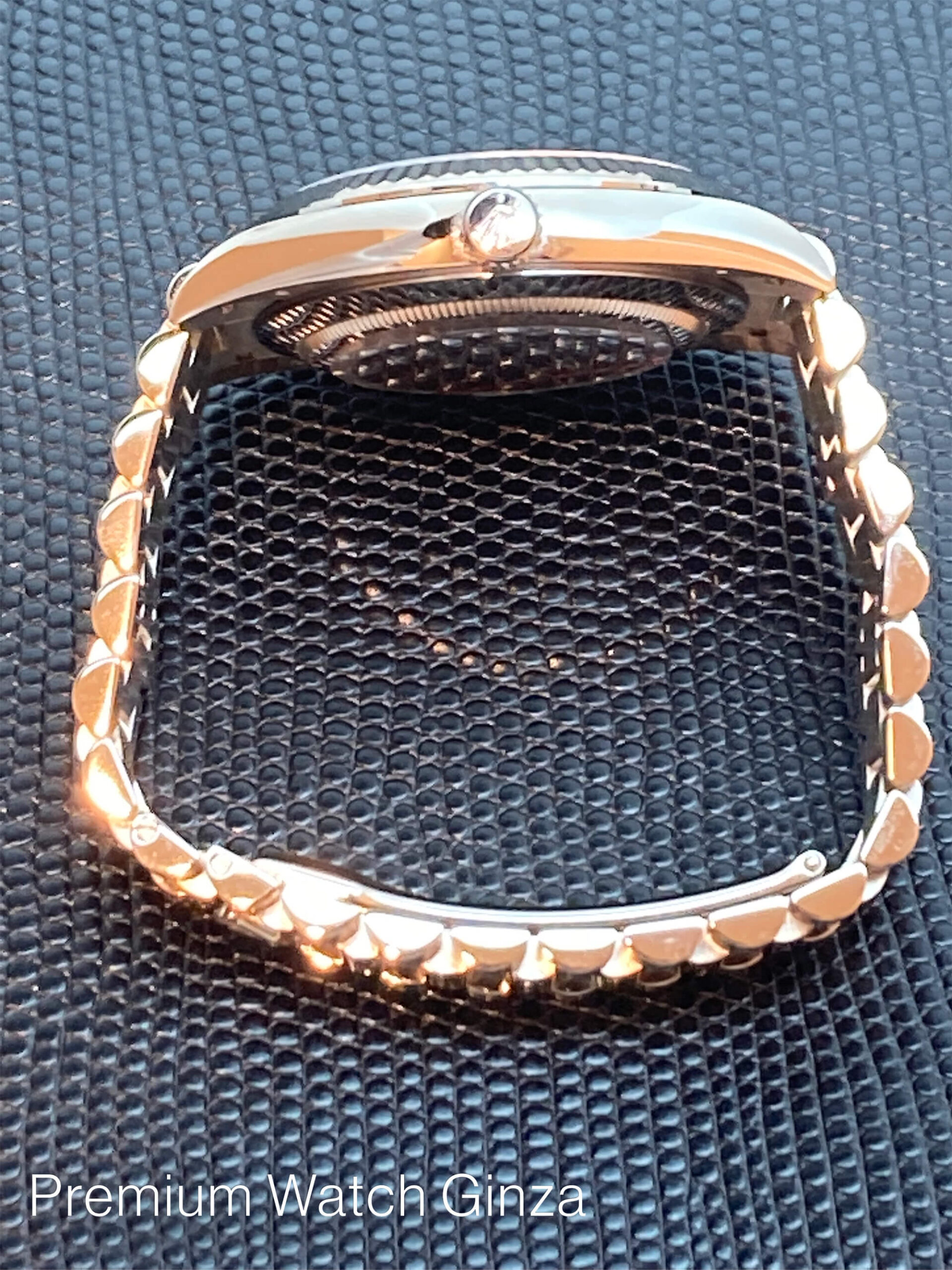 Ref.228239 「デイデイト40」 1956年に発表された世界初のフルスペルの曜日と日付が表示された防水時計として歴代のアメリカ大統領にも 愛用された事で通称“プレジデントブレス”と言われる独自形状のブレスレットで半世紀以上で販売されております。 成功者、権力者の象徴的なモデルとして高い認知度を誇るモデルでございます。 材質はK18、プラチナ製の高級貴金属のみでございまして、現行のデイデイト40が発表されたのが2015年で、 2008年に発表されたデイデイトⅡのケース直径41mmからスモールサイジングした、直径40mmとしての外装部分と ムーブメントが最新のcal.3255を搭載しておりまして、 高効率化された最新脱進機とパワーリザーブが約70時間に向上して格別な進化を遂げております。 |