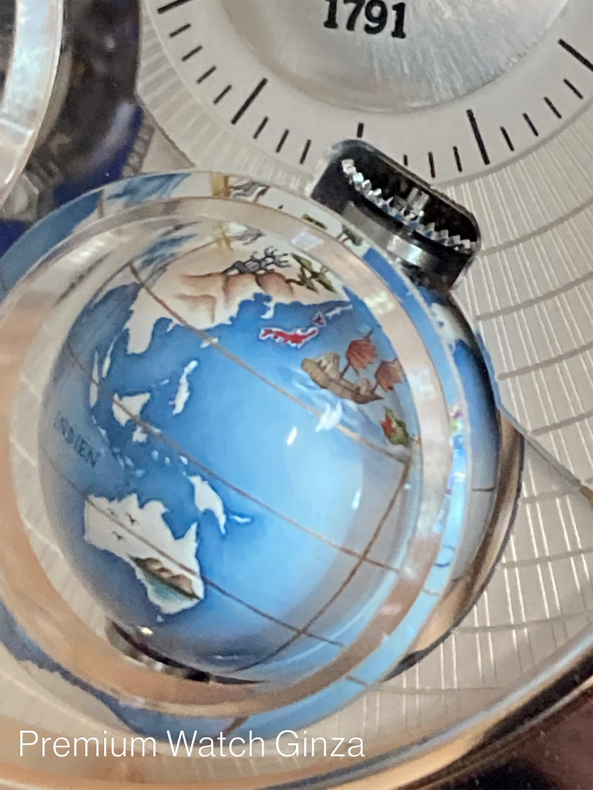 本モデルの代表するもう一つの機構の「プラネタリウム」でございますが、昼夜表示を1個の地球儀が1日で1回転することで表現する