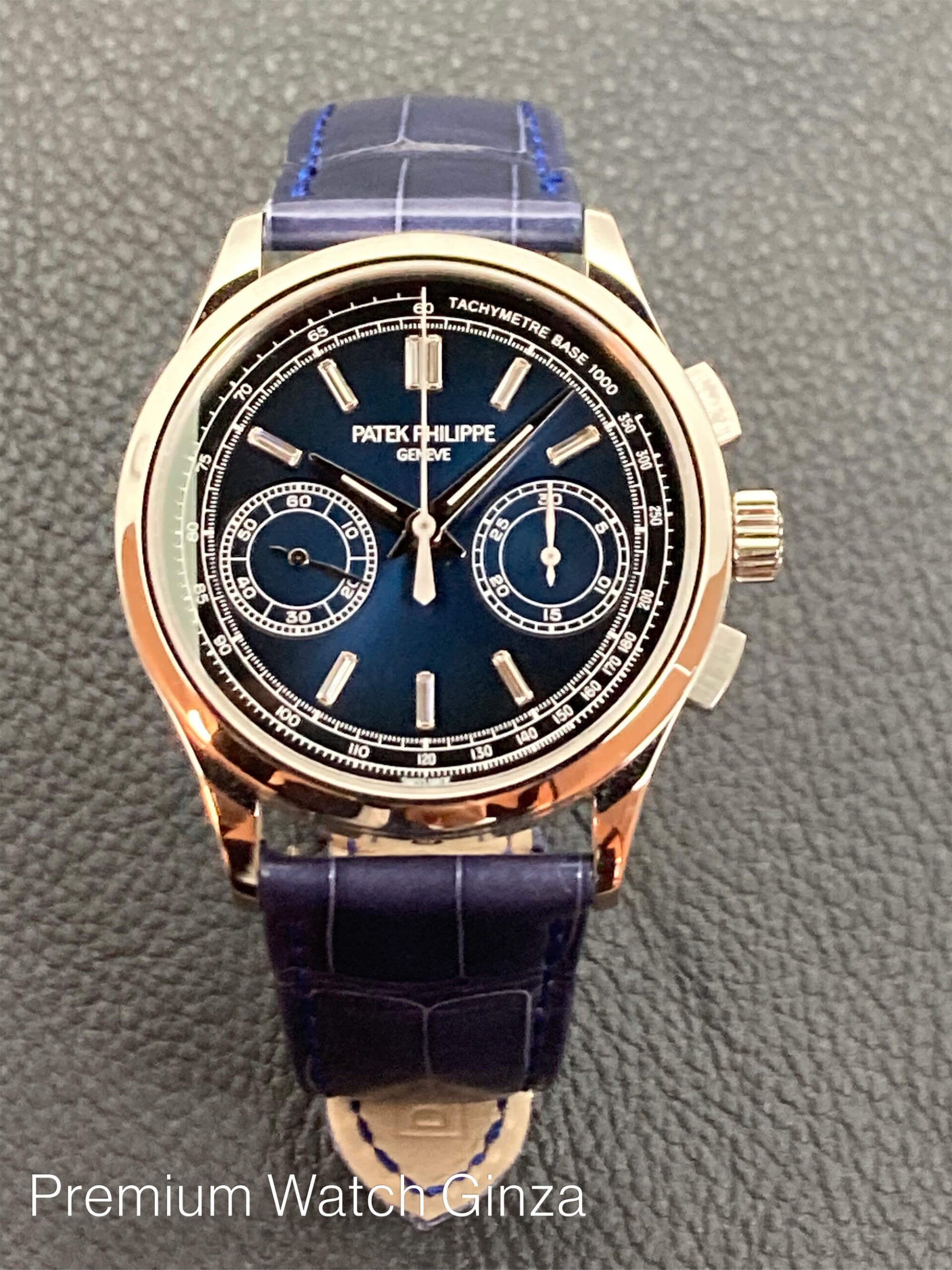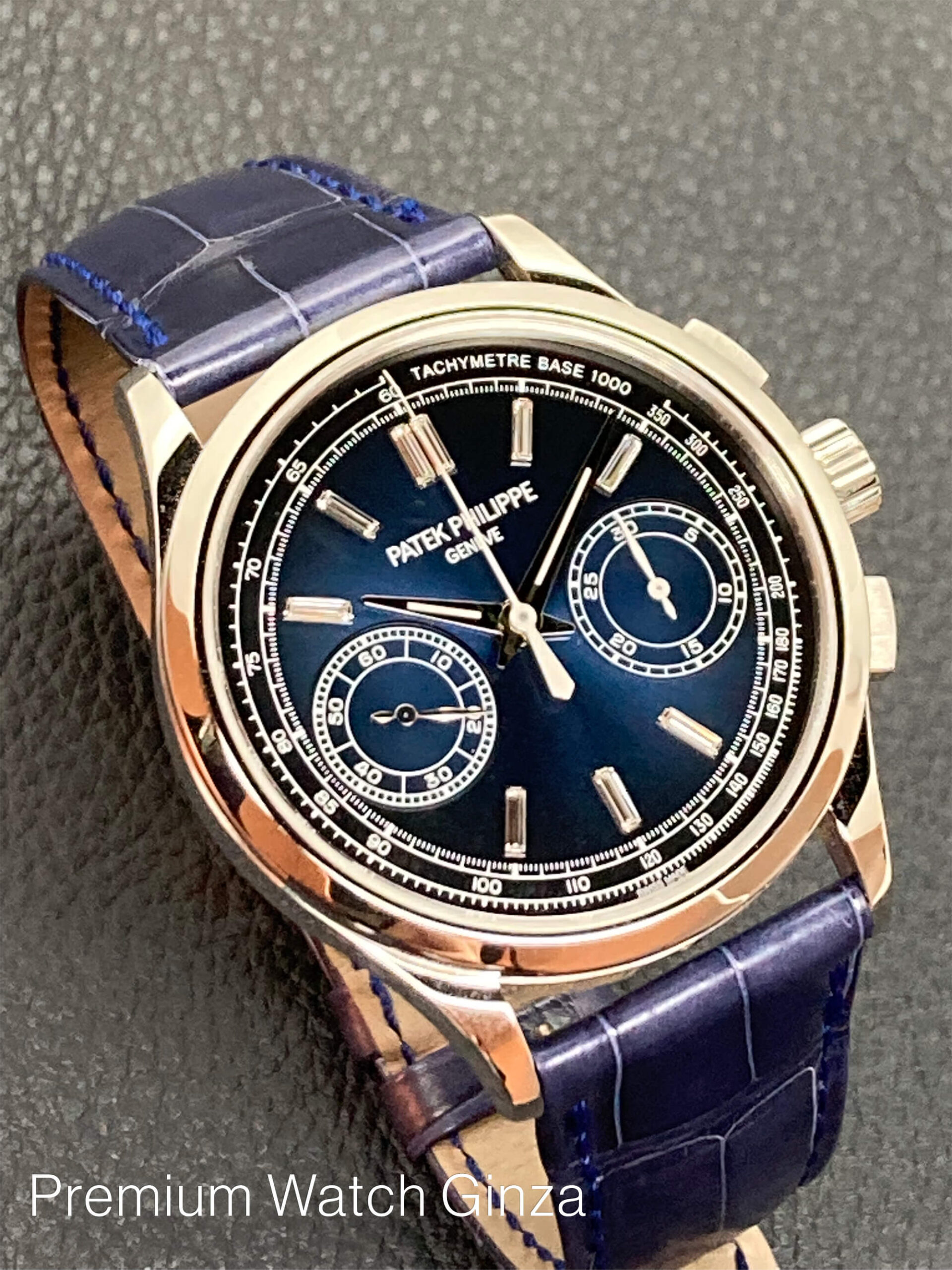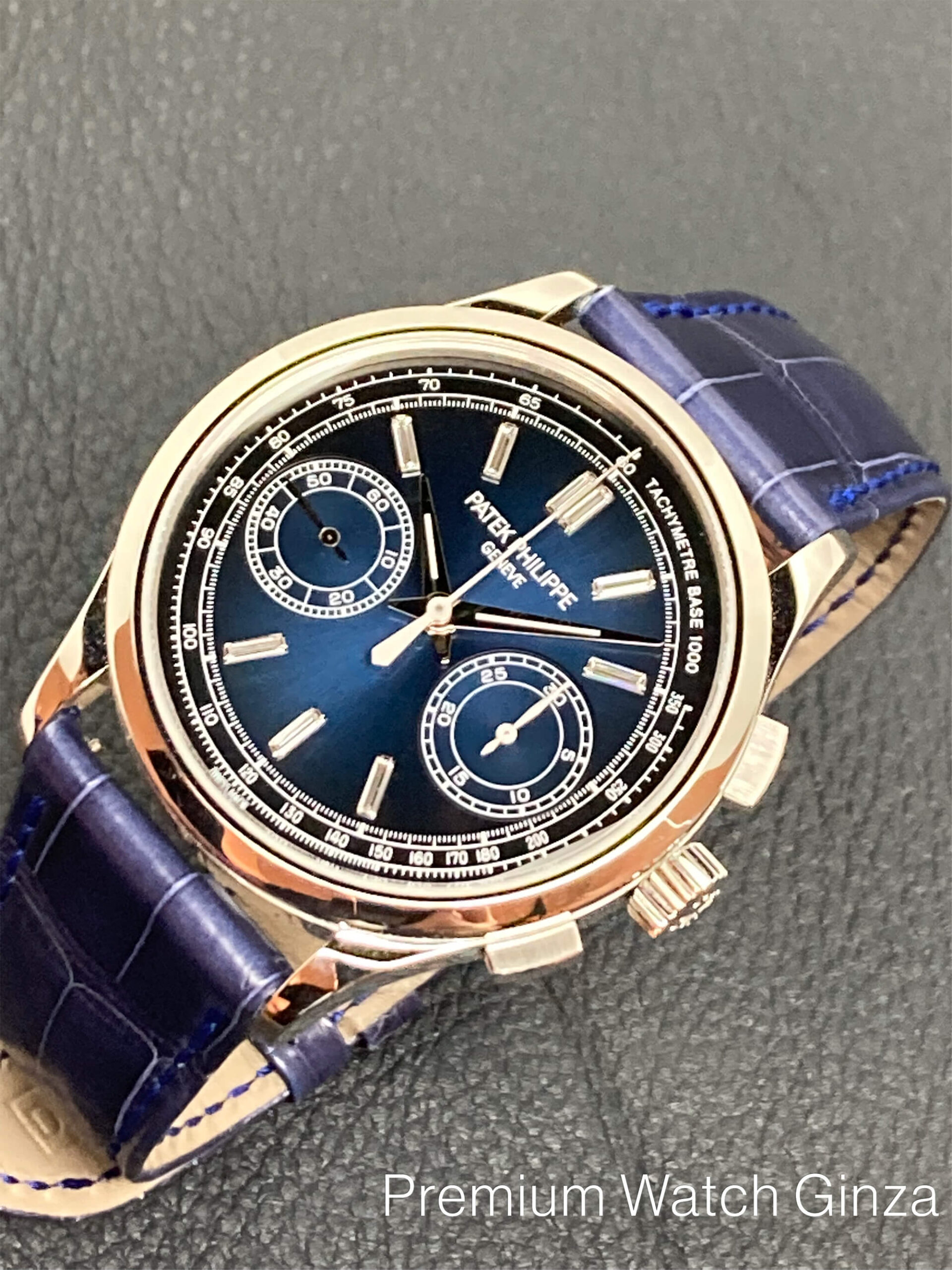 Ref.5170P-001 Chronograph 2017年発表 同社の手巻きクロノグラフの歴史は長く、また最もメカニズムの変遷を感じられる系譜となっております。 2009年に完全自社開発されたCal.CH 29-535 PSクロノグラフムーブメントは時計愛好家の好むクラシックな機構で(手巻式、コラムホイール、水平クラッチ)パテック・フィリップの新時代を象徴するモデルへと搭載される基幹ムーブメントでございます。 同社特許のダイナモメトリッククラウン(ゼンマイの巻き切り防止構造)を採用して、安全面も考慮に入れた機種でもございます。 特に文字盤製作には並外れた技術と情熱を注入する同社において、本モデルの文字盤は、インデックスに9個(0.23ct)のバゲットダイヤモンドセッティングの特別文字盤で、 「ブルーサンバースト ブラックグラデーション文字盤」は、通常の文字盤と意匠が異なり、青文字盤の濃淡吹き付けた塗料をブラシで染める手法で 1本1本に濃淡の個体差の出る限定品の様な稀有なモデルでございます。 |