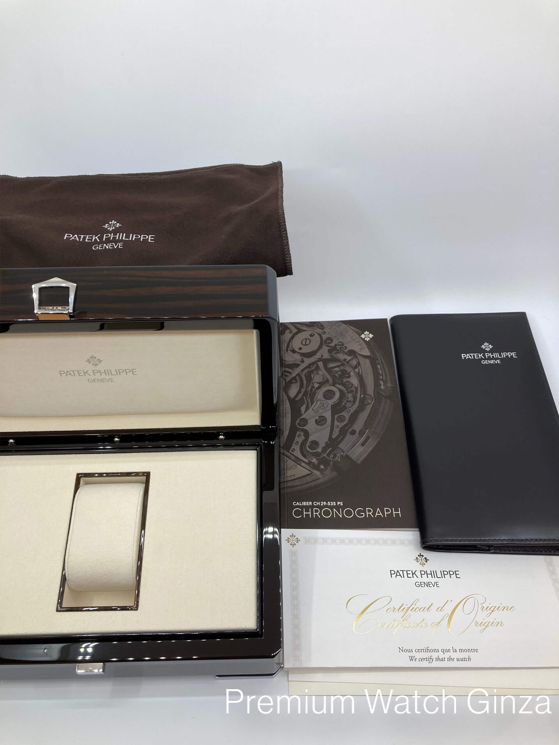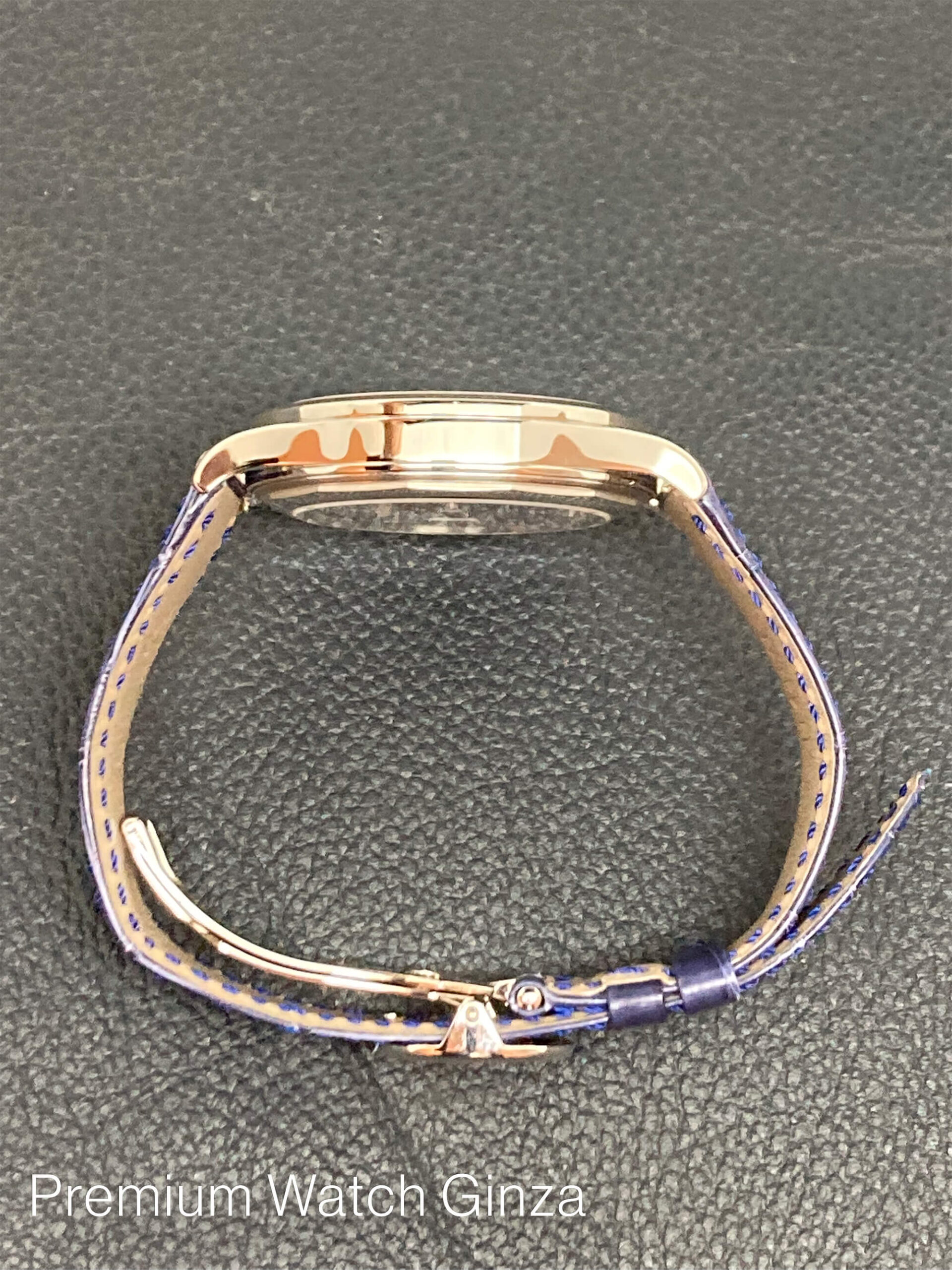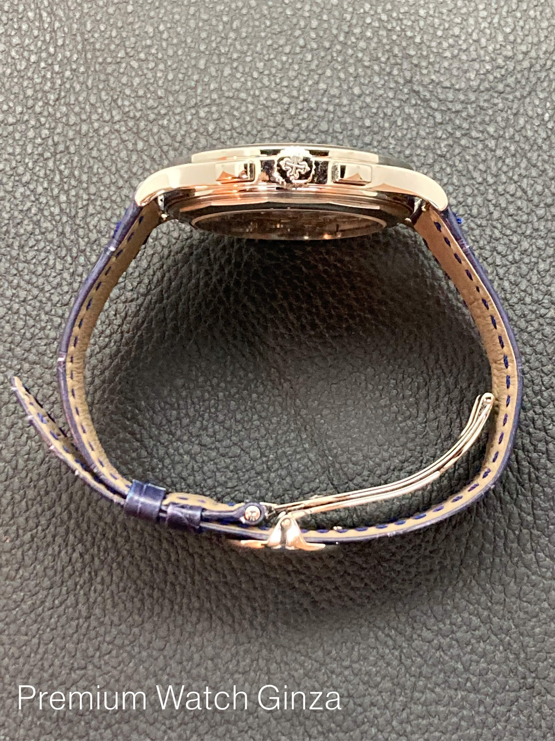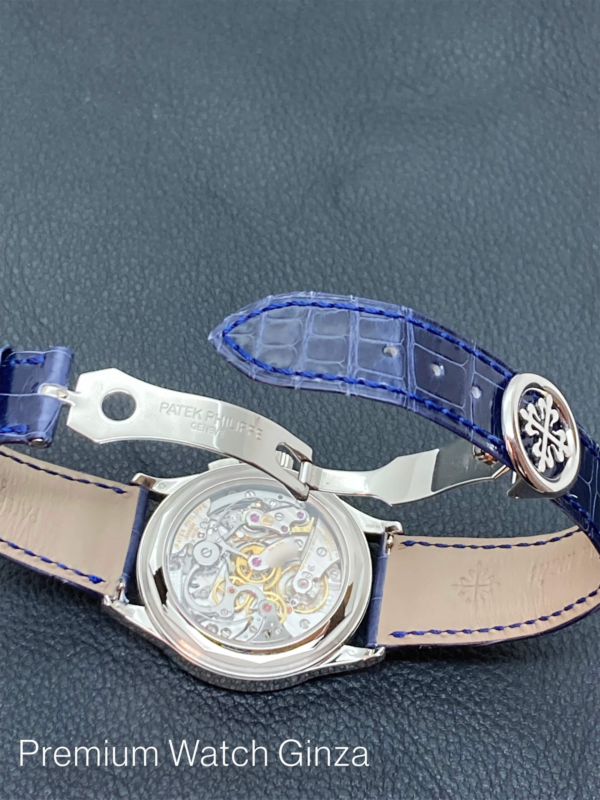 Ref.5170P-001 Chronograph 2017年発表 同社の手巻きクロノグラフの歴史は長く、また最もメカニズムの変遷を感じられる系譜となっております。 2009年に完全自社開発されたCal.CH 29-535 PSクロノグラフムーブメントは時計愛好家の好むクラシックな機構で(手巻式、コラムホイール、水平クラッチ)パテック・フィリップの新時代を象徴するモデルへと搭載される基幹ムーブメントでございます。 同社特許のダイナモメトリッククラウン(ゼンマイの巻き切り防止構造)を採用して、安全面も考慮に入れた機種でもございます。 特に文字盤製作には並外れた技術と情熱を注入する同社において、本モデルの文字盤は、インデックスに9個(0.23ct)のバゲットダイヤモンドセッティングの特別文字盤で、 「ブルーサンバースト ブラックグラデーション文字盤」は、通常の文字盤と意匠が異なり、青文字盤の濃淡吹き付けた塗料をブラシで染める手法で 1本1本に濃淡の個体差の出る限定品の様な稀有なモデルでございます。 |