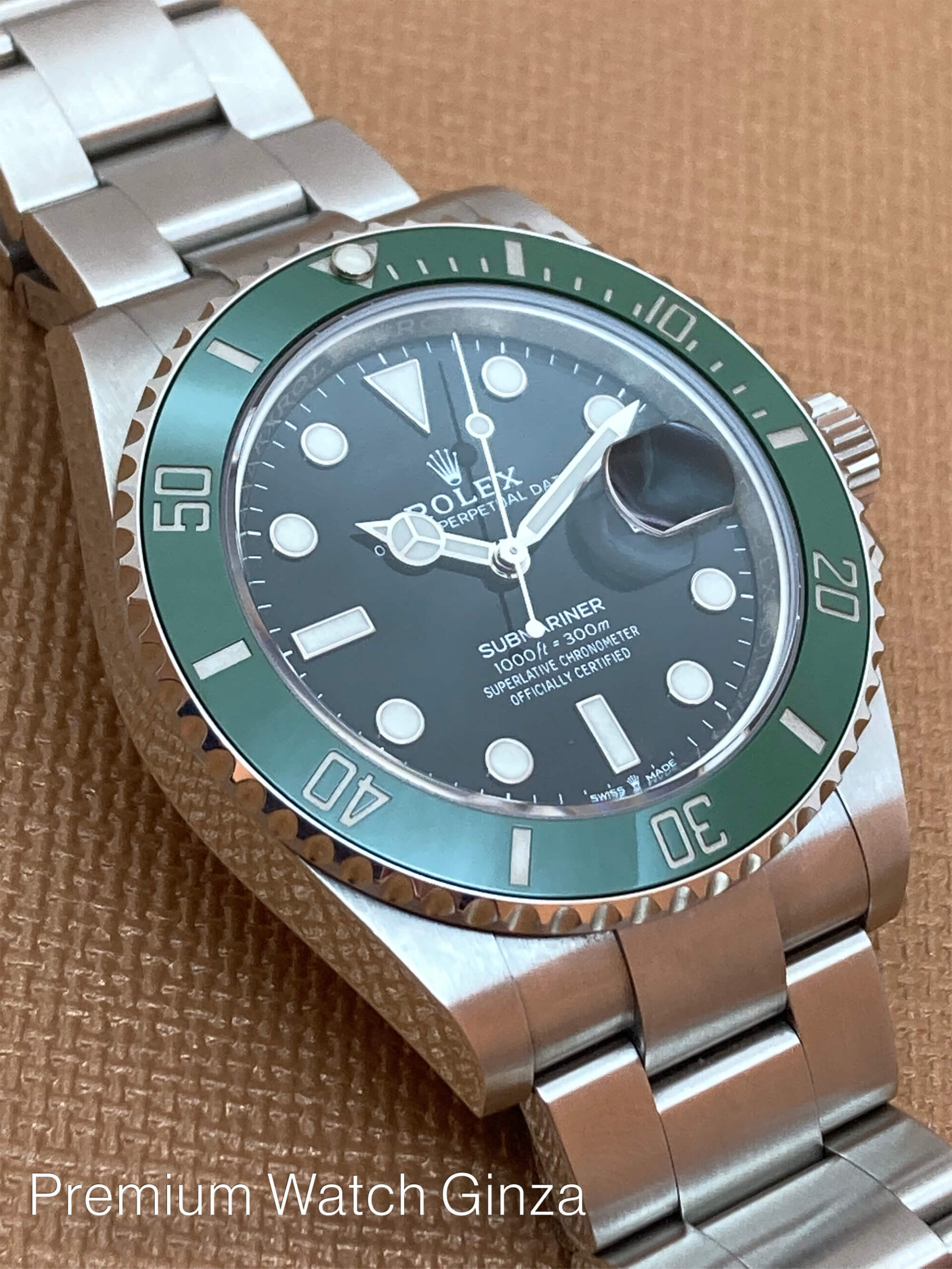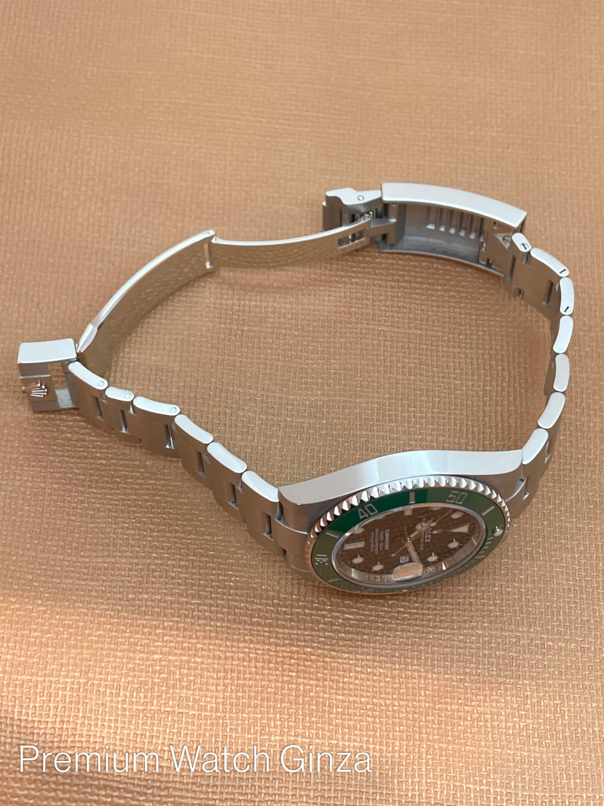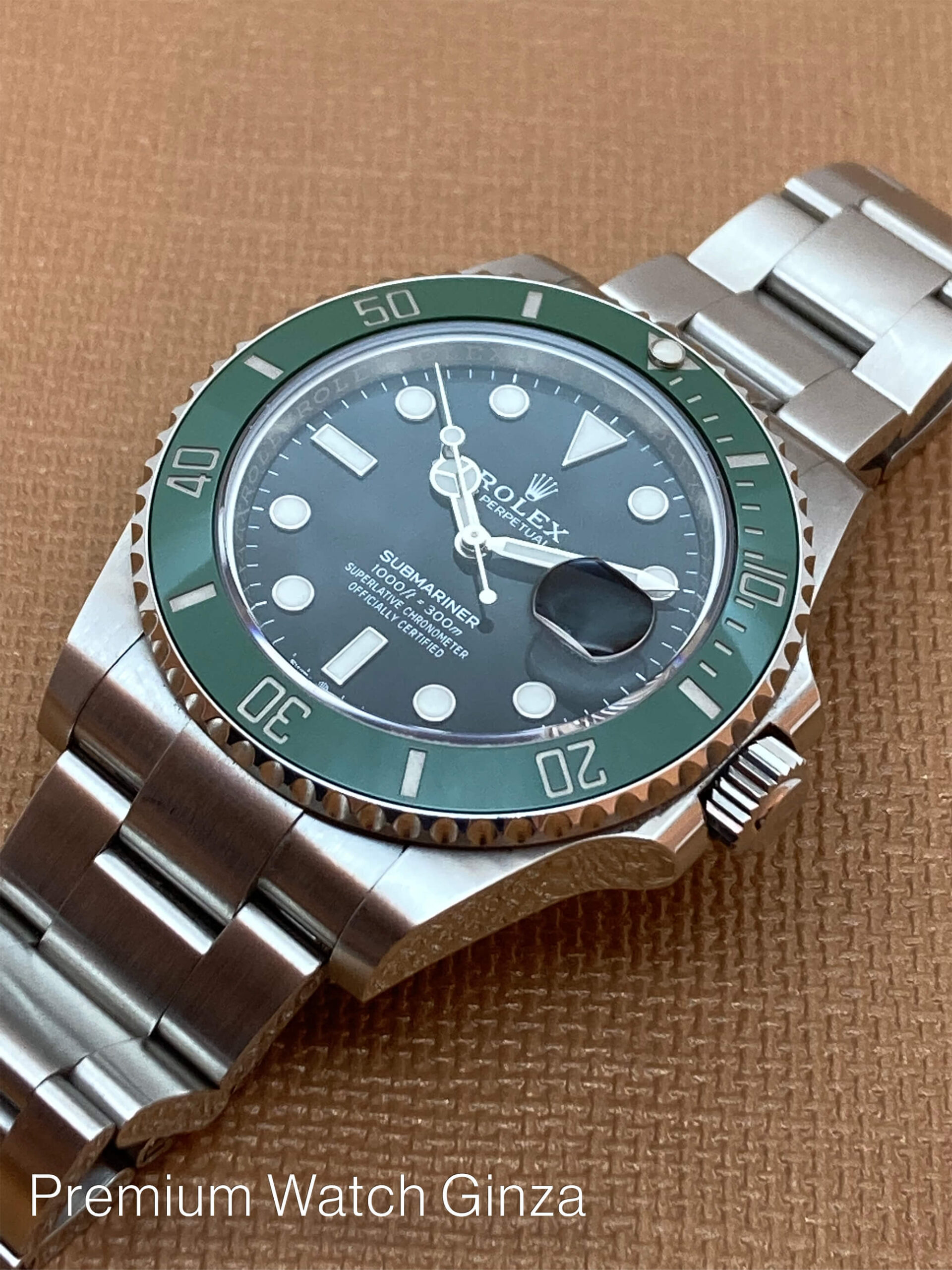 Ref.216610LV SUBMARINER DATE GREEN 「サブマリーナー・デイト」の最新機種。 前モデル(Ref.116610LV)からの変更点は少ないながらも、 ケースサイズが41mmにサイズアップ致しまして、文字盤がサブマリーナー50周年記念“初代グリーンサブ”と同じ緑ベゼル×黒文字盤に戻りました。 本モデルで大きな変更点が緑セラクロムベゼルです。 既にセラクロムベゼルは多数採用されておりますが、ROLEX社のカンパニーカラーでもあるグリーンをセラクロムベゼル仕様で施したサブマリーナーに採用されるというのは、 趣がございますし、セラミック製で非常に硬く、耐傷性や耐腐蝕性に優れ、紫外線の影響も受けにくい素材でございますので、 本格的な潜水時計としての用途で実用性が高まったように感じる良きモデルチェンジでございます、 リファレンスナンバーの末尾“LV”は、フランス語 “Lunette Vert”の略で、緑のベゼルを意味しています。 |