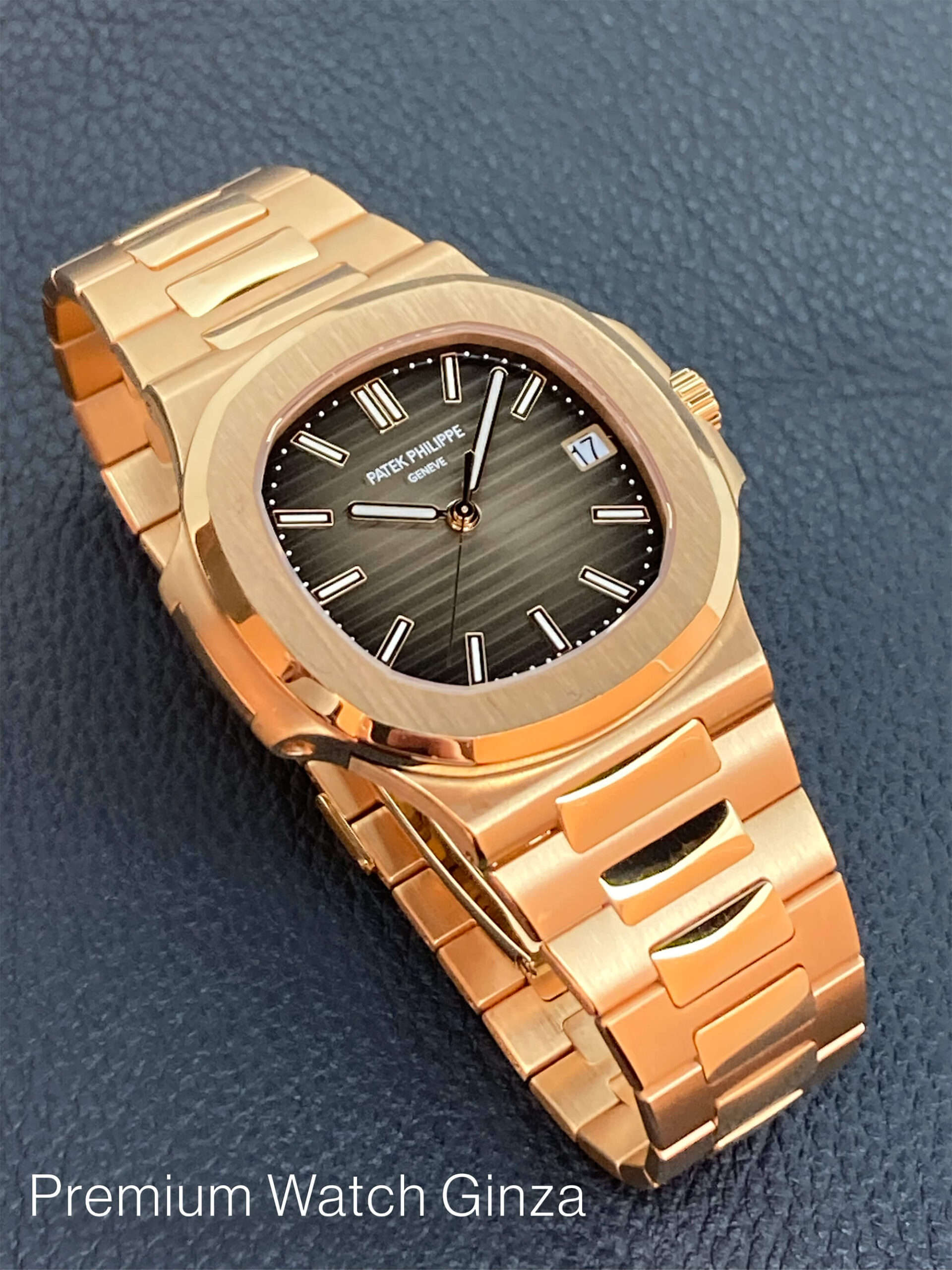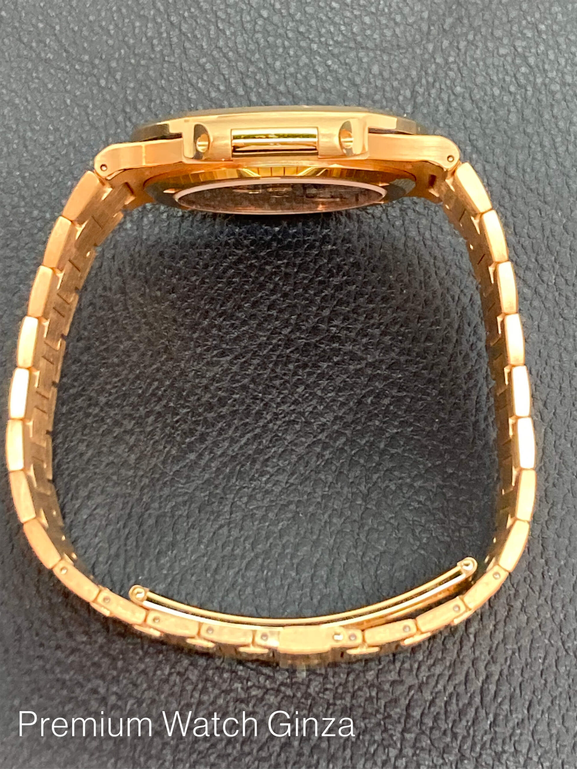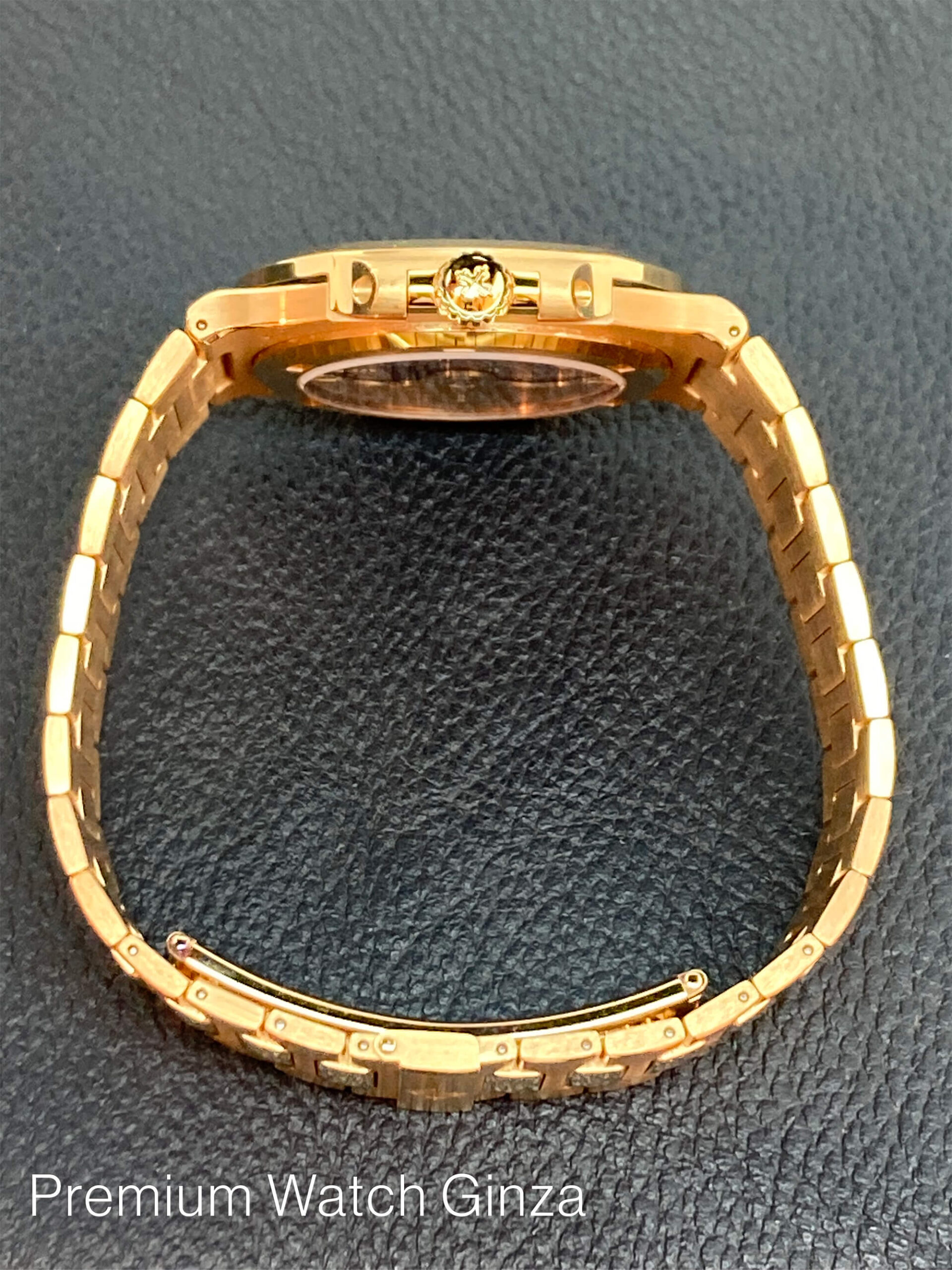 Ref.5711/1R-001 cal.26-330SC NAUTILUS 1976年に誕生したノーチラスコレクション。 ラグジュアリースポーツモデルの代表格として、クラシック時計の様な薄さで、防水時計を製作するという概念の元に数々の機種が販売されて参りました。 一般的な防水時計は、堅牢性を保つ為、ねじ込み式の裏蓋で防水性を維持致します。しかし、その構造は厚みが出てしまう為、高級感が損なわれる欠点が有り、 当時としては革新的な裏蓋を無くし、ケース両サイドの通称「耳」と呼ばれる張り出したパーツをスクリューシャフトで密閉して防水性を確保致しました。 1976年同時期に発売された著名なSUV車レンジローバーの乗車時の際にマッチするスポーティな時計というコンセプトを元に製作されたエピソードもございます。 デザイン元は巨匠ジェラルドジェンタ氏、ロイヤルオークの鋭角な八角形と比較すると控えめで流麗な形状の外装デザインでございますが、 これがパテック哲学を感じて、独自の緩やかで深みを与えてくれる存在となっております。 このRef.5711が発表されたのが、ノーチラス誕生30周年にあたる2006年。 同社においても様々なターニングポイントとなったこの年にノーチラス現行コレクションの基幹となるモデルがRef.5711でございます。 そして9年後の2015年に本モデルRef,5711/1R-001が発表されました。 元々、アリゲーター革ベルト仕様の5711Rはございましたが、K18ブレスレットモデルは、クロノグラフのRef.5980/1Rのみでございました。 また、発表当時ノーチラス40年間の歴史の中でもK18RGブレスレットモデルは初めてでございます。文字盤のブラウングラデーションもRef.5980のブラックとは異なり、 同社の巧みな染色技術により絶妙なブラックに近いブラウンの濃淡が表現されておりまして、 非常に表情豊かで独特な美しさを醸し出しており、材質のローズゴールドとの相性が抜群でございます。 大人気機種でございましたが、惜しまれつつ既に生産が終了しております。 2015年~2021年の僅か6年間の中で長く採用されてきたcal.324SCから、 最後の約2年間のみの生産で非常に希少となった新型基幹ムーブメントcal.26-330SCが搭載されております。 計時精度に影響を及ぼす点を重視して長く採用されなかったストップセコンド機能が同社の社内品質検査規格であるPPシールの極めて厳格な基準を 合格して製品化された事に非常に付加価値がございます。 |