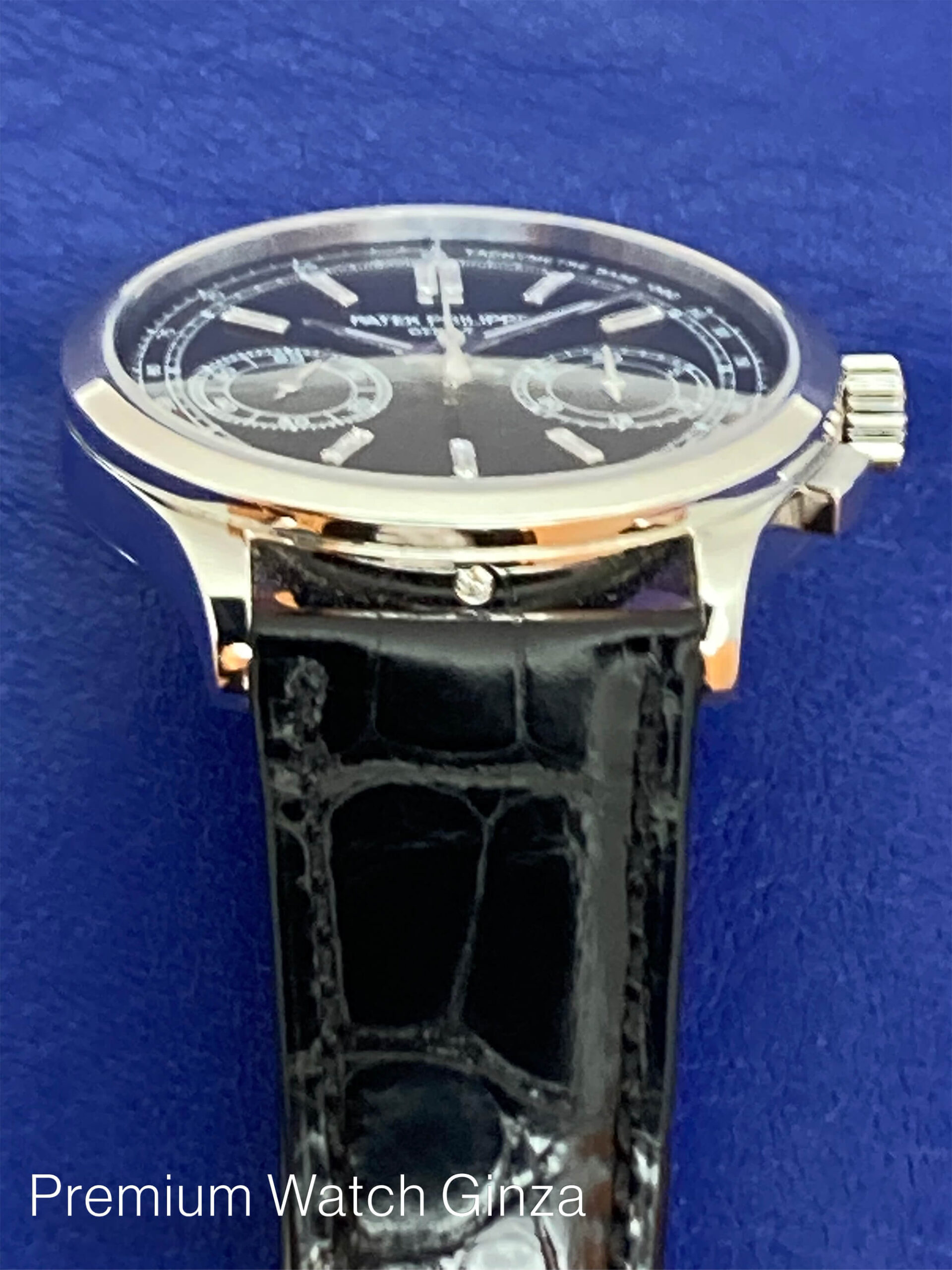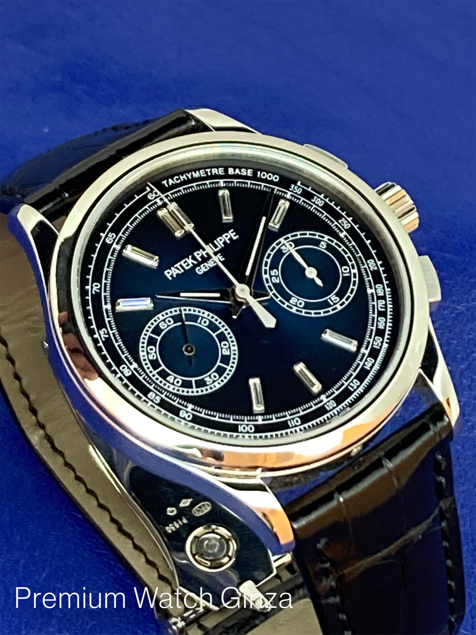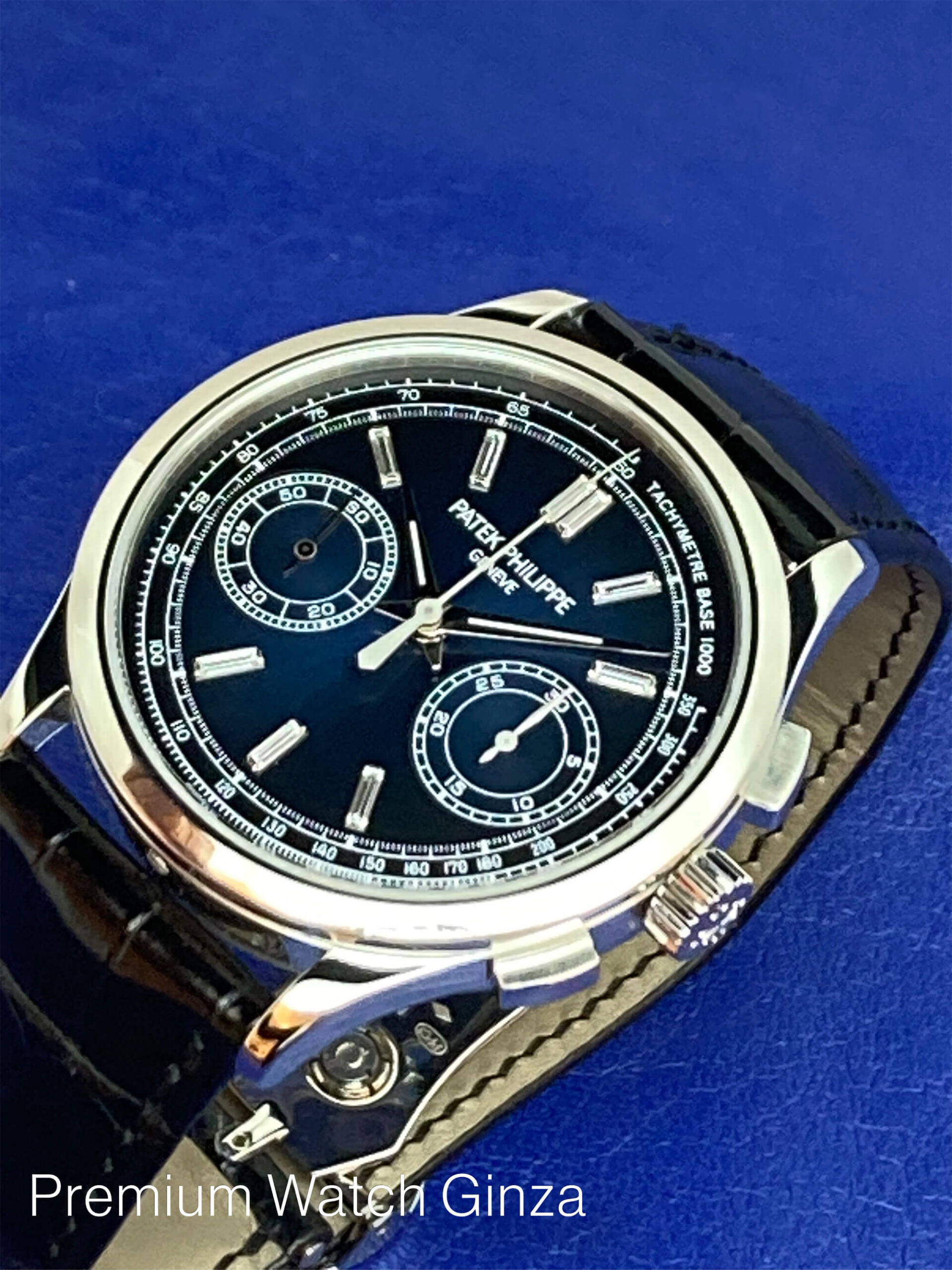 Ref.5170P-001 Chronograph 2017年発表 同社の手巻きクロノグラフの歴史は長く、また最もメカニズムの変遷を感じられる系譜となっております。 2009年に完全自社開発されたCal.CH 29-535 PSクロノグラフムーブメントは時計愛好家の好むクラシックな機構で(手巻式、コラムホイール、水平クラッチ) パテック・フィリップの新時代を象徴するモデルへと搭載される基幹ムーブメントでございます。 同社特許のダイナモメトリッククラウン(ゼンマイの巻き切り防止構造)を採用して、安全面も考慮に入れた機種でもございます。 特に文字盤製作には並外れた技術と情熱を注入する同社において、本モデルの文字盤は、 インデックスに9個(0.23ct)のバゲットダイヤモンドセッティングの特別文字盤で、 「ブルーサンバースト ブラックグラデーション文字盤」は、通常の文字盤と意匠が異なり、青文字盤の濃淡吹き付けた塗料をブラシで染める手法で 1本1本に濃淡の個体差の出る限定品の様な稀有なモデルでございます。 |