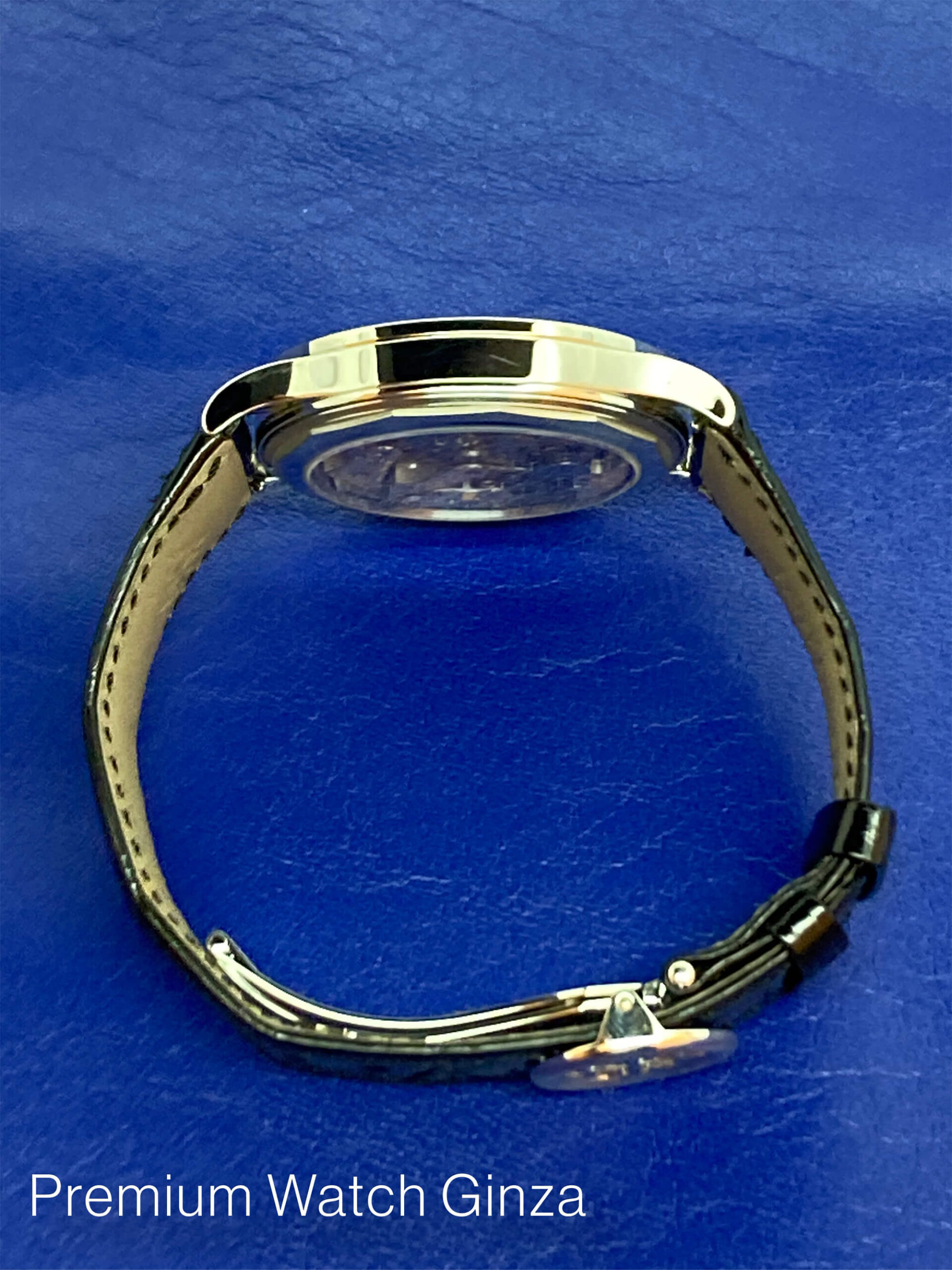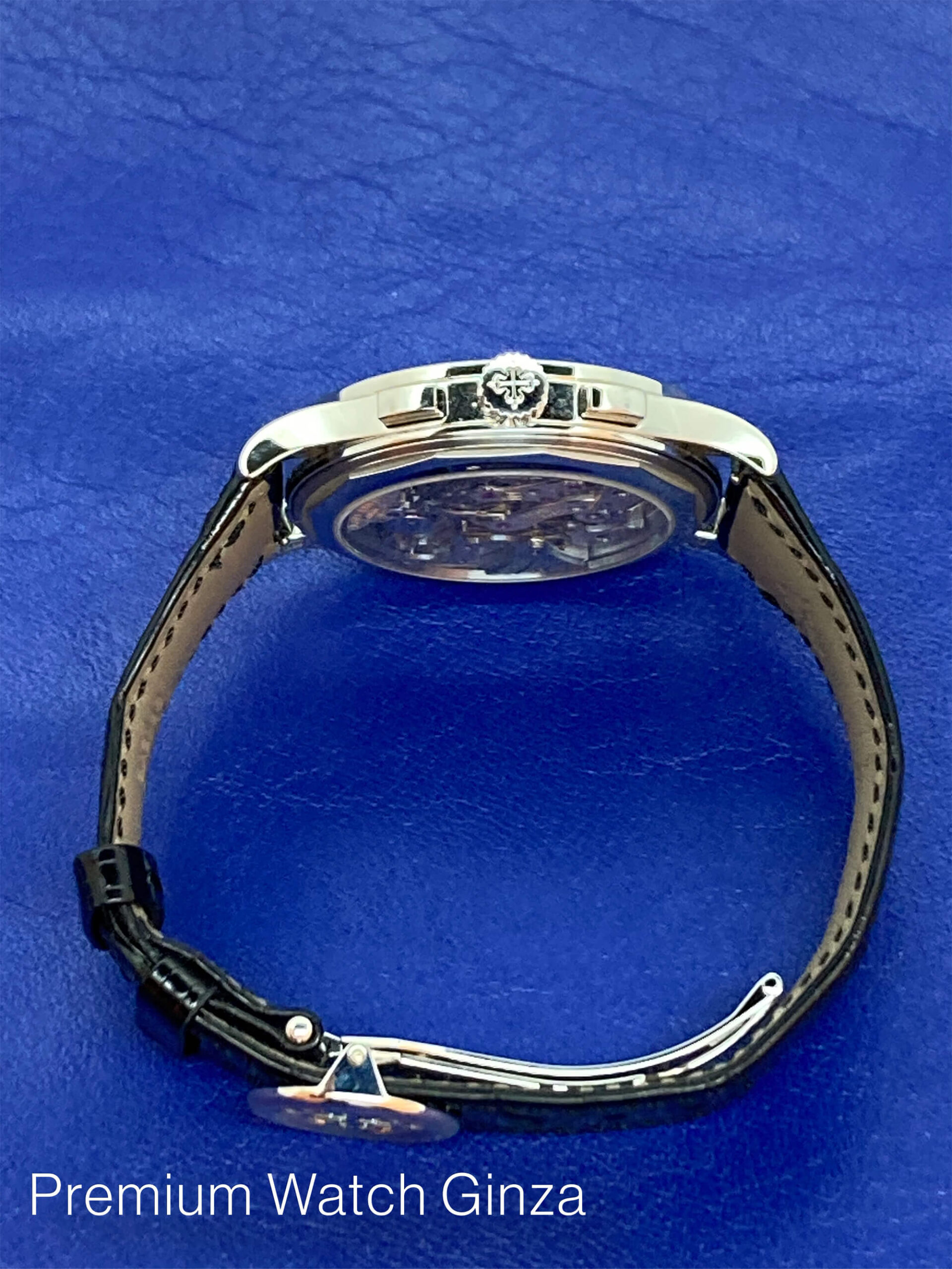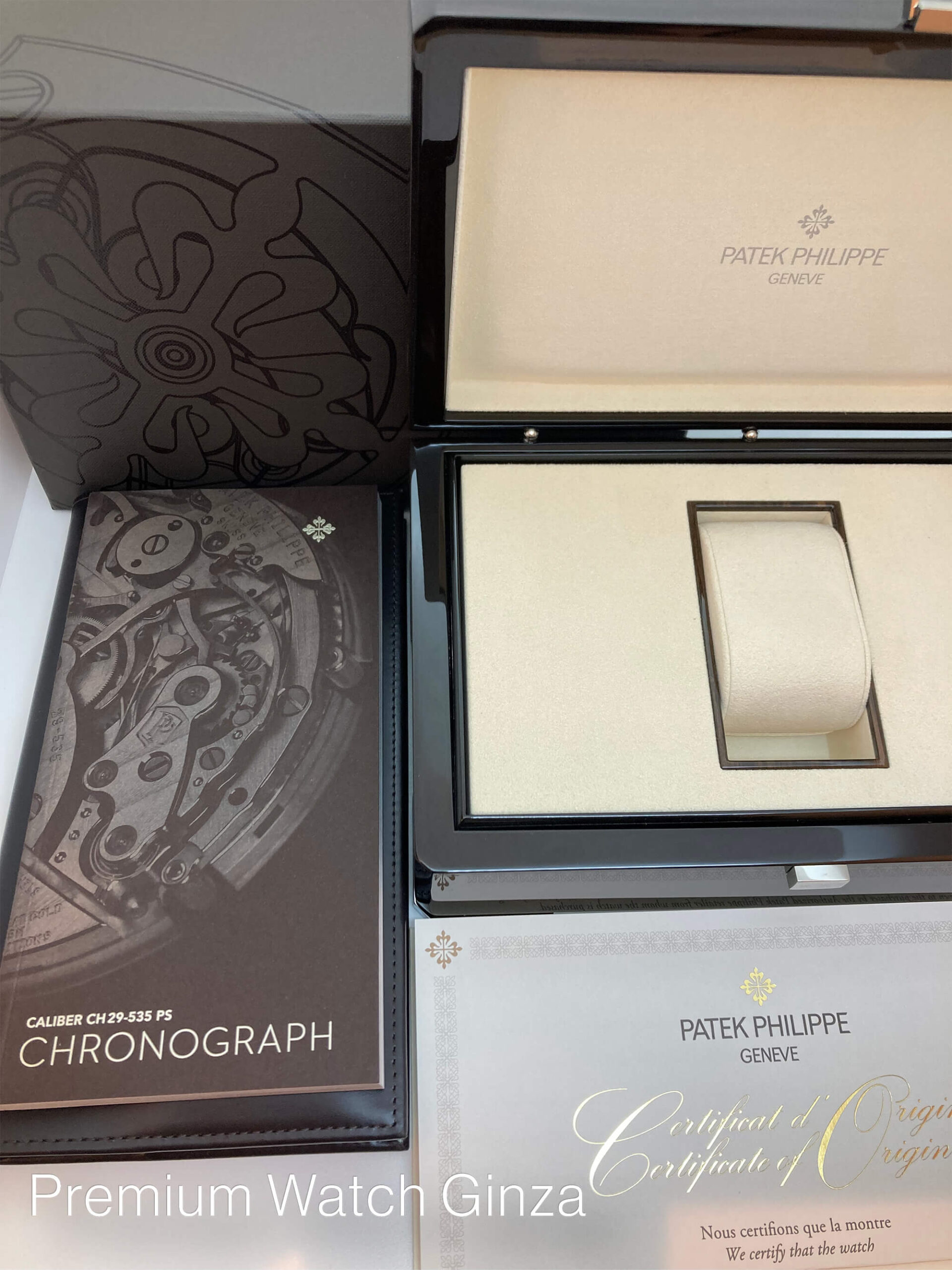 Ref.5170P-001 Chronograph 2017年発表 同社の手巻きクロノグラフの歴史は長く、また最もメカニズムの変遷を感じられる系譜となっております。 2009年に完全自社開発されたCal.CH 29-535 PSクロノグラフムーブメントは時計愛好家の好むクラシックな機構で(手巻式、コラムホイール、水平クラッチ) パテック・フィリップの新時代を象徴するモデルへと搭載される基幹ムーブメントでございます。 同社特許のダイナモメトリッククラウン(ゼンマイの巻き切り防止構造)を採用して、安全面も考慮に入れた機種でもございます。 特に文字盤製作には並外れた技術と情熱を注入する同社において、本モデルの文字盤は、 インデックスに9個(0.23ct)のバゲットダイヤモンドセッティングの特別文字盤で、 「ブルーサンバースト ブラックグラデーション文字盤」は、通常の文字盤と意匠が異なり、青文字盤の濃淡吹き付けた塗料をブラシで染める手法で 1本1本に濃淡の個体差の出る限定品の様な稀有なモデルでございます。 |