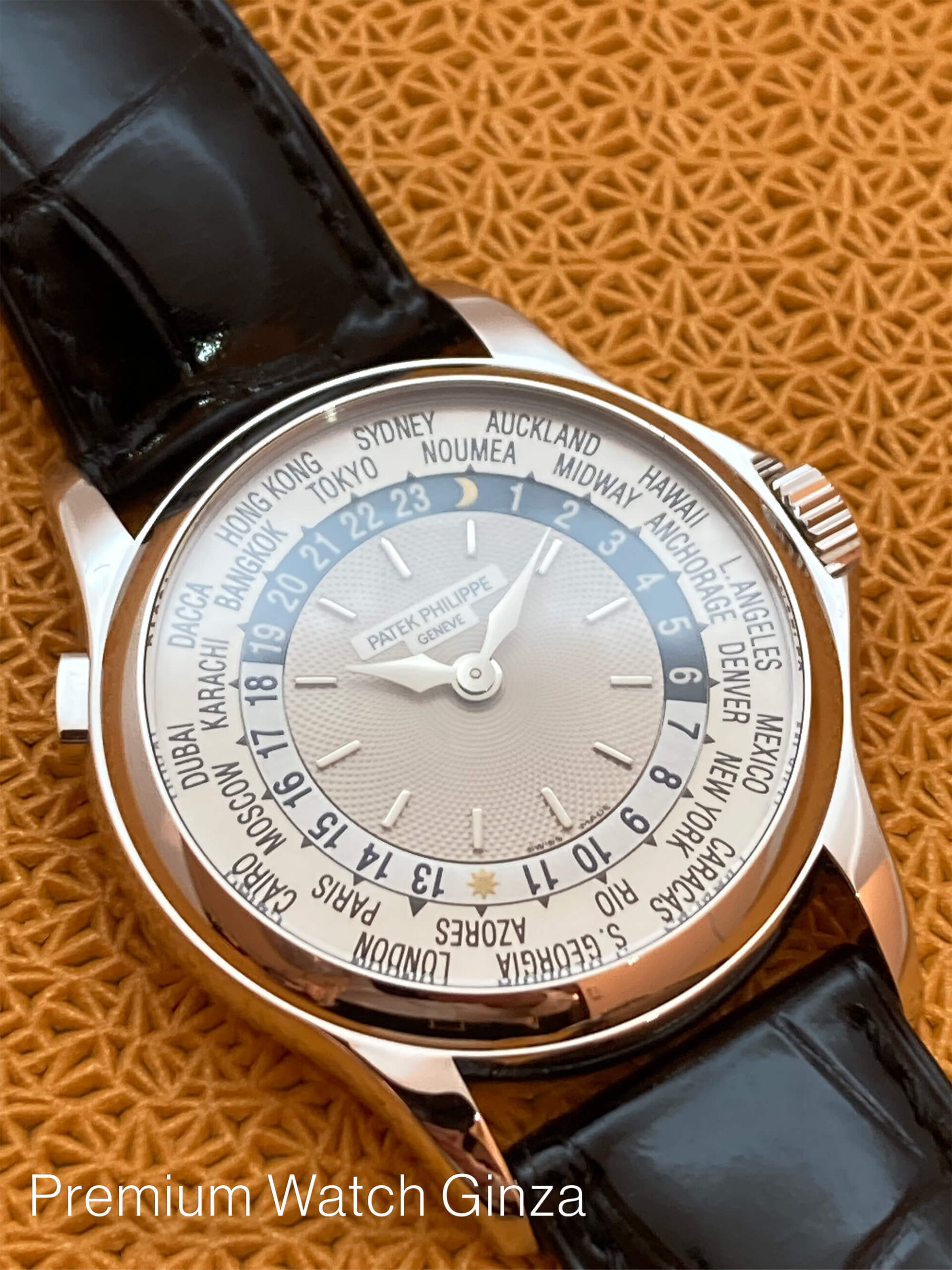 Ref.5110G-001 World Time 2002年当時の世界最高落札価格を打ち立てた伝説的な巨匠ルイ・コティエに手掛けられた 1946年製のRef.1415HUプラチナ製ワールドタイムをルーツに持ち、社是である伝統と革新を体現するかの様な現代パテックフィリップのコンプリケーションの象徴ワールドタイム。 金字塔を打ち立てた都市表示と24時間表示外周リングを踏襲した特許機構カップリングを全く無駄の無い絶妙で完璧なデザインレイアウトで複合させた本モデルは 老若男女問わず簡易的な操作性と視認性をもってして、1999年に満を持して発表されております。 ケース直径37mmという日本人顧客の手首には絶妙で最適なサイズ感は、現行モデルには無い魅力でございます。 最高峰たる同ブランドの真骨頂です。また、全てのワールドタイムモデルに共通する文字盤中央のギョウシェ彫り。 華美な芸術性で卓越した意匠は、個々のワールドタイムモデルで彫り模様を変える徹底した製作は、圧巻です。 本家本元で君臨するワールドタイムにさらに他の追随を許さない存在にまで、昇華させたモデルの魅力を世界中の時計好きな方々に是非ご堪能いただきたいです。 |