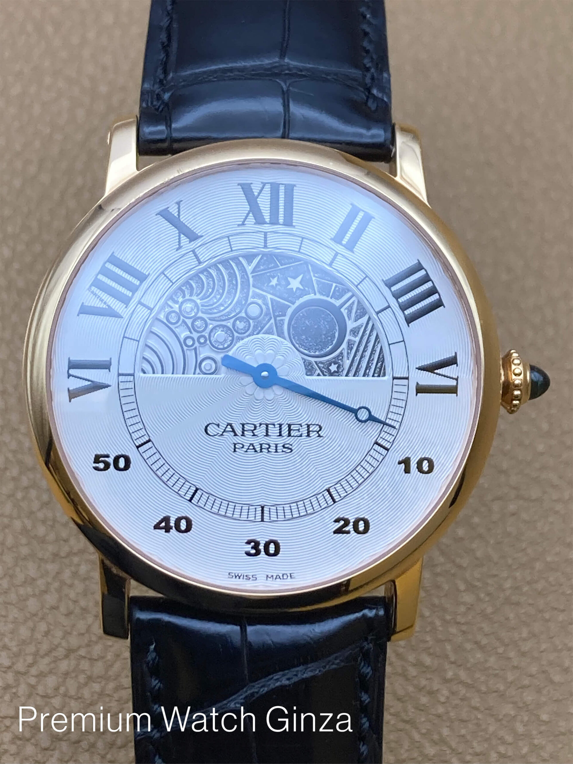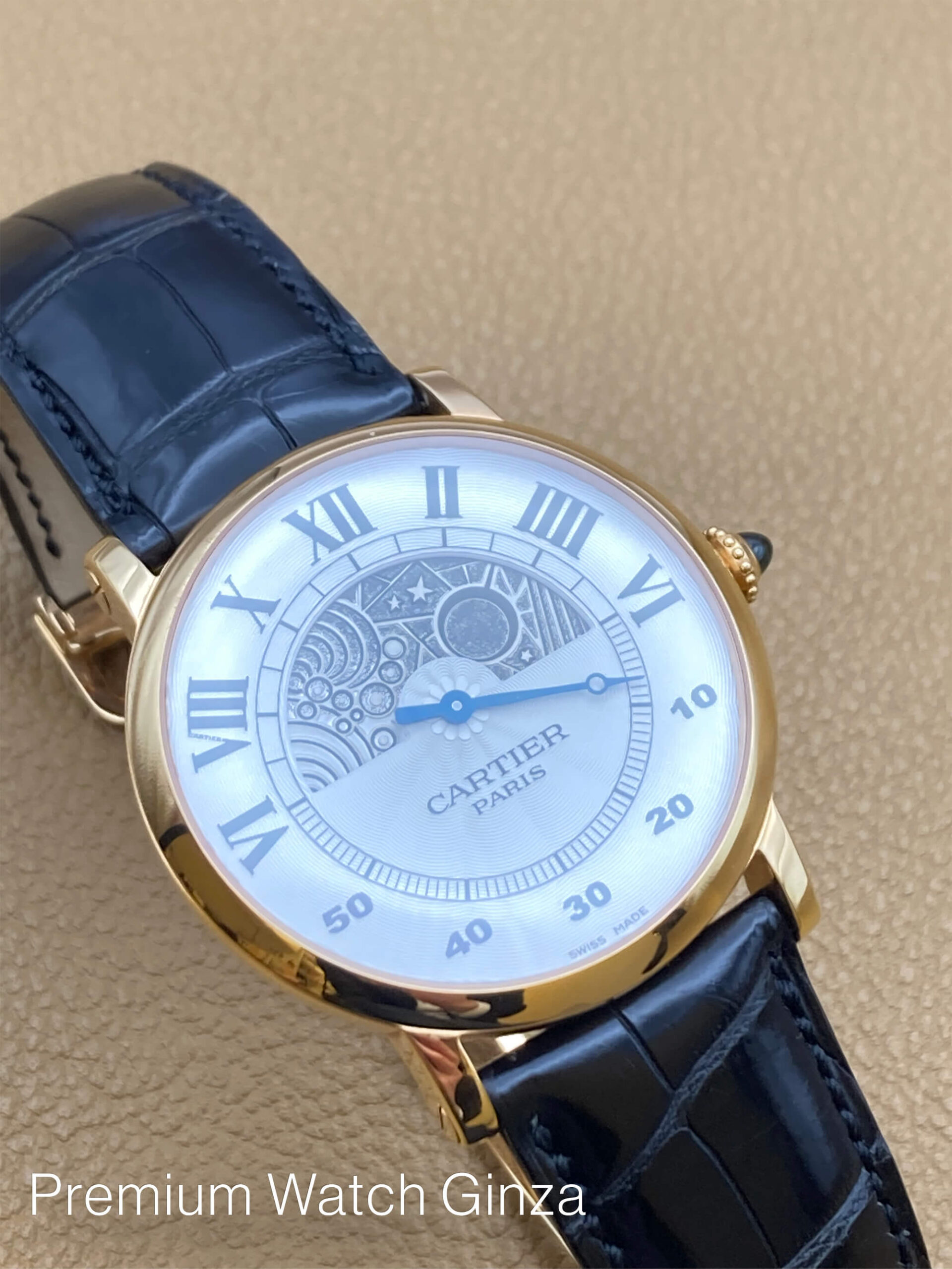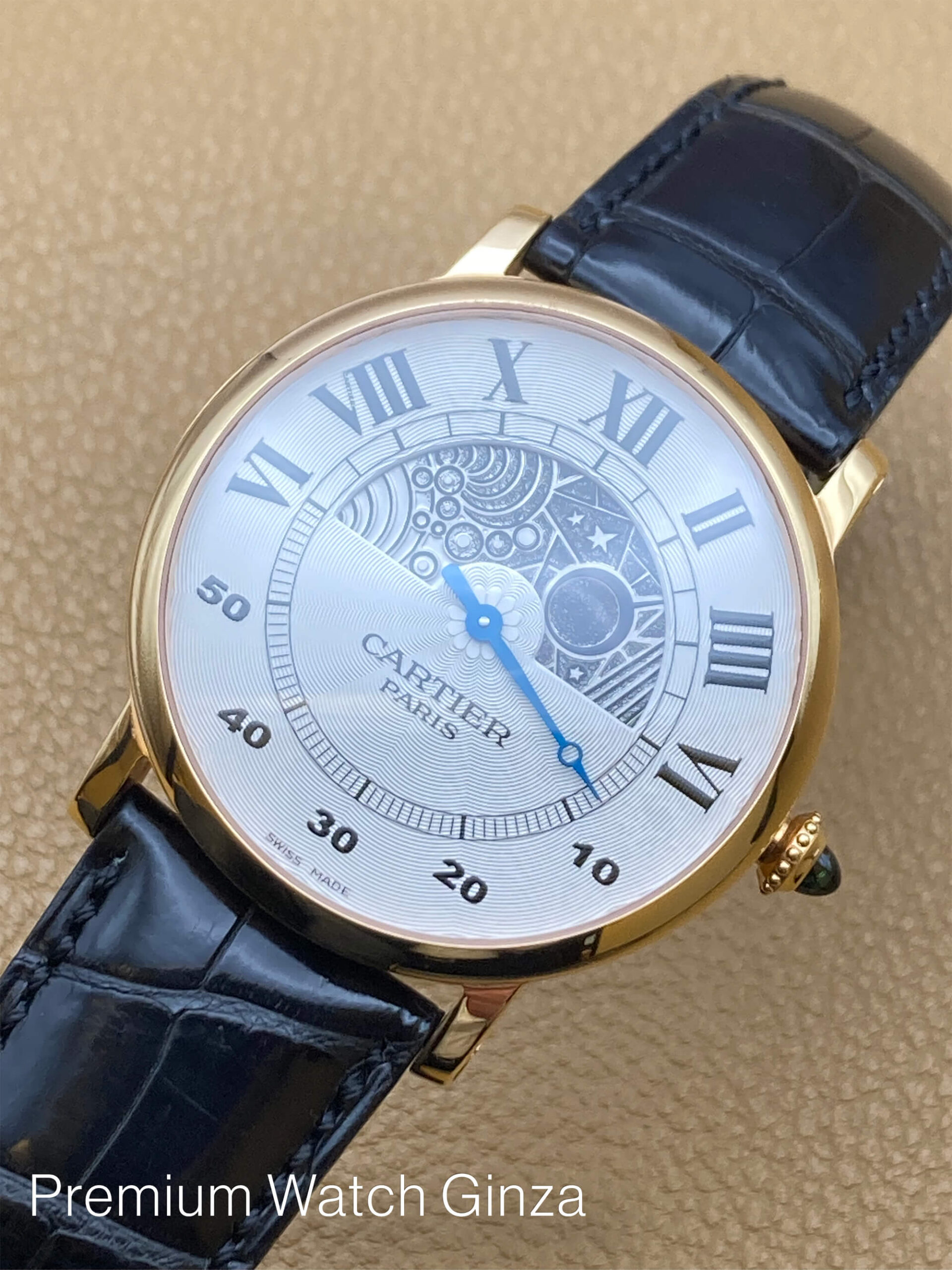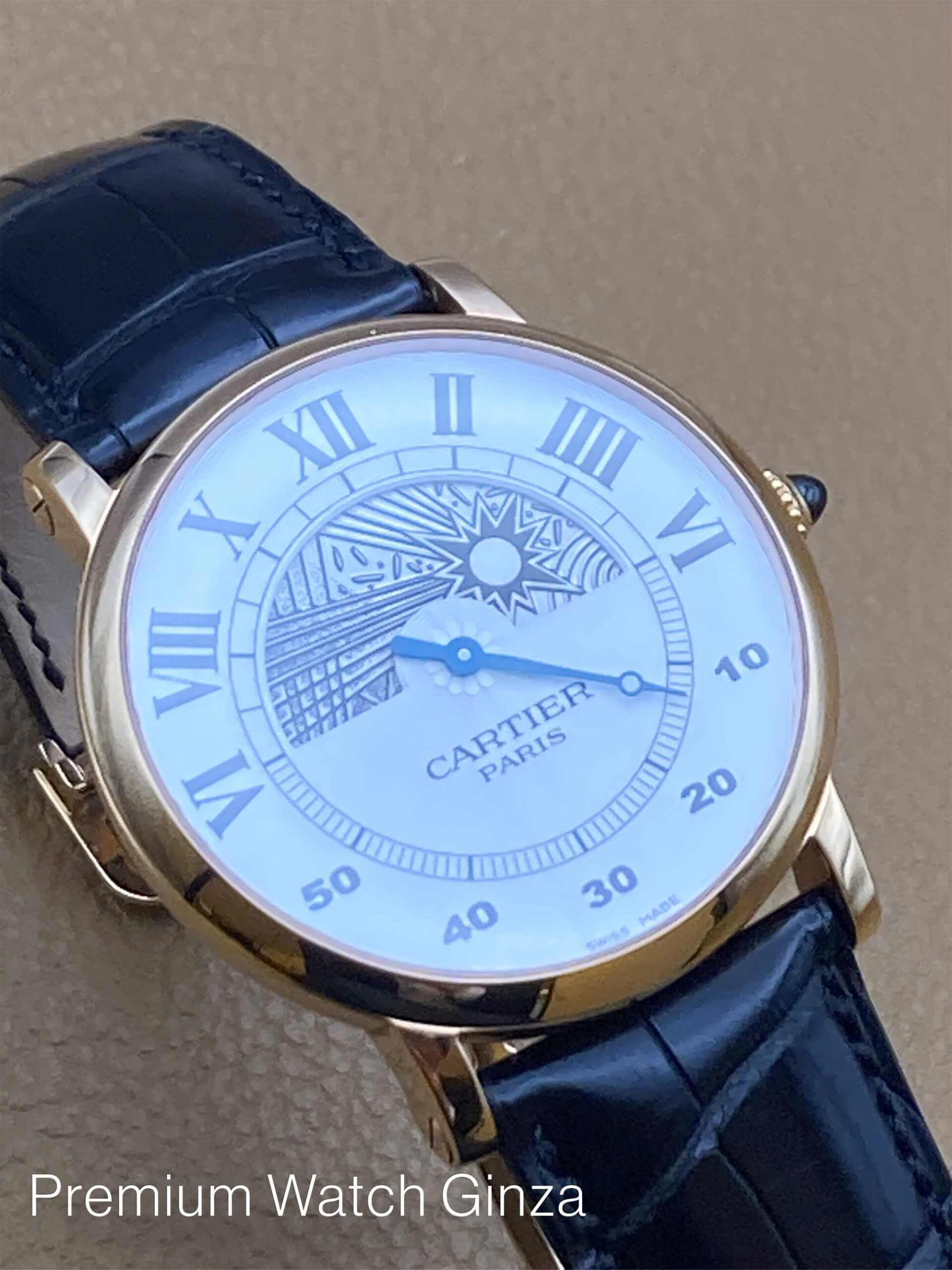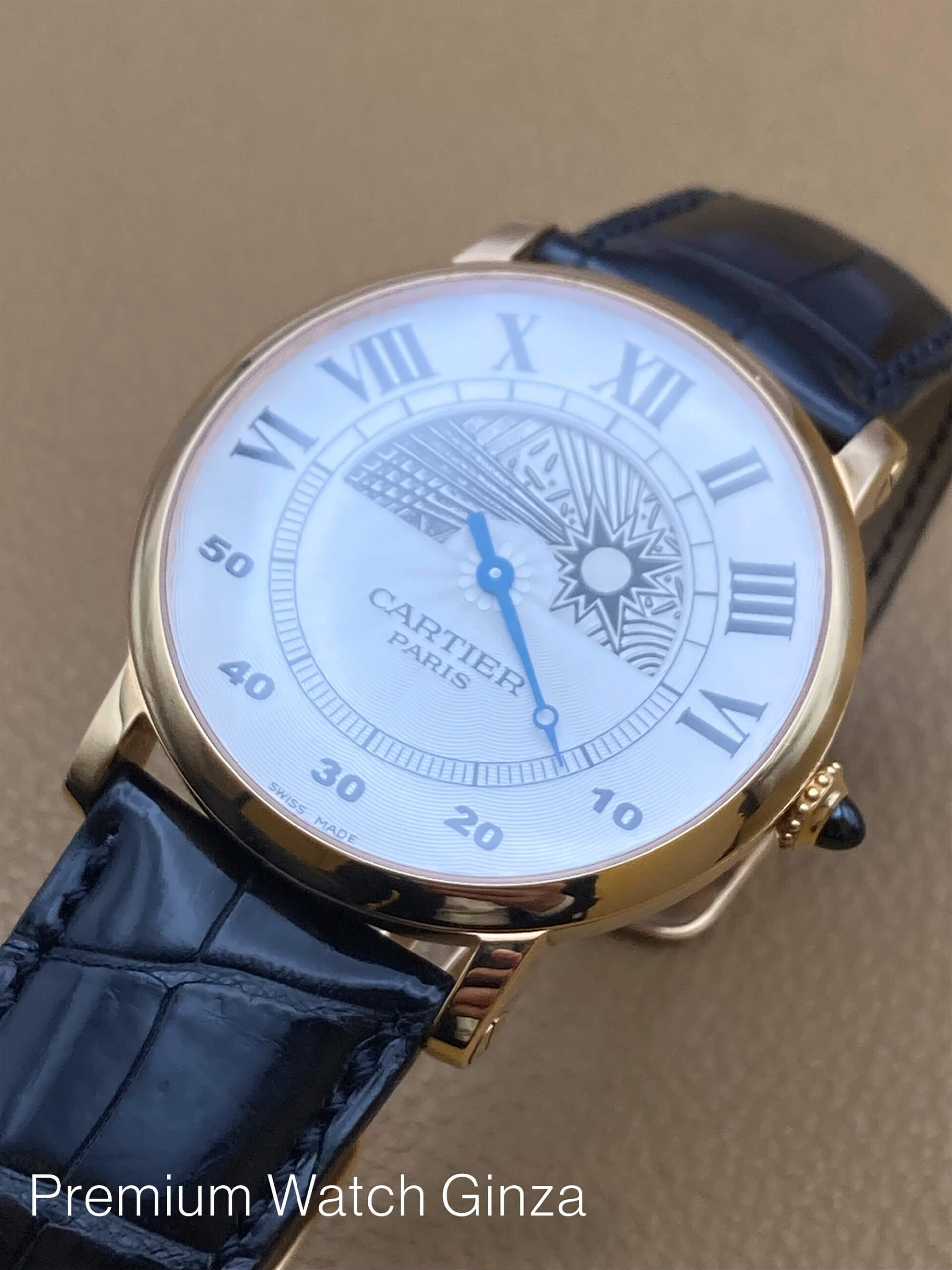 ロトンド ドゥ カルティエ CPCP Rotonde Jour Et Nuit 1998年から2008年までの約10年間の限定製作されたCPCP(コレクションプリヴェカルティエパリ)にてCal.9903MCのJLC製マニュファクチュールムーブを使用したモデル 2009年からは巨大な新工房にてHHコレクション(オート・オルロジュリー)と変わり、体制が大きく変わる前の少量生産されていたCPCP 特徴は100%機械式構造のみに拘って製作されております。 CPCPコレクションモデルはCARTIERロゴの下に“PARIS”が入るのが特徴でございまして、同社を象徴するデザインコードであるローマンインデックスと 自社工房の高温の窯で焼き上げた青焼き針(ブルースチール)、流麗なギョウシェ装飾を施された文字盤 本モデルは非常にユニークな時刻表示方式のレトログラード仕様の時分表示で、上半分が時針とデイ&ナイトの兼用で、 半円を午前6時か午後6時で起点にしております。 下半分が分針でジャンピングミニッツ仕様になっておりまして、それぞれアワー及びミニッツトラック上にて表示しております。 デザイナーの遊び心のみで構成された様な唯一無二の既成概念を覆したモデルでございます。 生産終了品 |