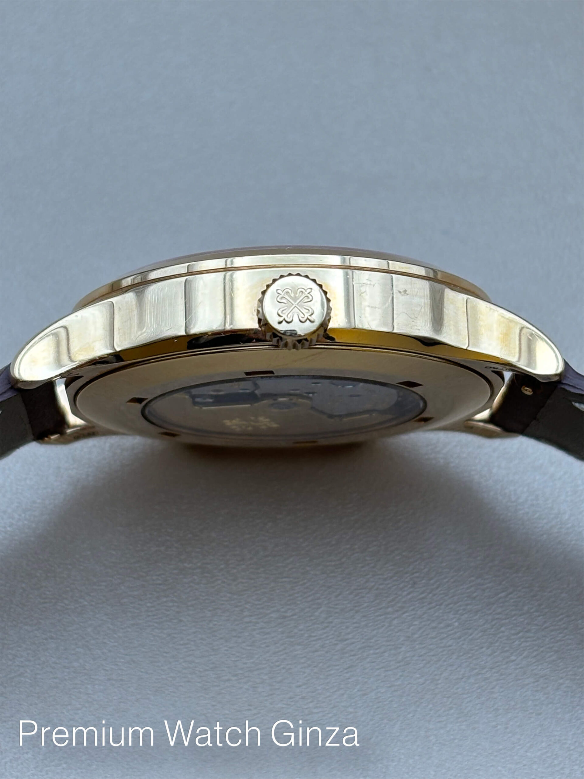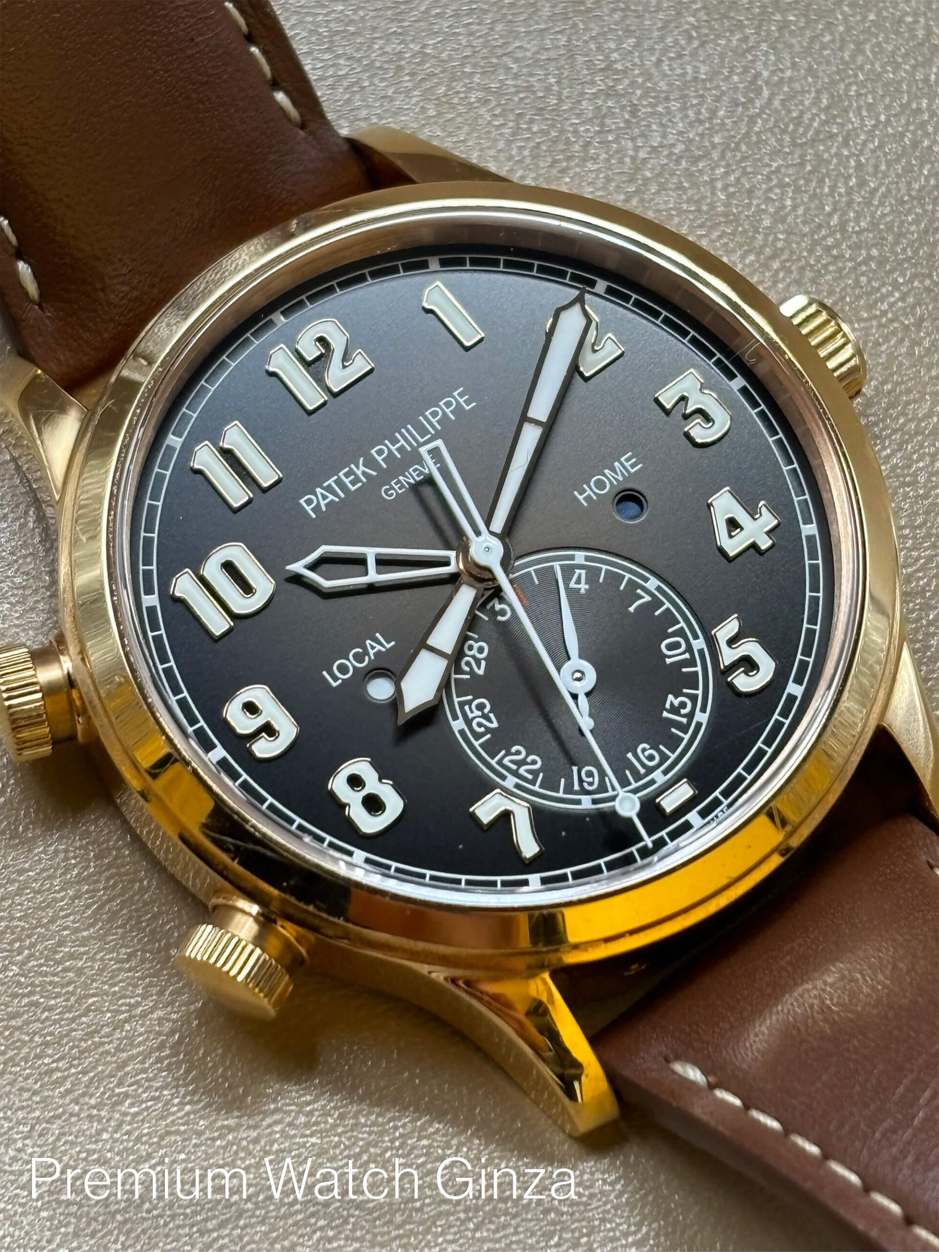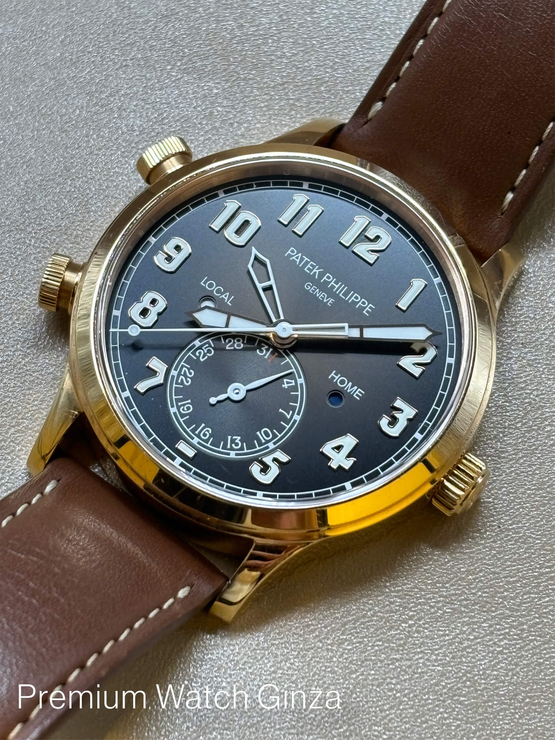 Ref.5524R-001 Calatrava Pilot Travel Time 2015年に発表されたパイロットトラベルタイムが、2018年に男女ペアモデルとしてK18RG製で追加リリースされました。 モデル名の頭に“カラトラバ”と入っている通り、属性としてはカラトラバの系譜でございまして、ルーツは1957年に製造されたRef.2597HSで、 トラベルタイムとしての歴史は長く、2本の時針(短針)を同軸上に重ねて、一見、シンプルな2針カラトラバの様に使用可能で、適宜で1本の時針を第2タイムゾーン針として、 10時位置、8時位置の切り替えボタンで1時間ずつ切り替えて設定するシステムは半世紀以上前から発明されておりました。近年のRef5134まで手巻きモデルとして製造されてきて、 クラシックスタイルのカラトラバの意匠を踏襲したモデルでございましたが、 2011年のアクアノート・トラベルタイムの発表を機にラグジュアリーカジュアルなスポーツ仕様として、ブレイク致しました。 アクティブ仕様へと進化した点は日付表示が追加され、秀逸なのは2つの丸形小窓のデイ&ナイト表示でございます。 これまでの午前と午後の表示は24時間表示のインダイアル仕様でしたが、時間帯をポップな色で分ける手法で白(6:00~17:59)、濃紺(18:00~5:59)と明確な2種に分類する事で、 視認性の向上と機械構造の省スペース化にもなり、更にHOMEとLOCALのそれぞれの時針と連動してデイ&ナイトもHOMEとLOCALの2種類を設ける事で非の打ち所がない完成度となりました。 2024年現在も派生モデルとして多数の関連モデルが発表されている点からみても市場評価の高い機構でございます。 |