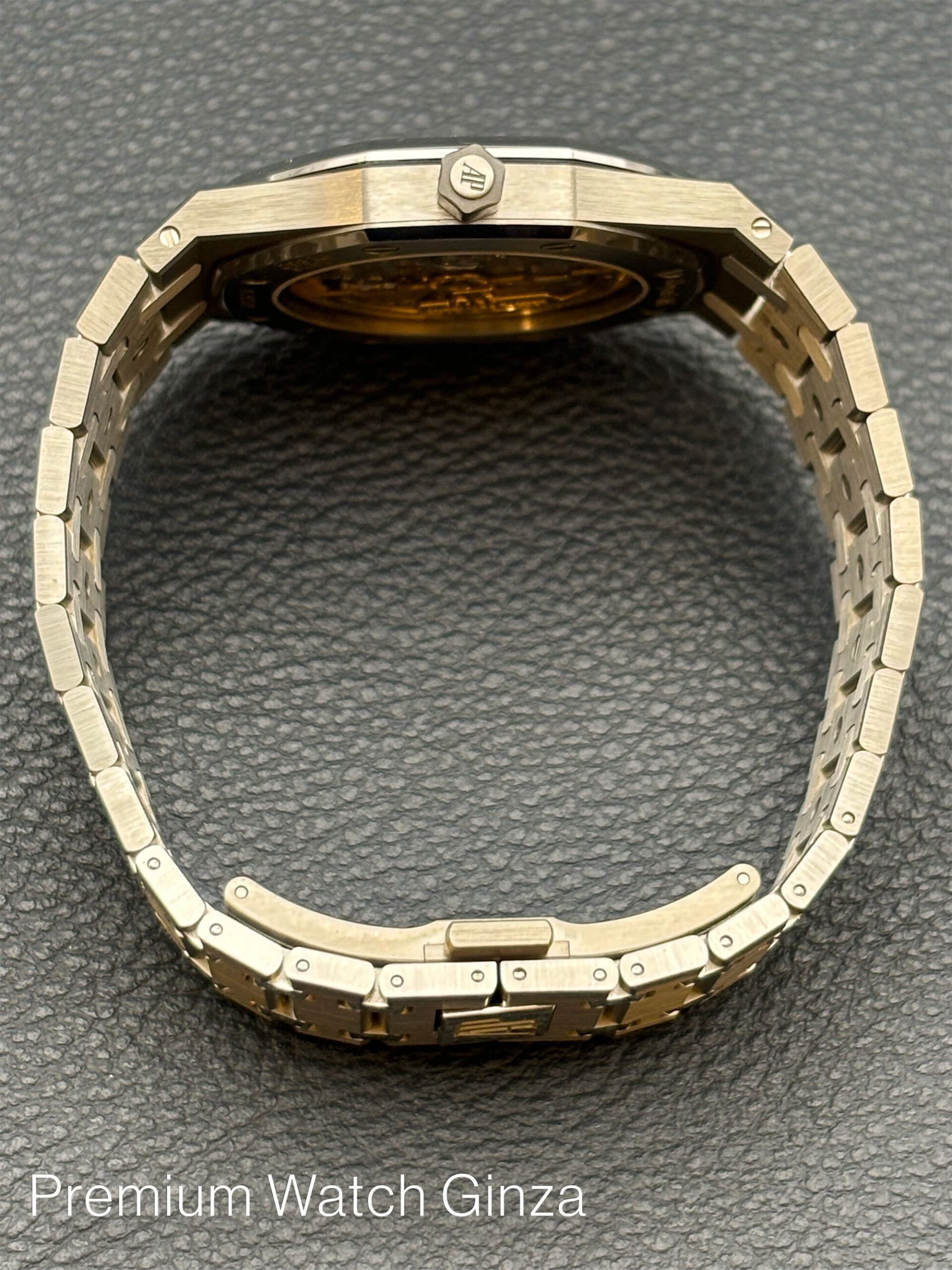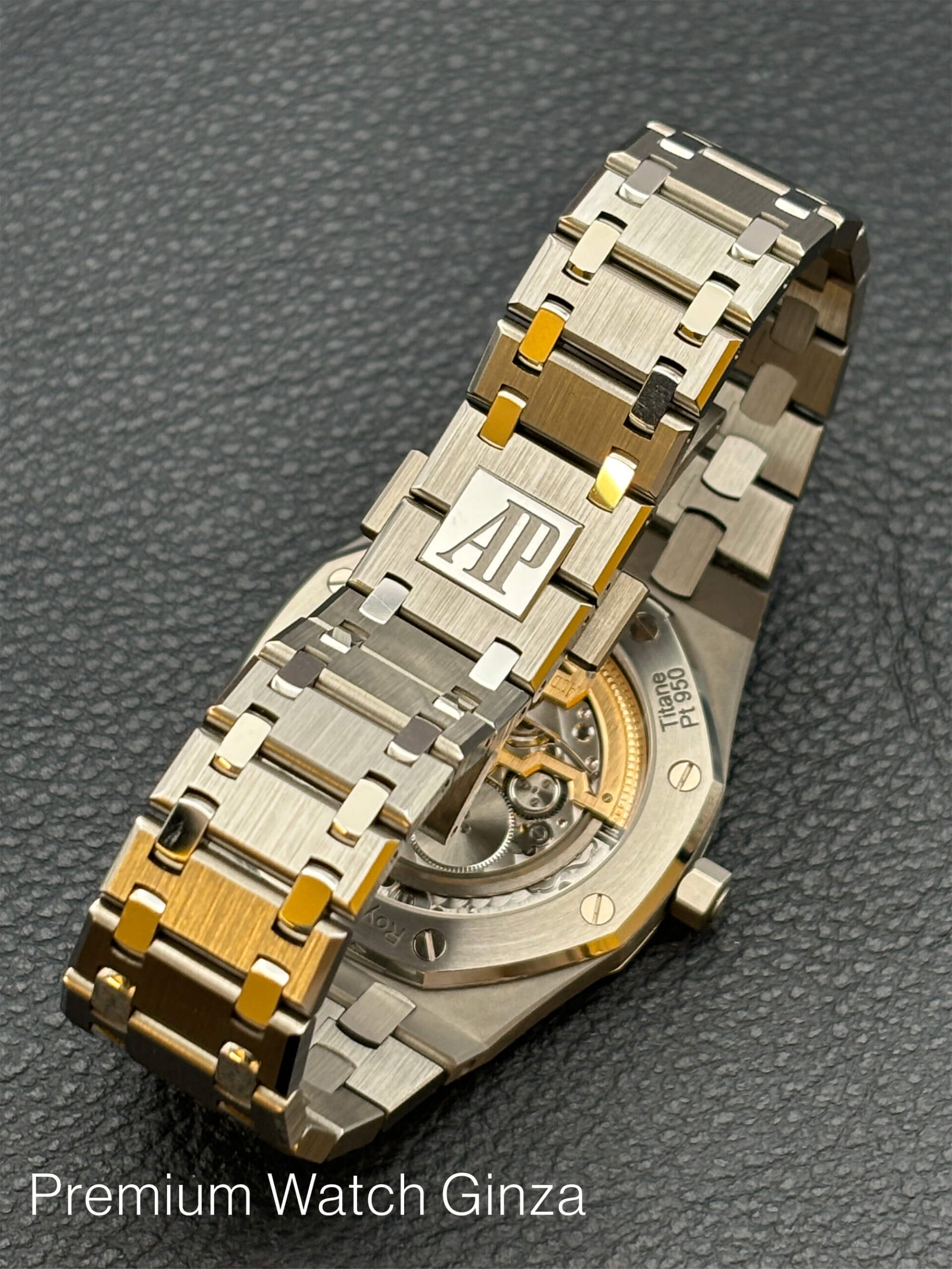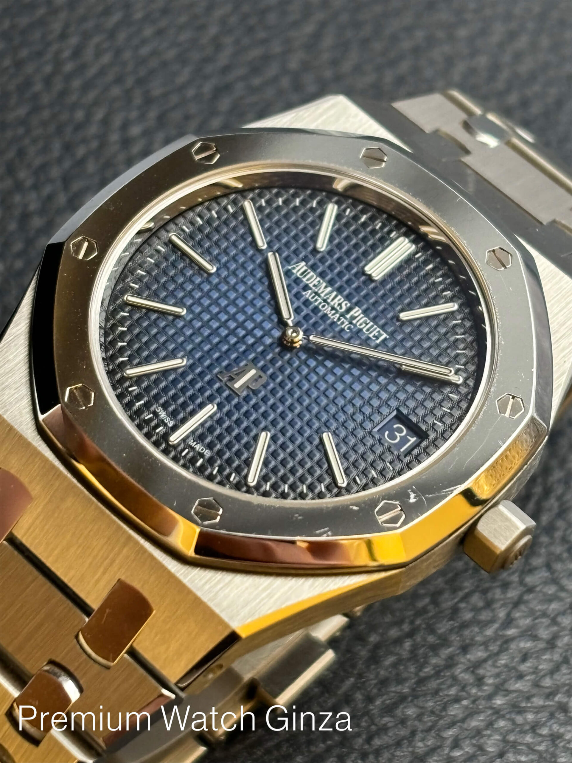 Ref.15202IP.OO.1240IP.01 Royal Oak “JUMBO”Extra-thin Btq Limited 250pcs ラグジュアリースポーツウォッチの元祖でございます初代ロイヤルオーク「Ref.5402」通称ジャンボの復刻モデルとして絶大な人気を誇る「15202」ロイヤルオークエクストラシン。 1972年の5402発表から生誕40周年を記念して2012年に発表されてから、現在まで入手困難なモデルとしても知られております。 そんな人気モデルのエクストラシンの250本ブティック限定モデルとして2018年に発表されましたのが「15202IP」でございます。 ケース及びブレスレットには美しいヘアライン仕上げが施された軽量なチタン素材を採用し、ベゼル及びコマのリンクには美しくポリッシュされたプラチナ素材を採用した特別仕様のロイヤルオーク エクストラシンとなってございます。 チタン素材特有の若干黒っぽさのある深い色味とプラチナの輝きが絶妙なコントラストを奏でる外装となってございます。 文字盤カラーもレギュラーモデルとは違った「スモークブルーダイヤル」で、内側の深いブルーから外周にかけてブラックにグラデーションする限定モデルならではのタペストリー文字盤でございます。 搭載するムーヴメントは時計史に残る薄型自動巻の「Cal.2121」。 復刻モデルらしくオリジナル「Ref.5402」と同じムーヴメントを採用しています。 最盛期の設計をサファイアクリスタルケースバックで楽しむだけでなく薄型ムーヴメントの恩恵とチタン素材の軽さやプラチナベゼルの心地よい重さも手伝い素晴らしい装着感を味わうことが可能です。 生産終了品 |