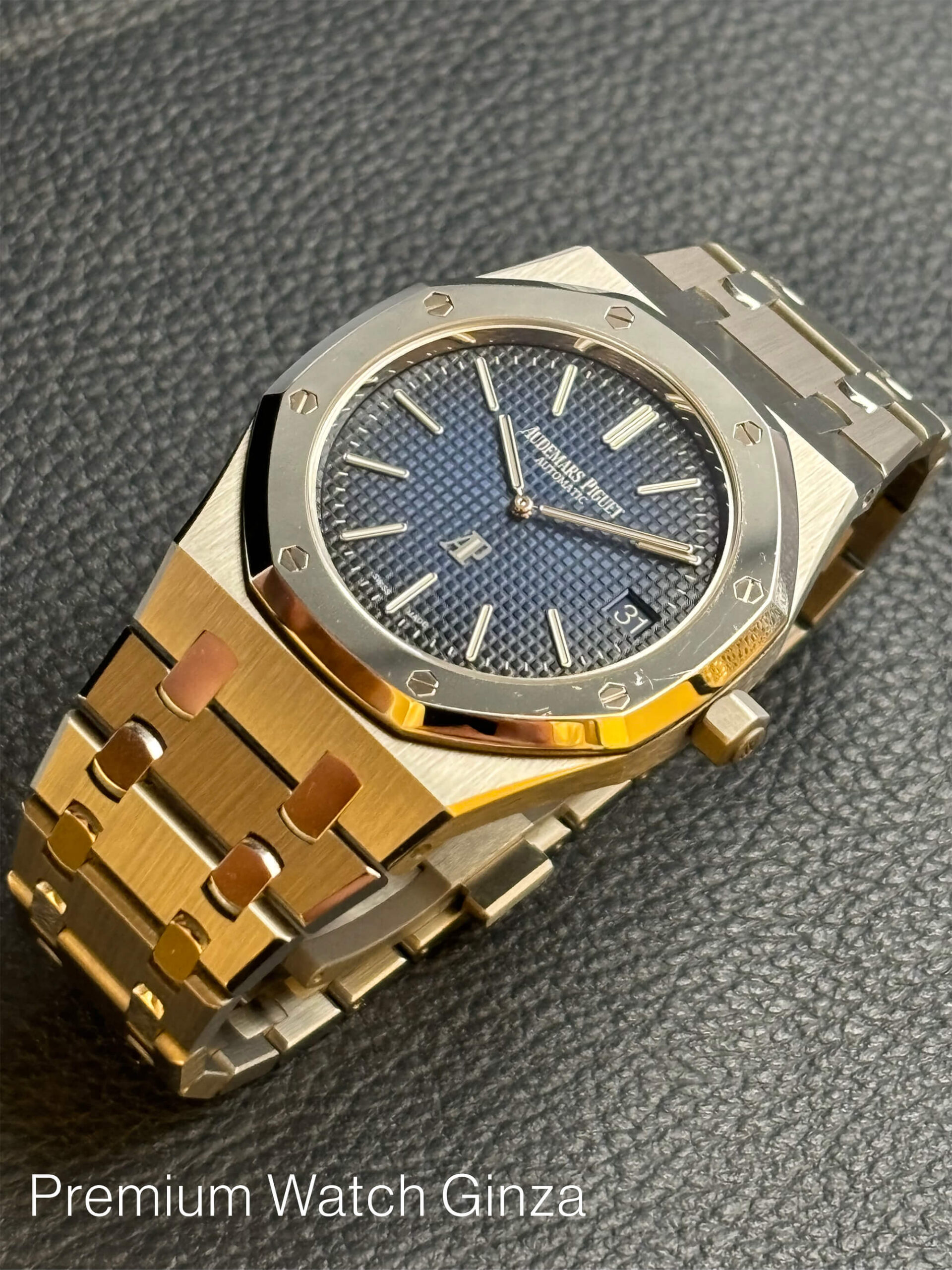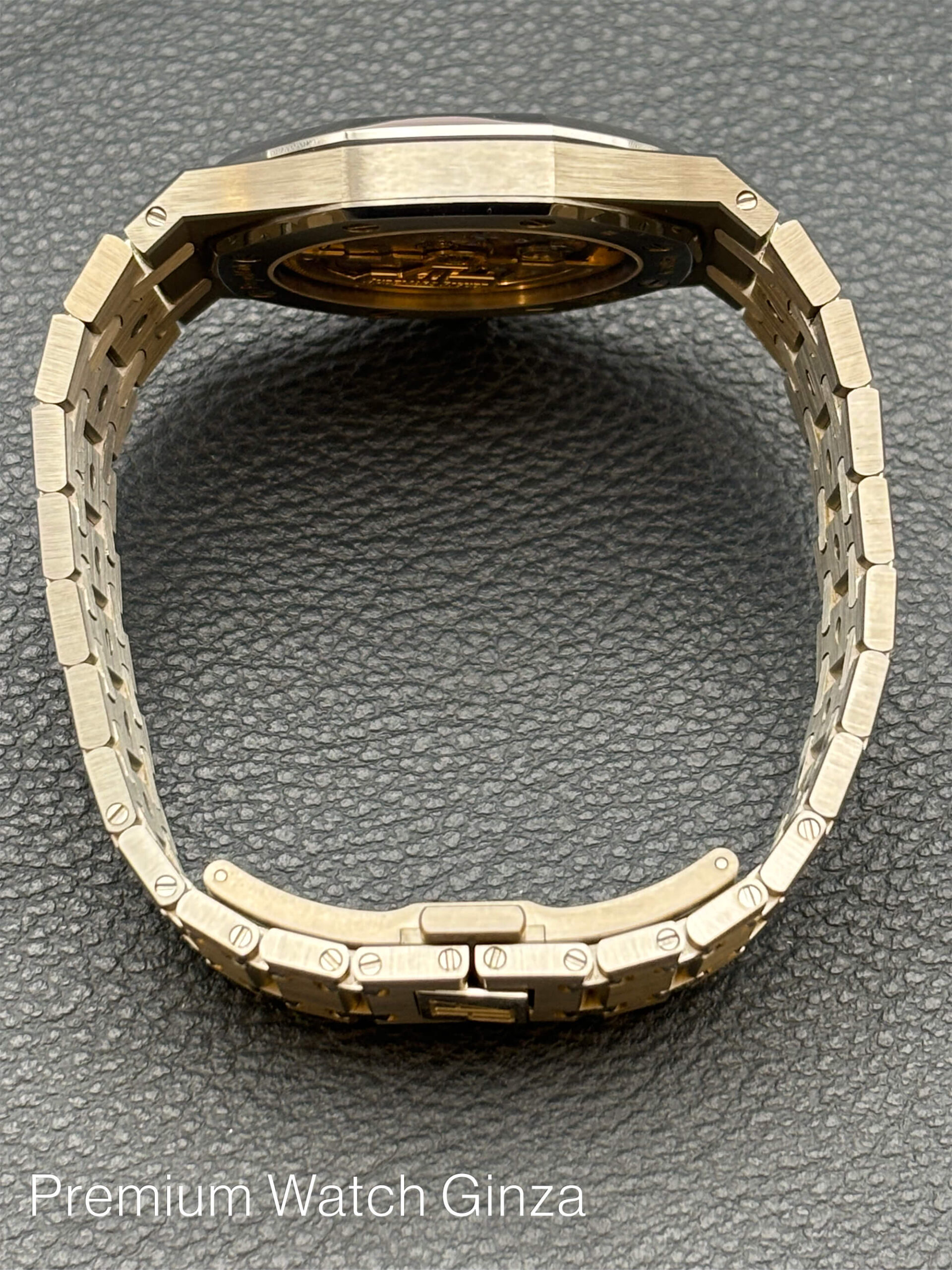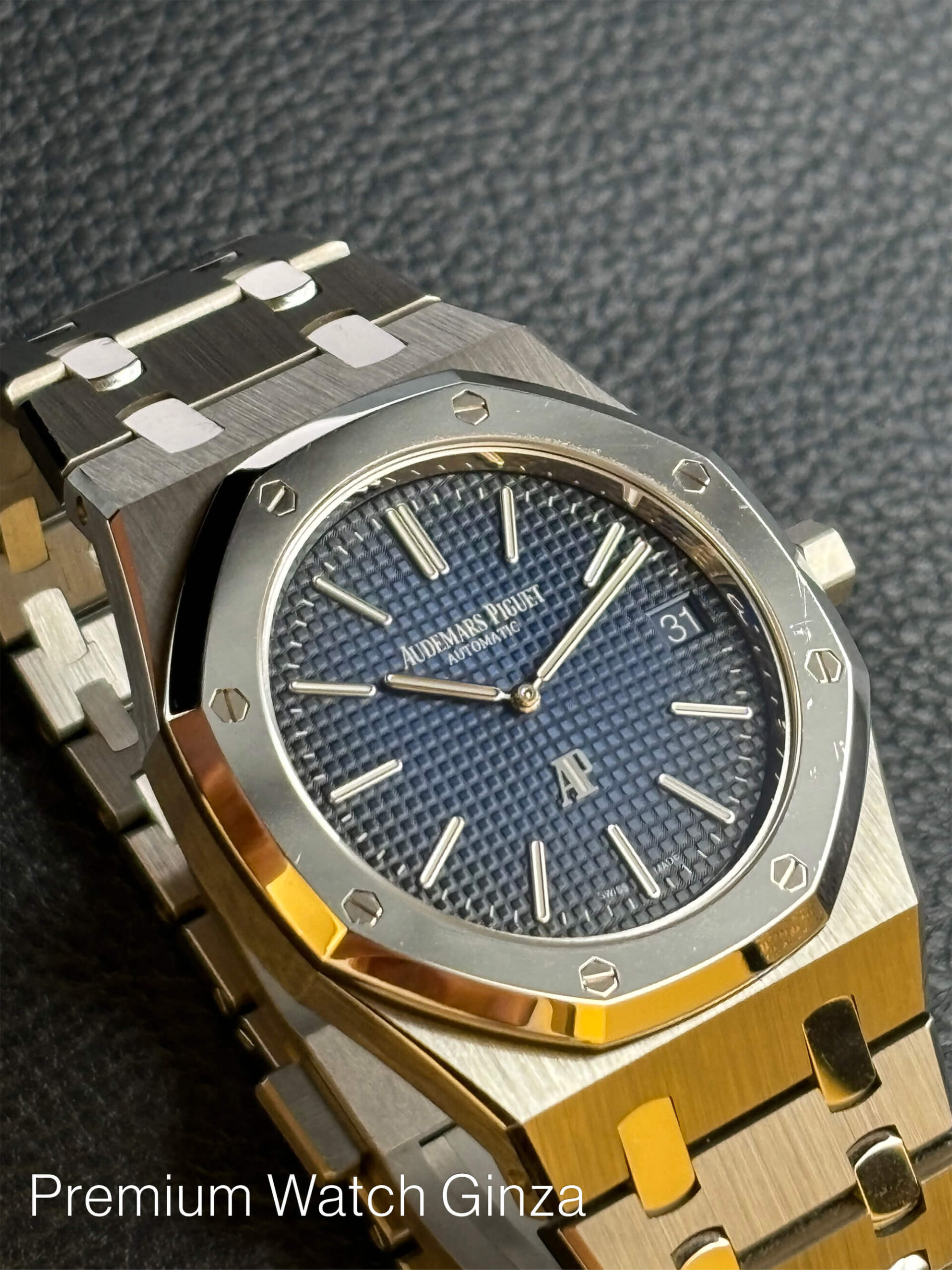 Ref.15202IP.OO.1240IP.01 Royal Oak “JUMBO”Extra-thin Btq Limited 250pcs ラグジュアリースポーツウォッチの元祖でございます初代ロイヤルオーク「Ref.5402」通称ジャンボの復刻モデルとして絶大な人気を誇る「15202」ロイヤルオークエクストラシン。 1972年の5402発表から生誕40周年を記念して2012年に発表されてから、現在まで入手困難なモデルとしても知られております。 そんな人気モデルのエクストラシンの250本ブティック限定モデルとして2018年に発表されましたのが「15202IP」でございます。 ケース及びブレスレットには美しいヘアライン仕上げが施された軽量なチタン素材を採用し、ベゼル及びコマのリンクには美しくポリッシュされたプラチナ素材を採用した特別仕様のロイヤルオーク エクストラシンとなってございます。 チタン素材特有の若干黒っぽさのある深い色味とプラチナの輝きが絶妙なコントラストを奏でる外装となってございます。 文字盤カラーもレギュラーモデルとは違った「スモークブルーダイヤル」で、内側の深いブルーから外周にかけてブラックにグラデーションする限定モデルならではのタペストリー文字盤でございます。 搭載するムーヴメントは時計史に残る薄型自動巻の「Cal.2121」。 復刻モデルらしくオリジナル「Ref.5402」と同じムーヴメントを採用しています。 最盛期の設計をサファイアクリスタルケースバックで楽しむだけでなく薄型ムーヴメントの恩恵とチタン素材の軽さやプラチナベゼルの心地よい重さも手伝い素晴らしい装着感を味わうことが可能です。 生産終了品 |