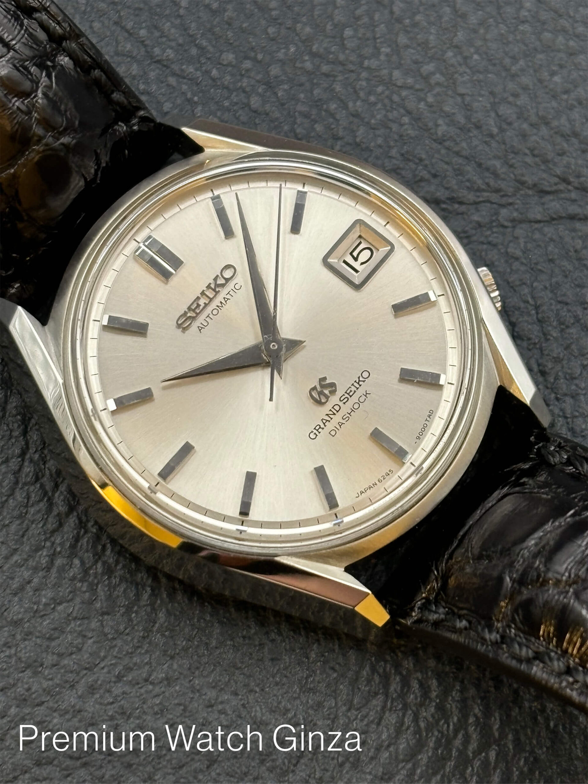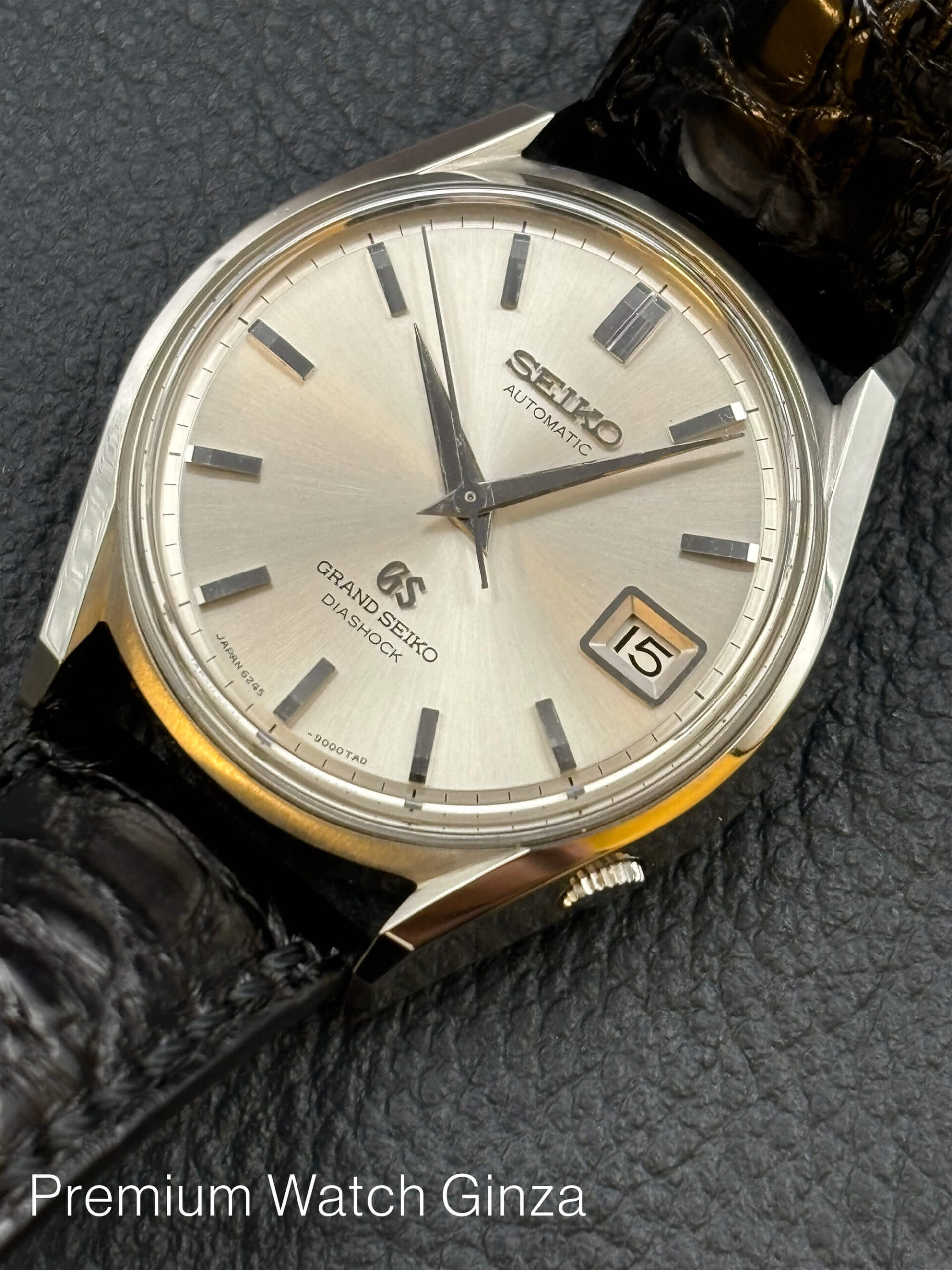Ref.FV62001 62GS(1967年製ビンテージ) グランドセイコー初の自動巻モデル、通称「62GS」です。62GSは製造期間が約一年と極端に短いモデルですが、本モデルは復刻モデルではなく、1967年製の個体をメーカーでレストアした再販売品でございます。 ケースバックのメダリオンは希少な初期の獅子メダルでございます。ケースは流線型のシェイプが美しい意匠で、自動巻機構によりリューズ操作が少なくなったため、4時位置に配しスタイリッシュなデザインとなっております。 ダイアルはシルバーのサンレイ、文字盤外周は一段下がり手が込んでいます。バーインデックスは上面に鏡面仕上げが施されたもので、外側にはカッティングを入れて立体感を出しています。 |