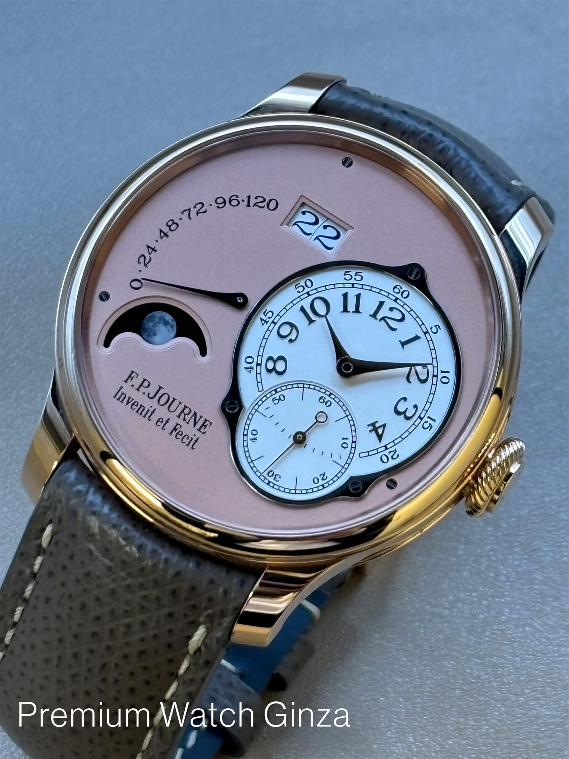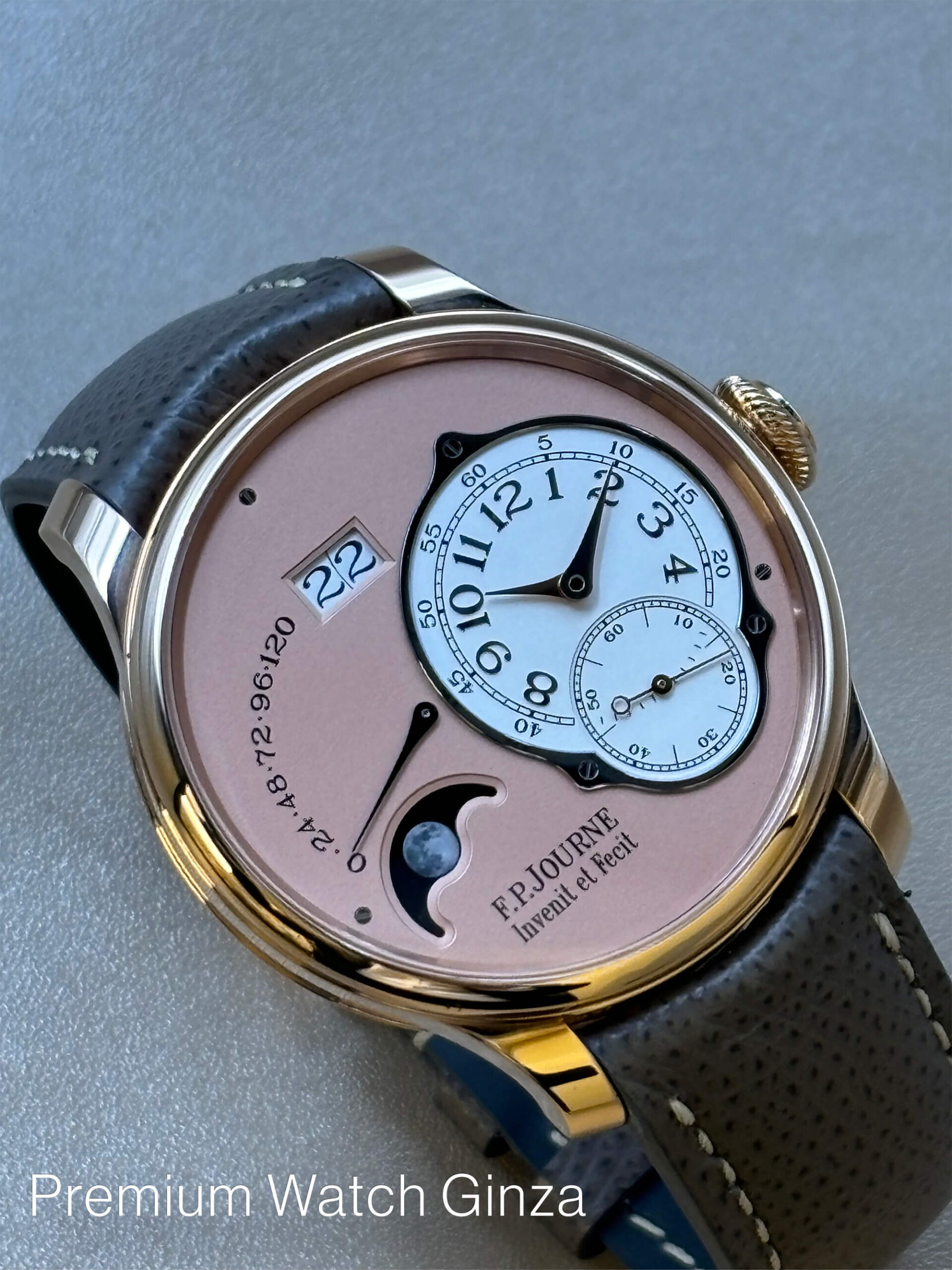 Octa Lune F.P.ジュルヌ オクタ ルナ Octaコレクションは2004年から製作している同メゾンの自動巻き機構の基幹コレクションでございます。 搭載されている自動巻きcal.1300の自動巻きシステムは、3年間の開発期間を経て到達した僅かな動作でも 巻き上げ可能にするセラミック製のボールベアリングを採用した巻き上げ効率に非常に優れた機構で、 自動巻きでありながら、約120時間(5日間)の異例のロングパワーリザーブを実現しております。 18K6Nゴールド(濃いレッドゴールド)と18Kゴールドサーモンピンク文字盤には美しい18Kゴールドの ムーンフェイズディスクとブルースチール針の相性は抜群でございます。 オフセンターの時分針表示のサブダイアルにはギョウシェ彫りが施されております。 |