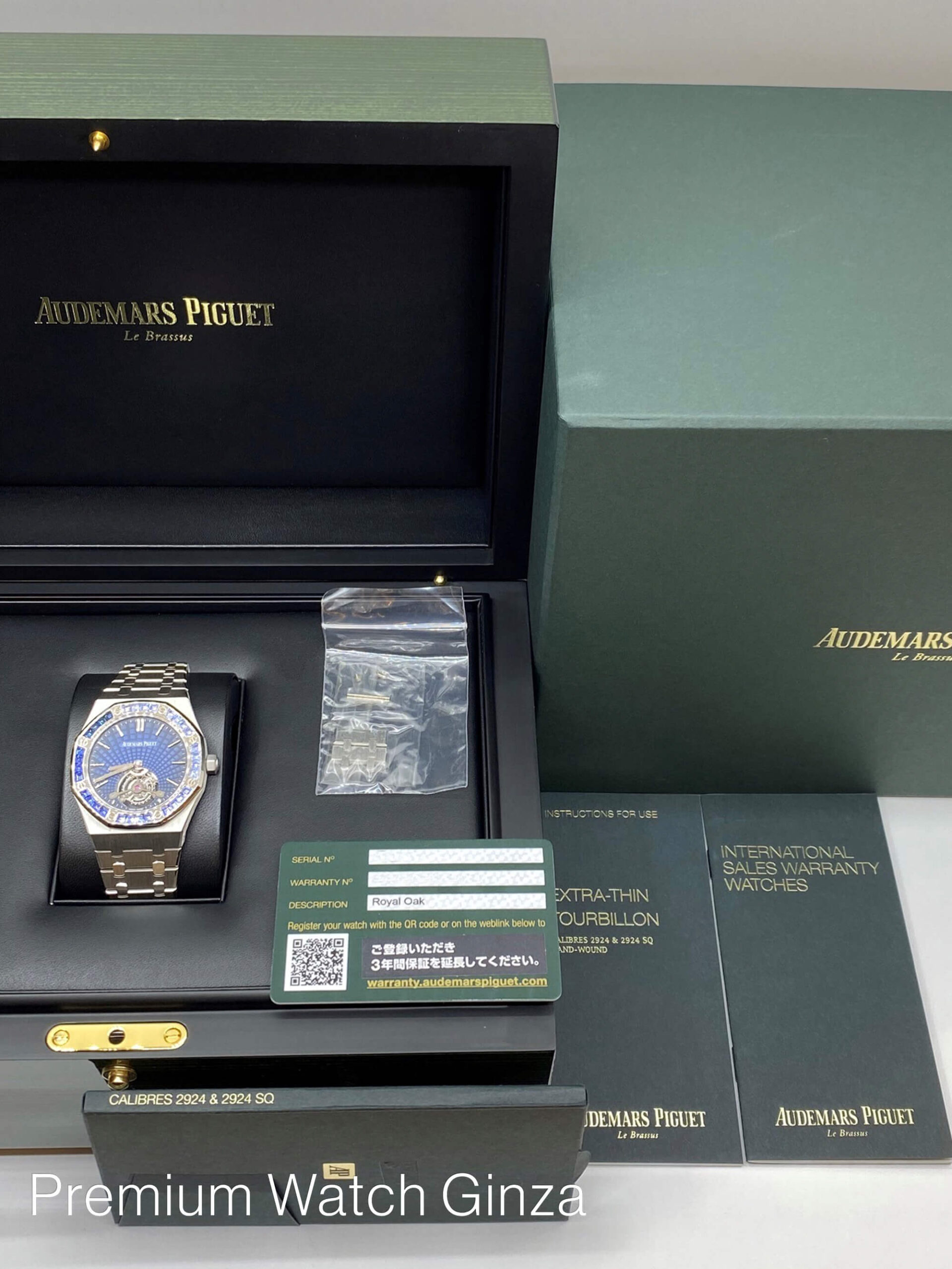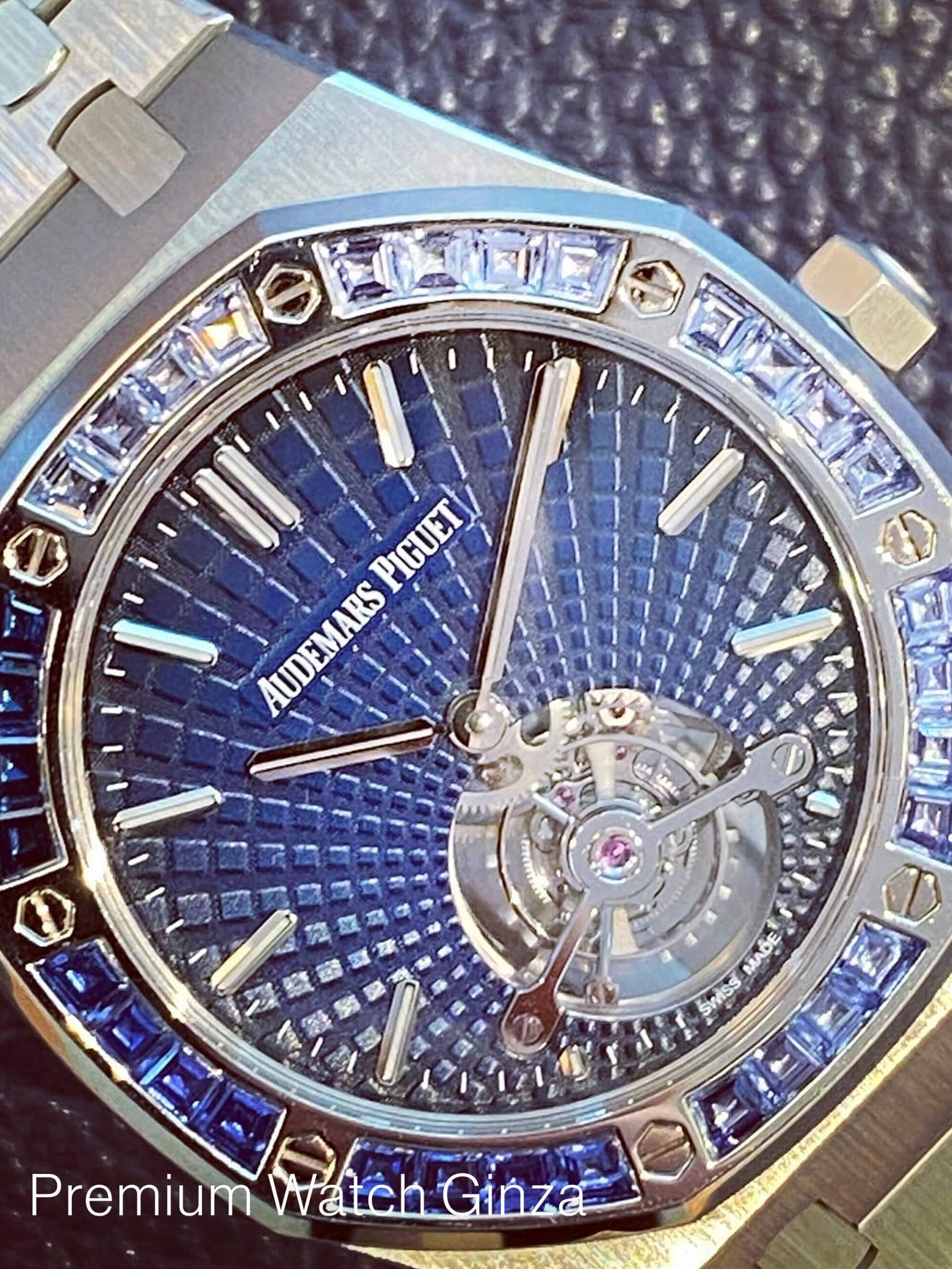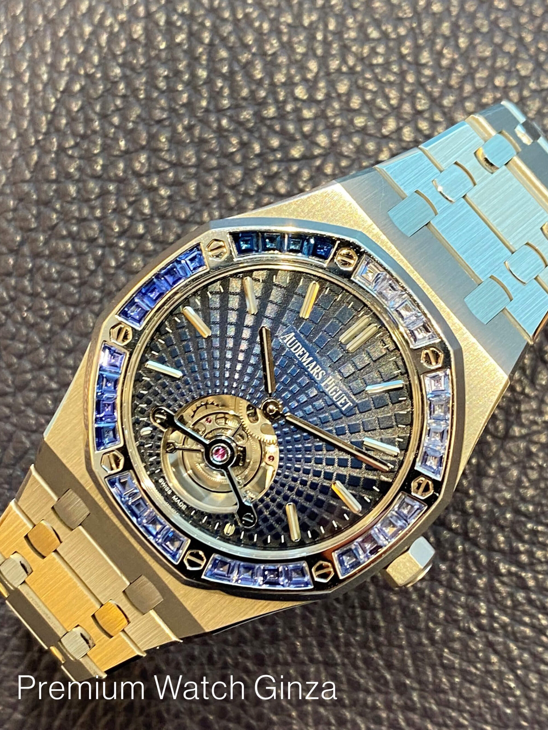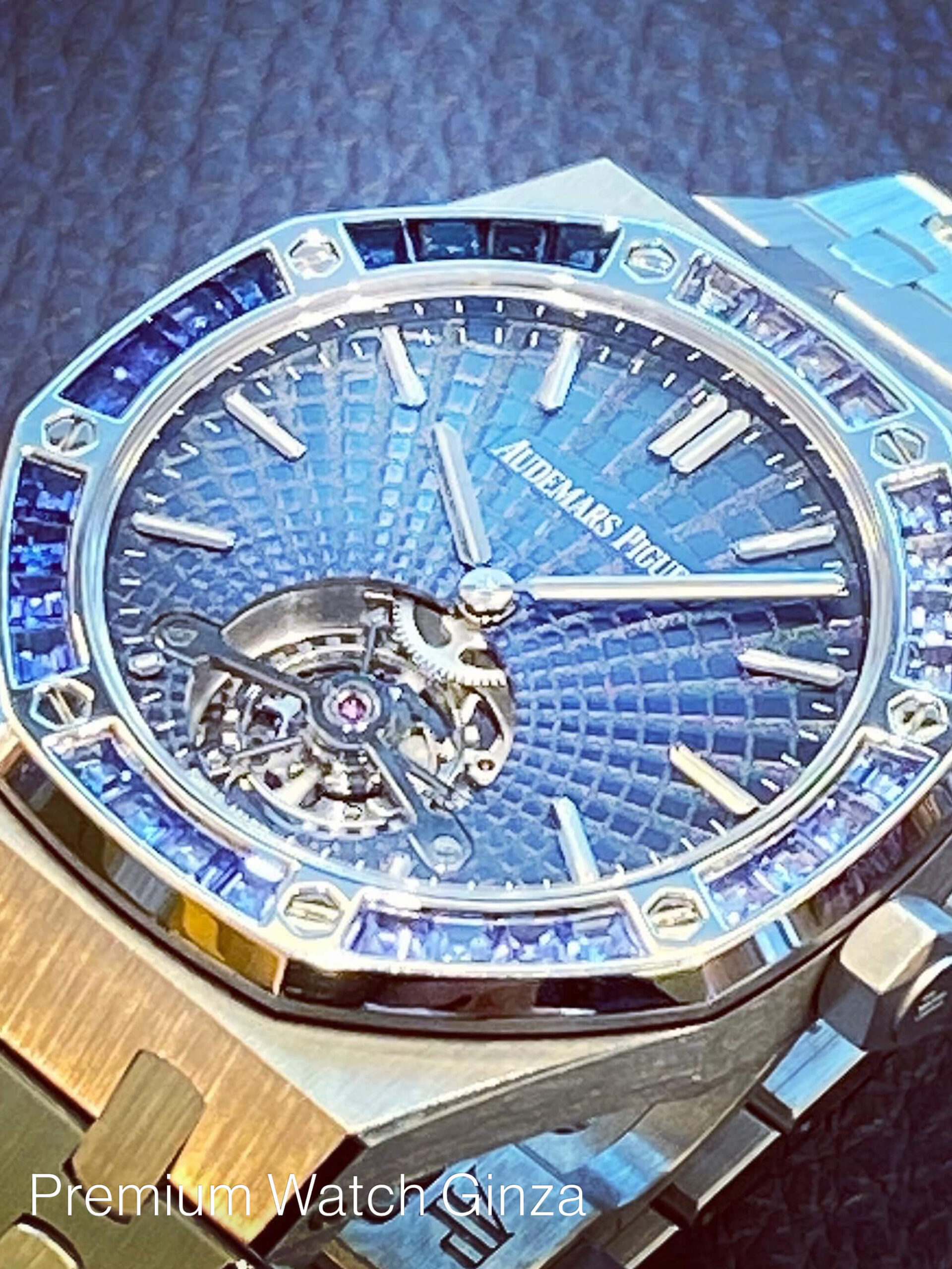 豪快で情熱的なトゥールビヨンとは対極的に濃淡を色分けされた上質なサファイアを根気よく買い集められた芸術的な意匠でございます。