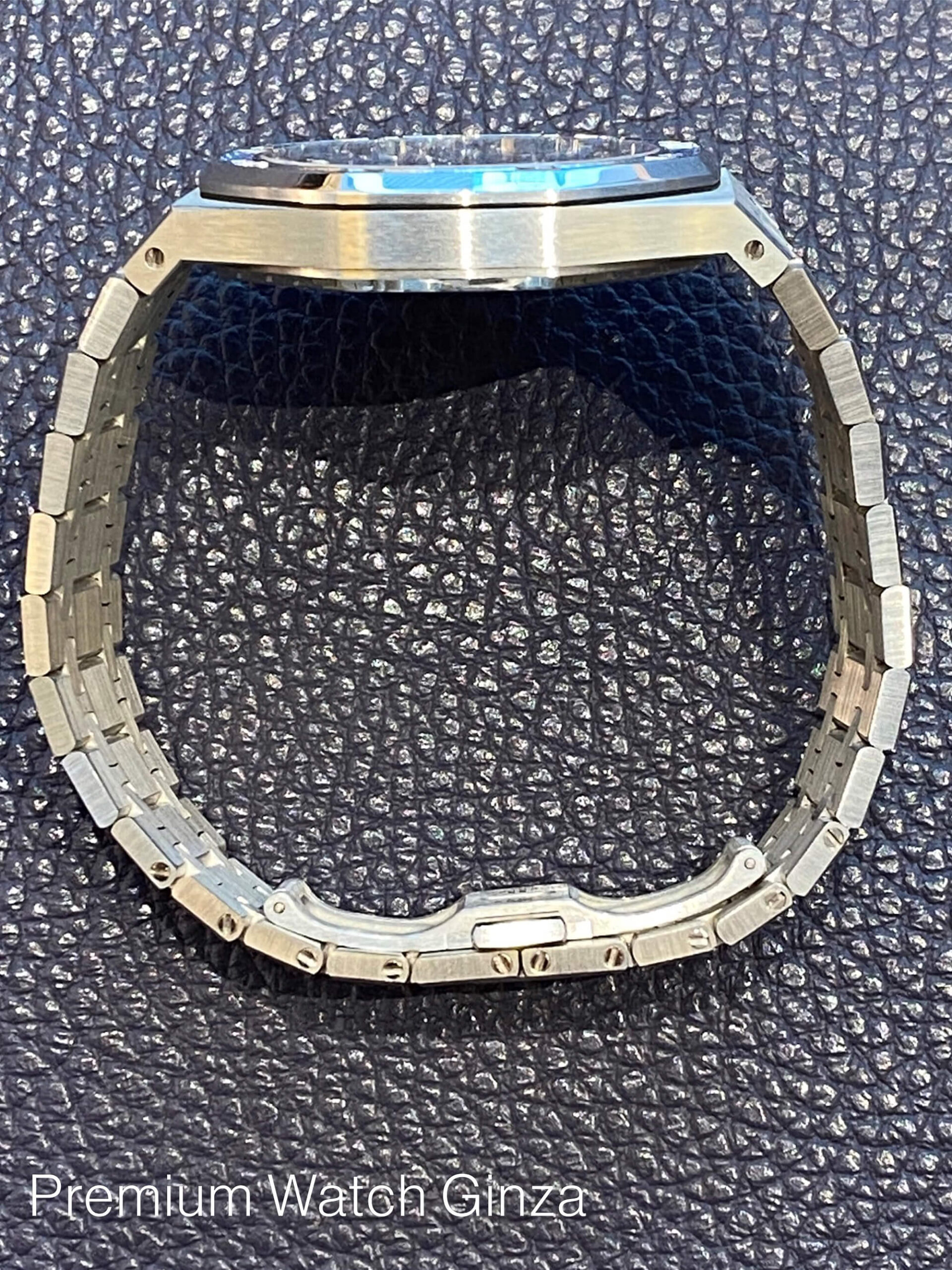 ロイヤルオーク文字盤といえば格子柄「グランドタペストリー」が定番でございますが、本モデルから採用された放射状に広がる情熱的な印象の「エヴォルーティブ・タペストリー」